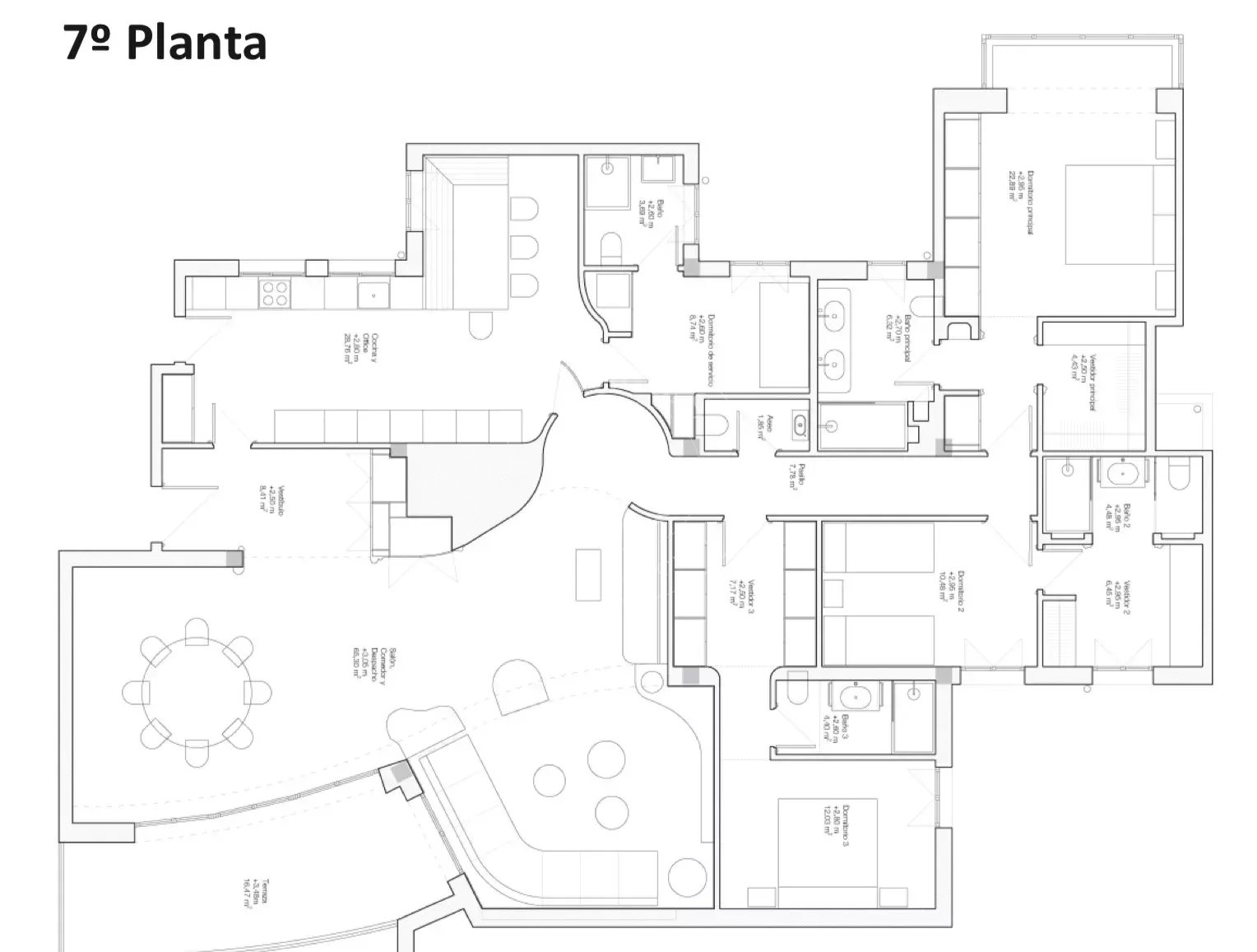 La zona de noche alberga tres dormitorios en suite, concebidos como espacios privados de gran confort, cada uno con su propio baño. El área de servicio dispone de un dormitorio independiente con baño, aportando funcionalidad adicional y discreción.