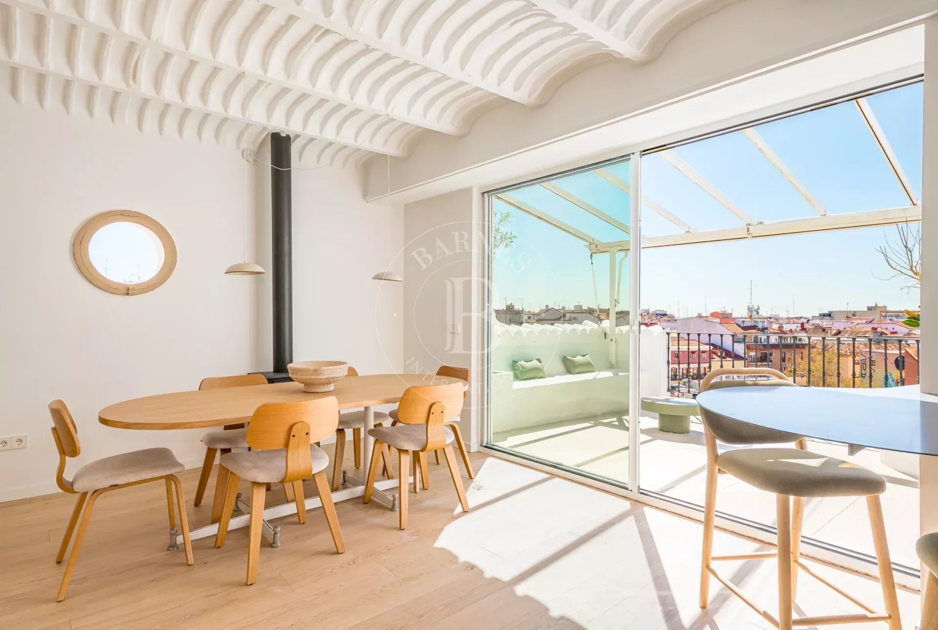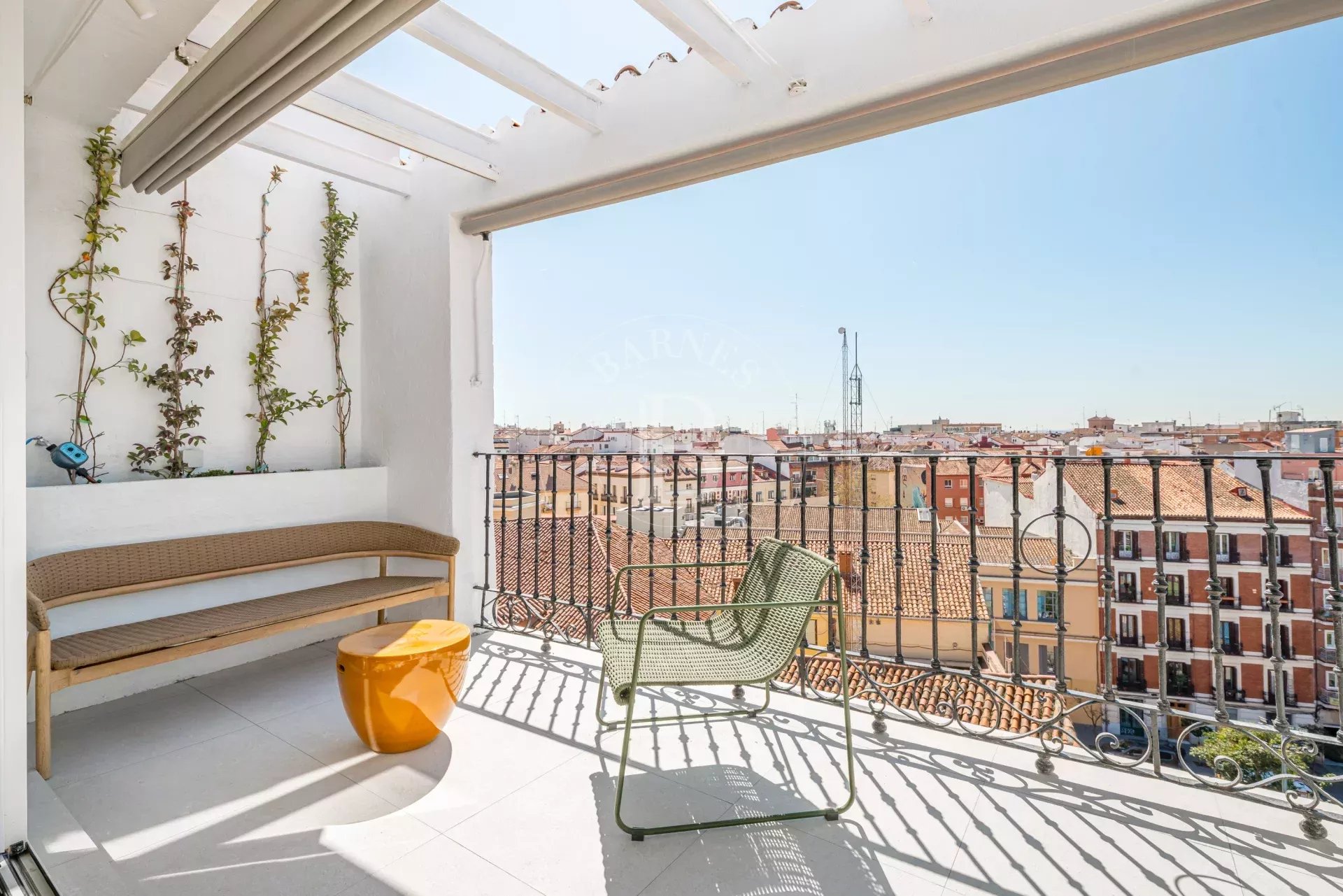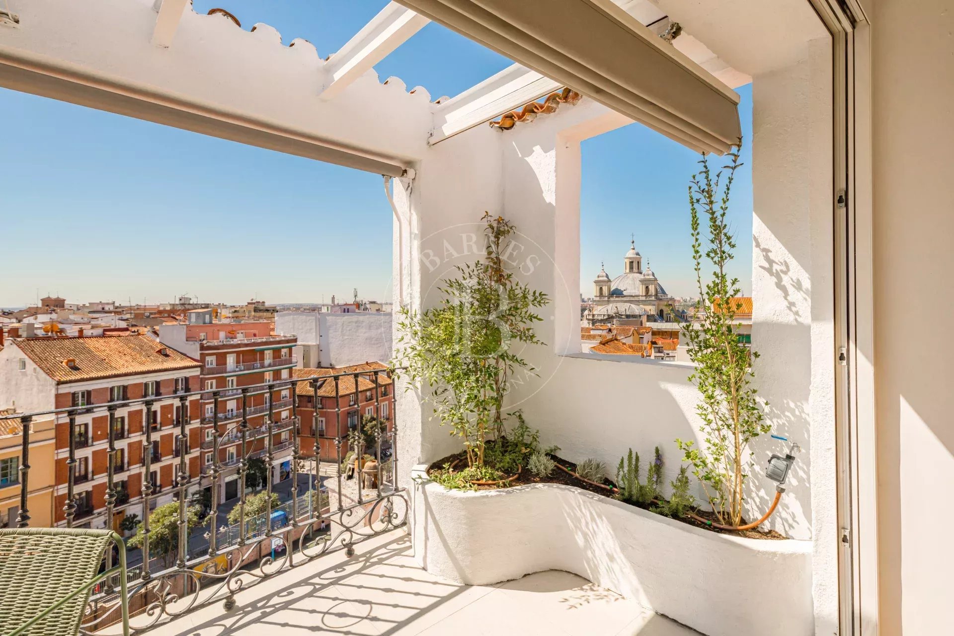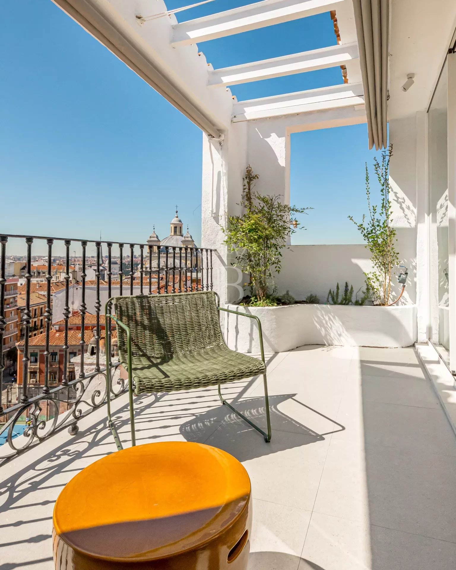 El ático ocupa la totalidad de la planta superior y destaca por su extraordinaria luminosidad y sus espectaculares vistas 360º sobre Madrid. Su orientación sur y los amplios ventanales conectan los espacios interiores con dos terrazas exteriores, desde las que se disfrutan vistas abiertas a las cúpulas madrileñas y al skyline urbano, ofreciendo una sensación de privacidad y privilegio excepcional en el corazón de la ciudad.