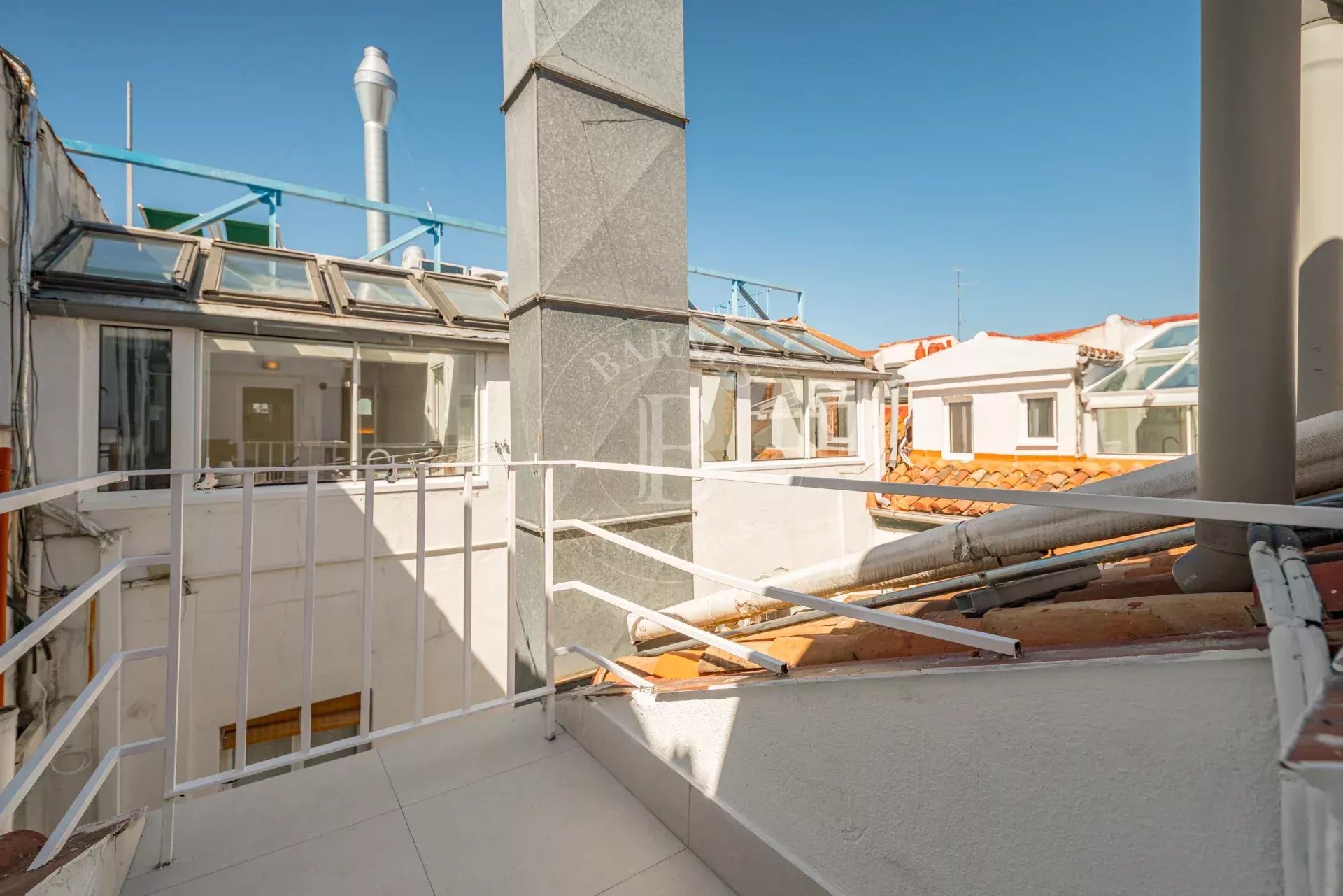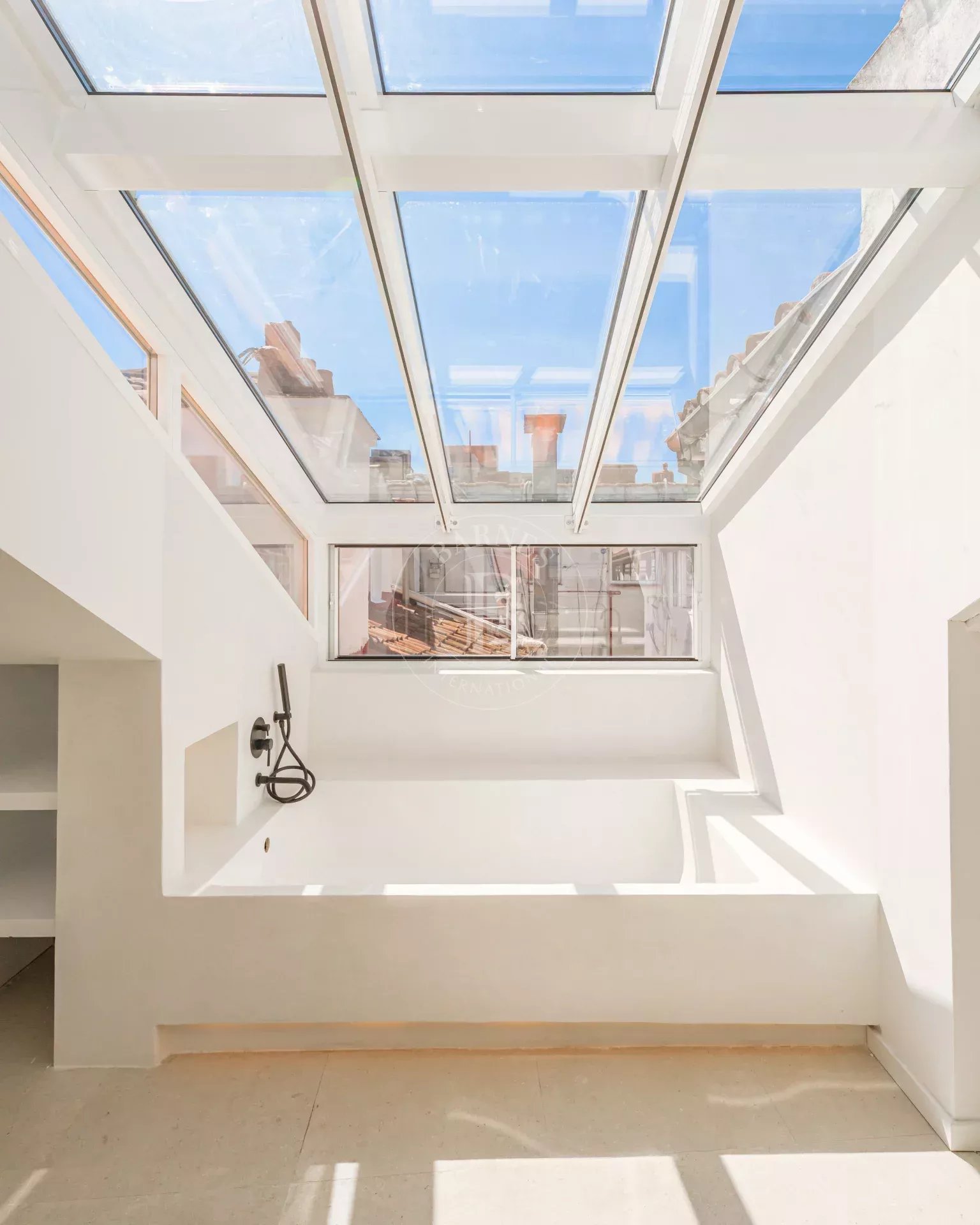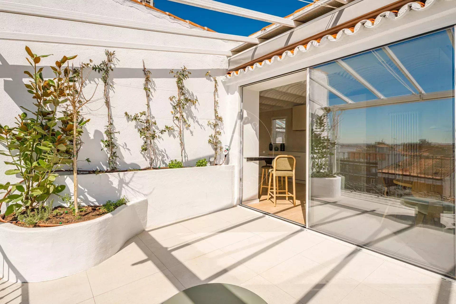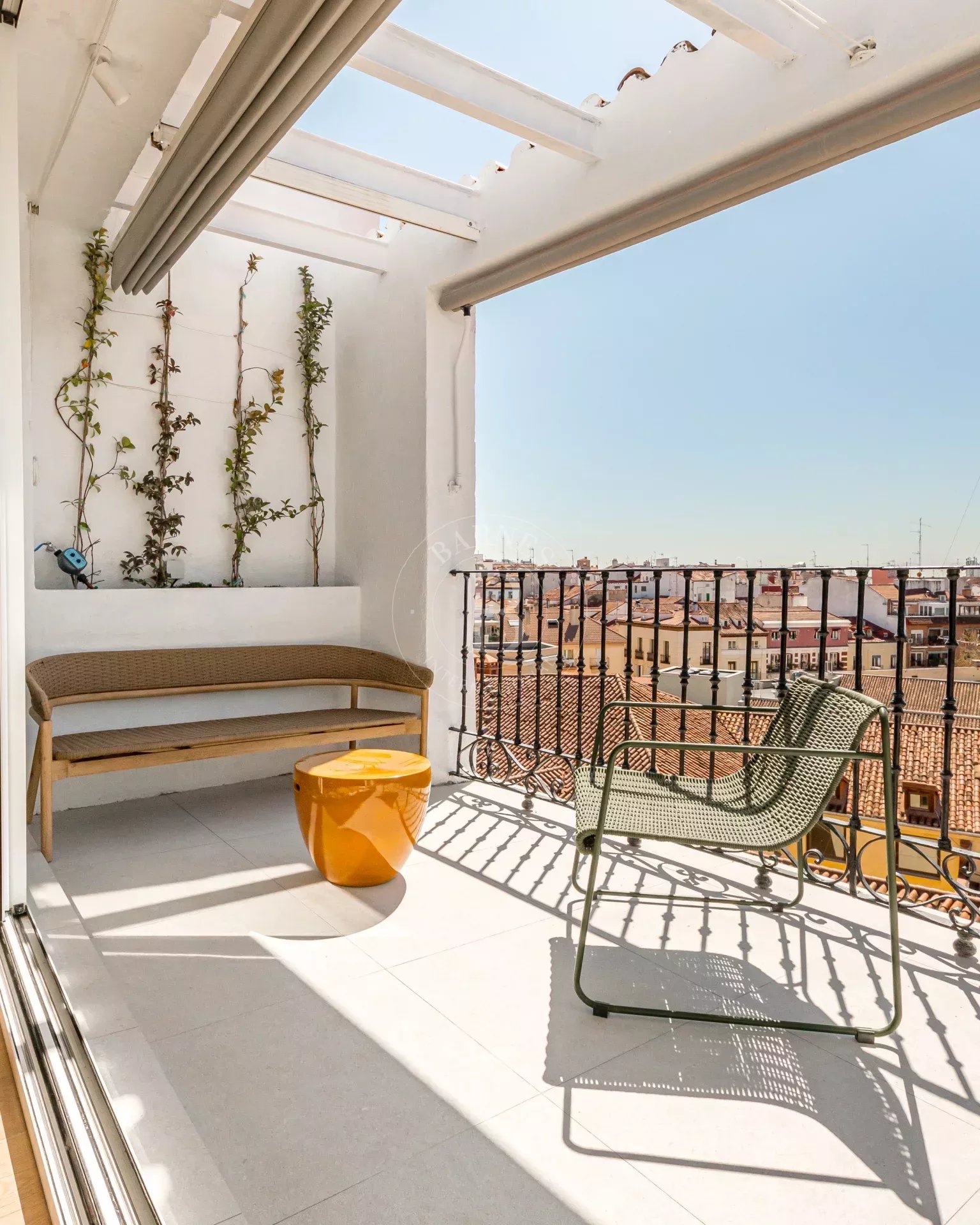 El ático ocupa la totalidad de la planta superior y destaca por su extraordinaria luminosidad y sus espectaculares vistas 360º sobre Madrid. Su orientación sur y los amplios ventanales conectan los espacios interiores con dos terrazas exteriores, desde las que se disfrutan vistas abiertas a las cúpulas madrileñas y al skyline urbano, ofreciendo una sensación de privacidad y privilegio excepcional en el corazón de la ciudad.