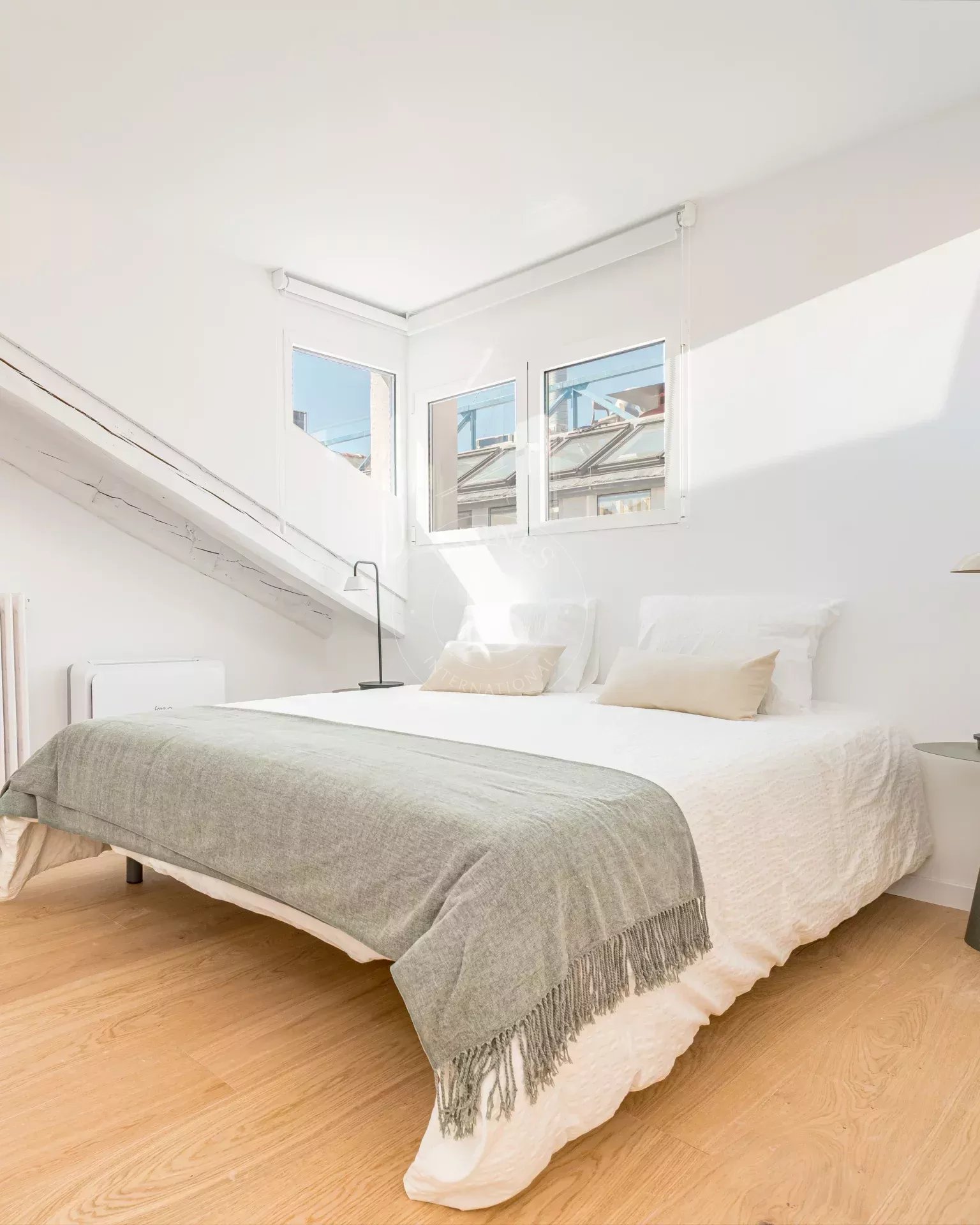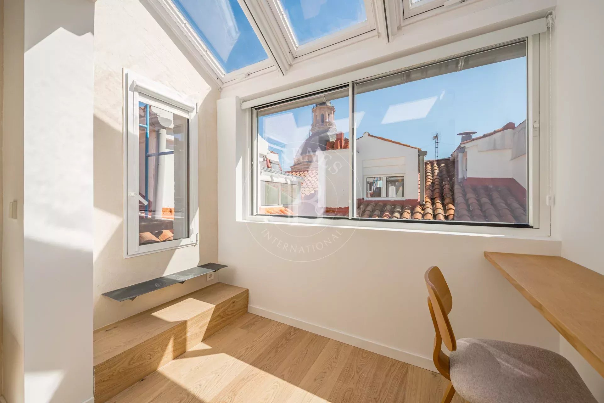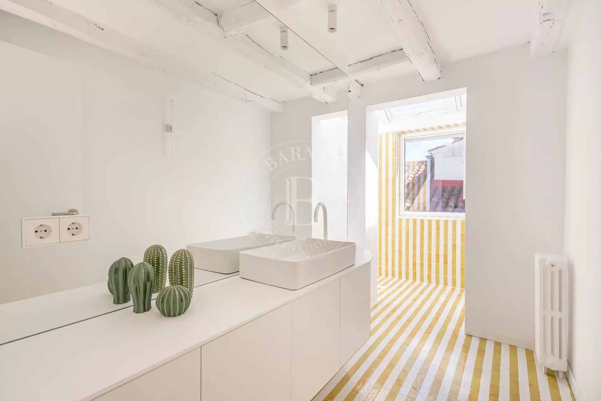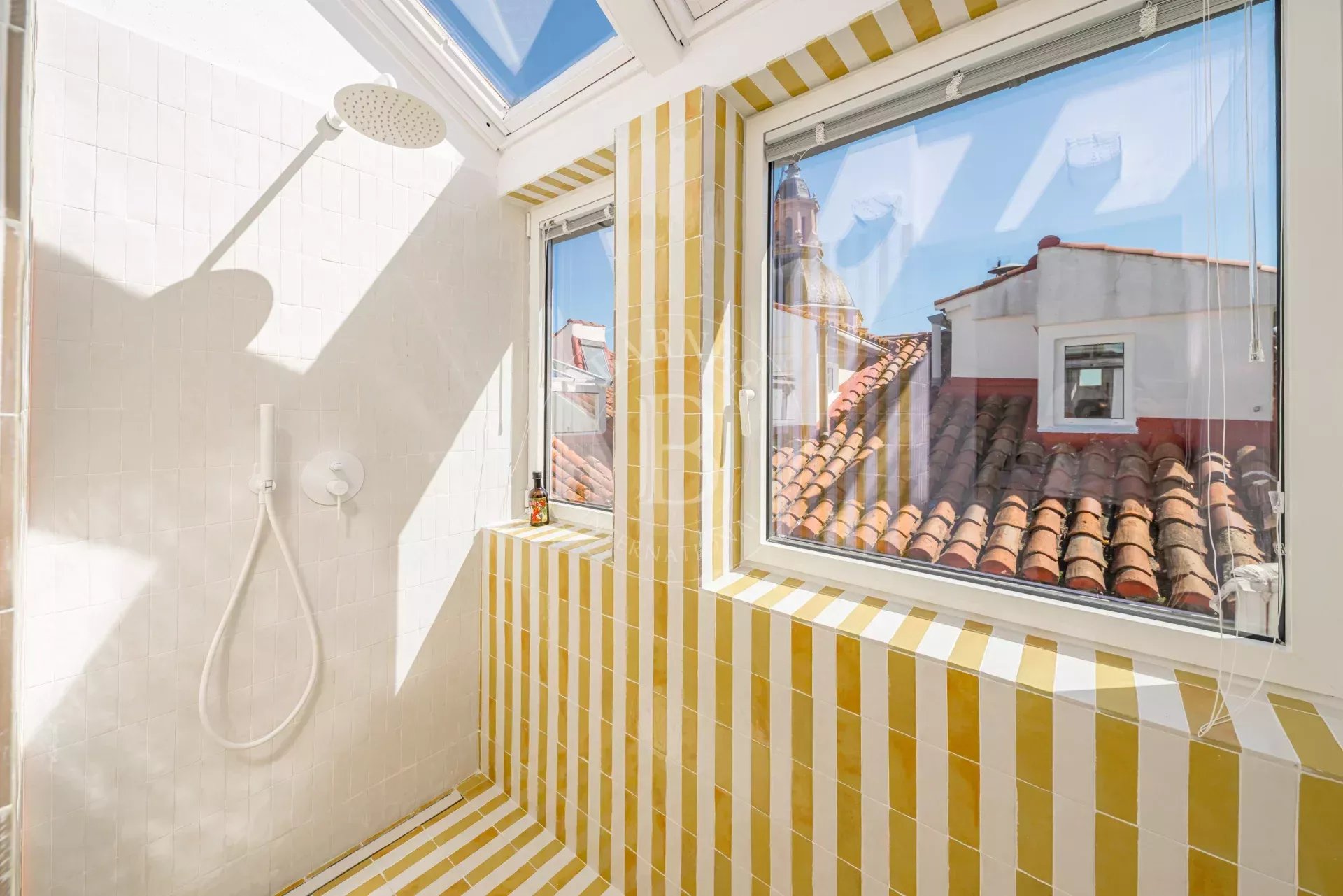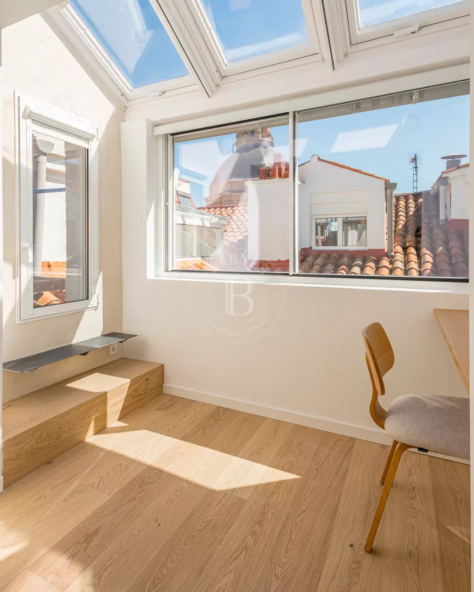 El ático ocupa la totalidad de la planta superior y destaca por su extraordinaria luminosidad y sus espectaculares vistas 360º sobre Madrid. Su orientación sur y los amplios ventanales conectan los espacios interiores con dos terrazas exteriores, desde las que se disfrutan vistas abiertas a las cúpulas madrileñas y al skyline urbano, ofreciendo una sensación de privacidad y privilegio excepcional en el corazón de la ciudad.