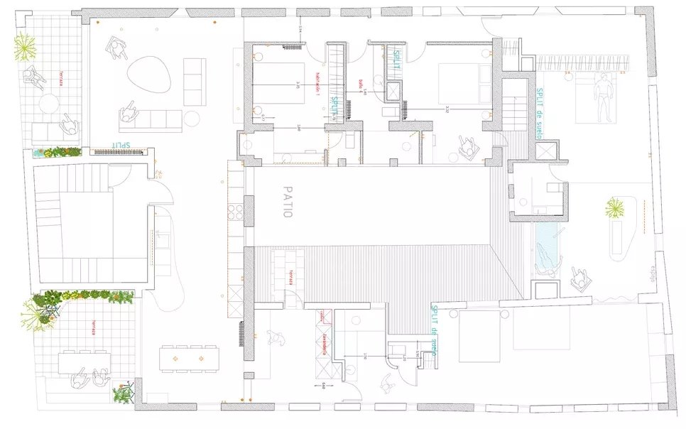 La distribución incluye un gran salón diáfano en concepto open space con cocina abierta y comedor, cuatro dormitorios, cinco baños, invernadero, bodega, lavandería, dos terrazas exteriores y una terraza interior.