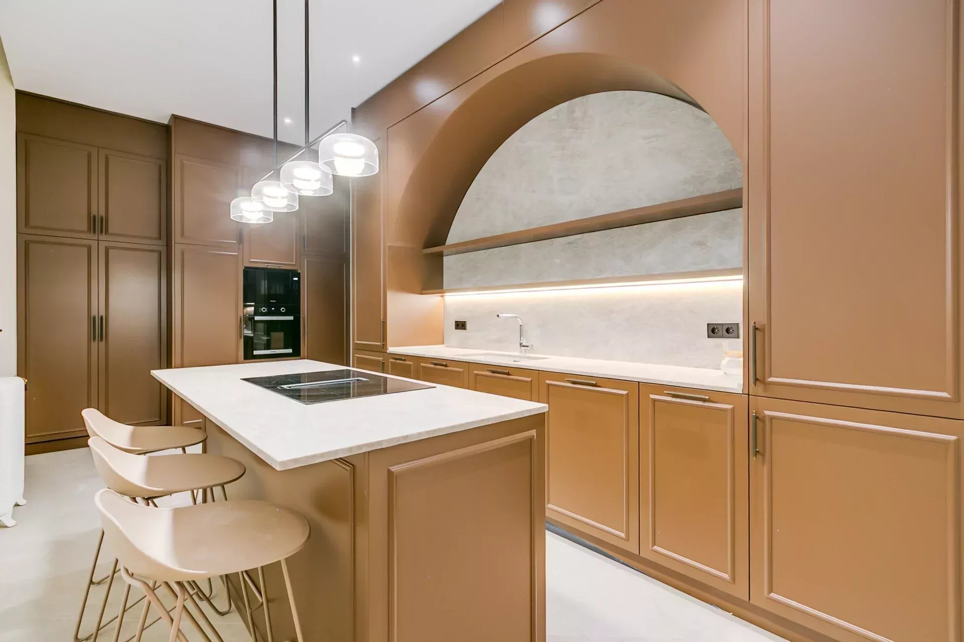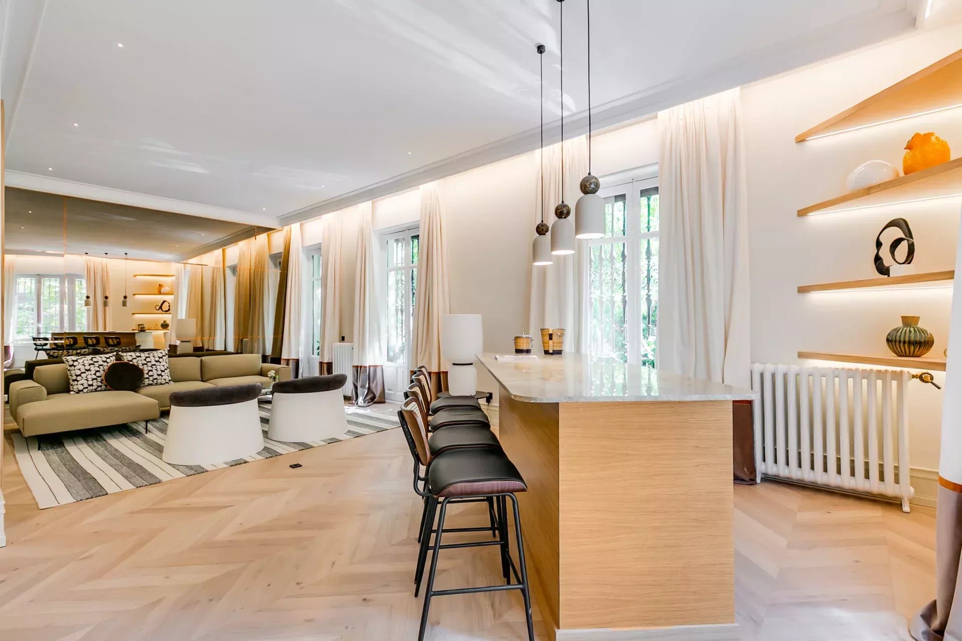 El gran salón principal, con techos altos que potencian la amplitud, se distribuye en un recibidor elegante, dos zonas de estar, un refinado espacio de bar y un comedor independiente. La cocina, también independiente, combina diseño en madera y mármol con electrodomésticos de alta gama.