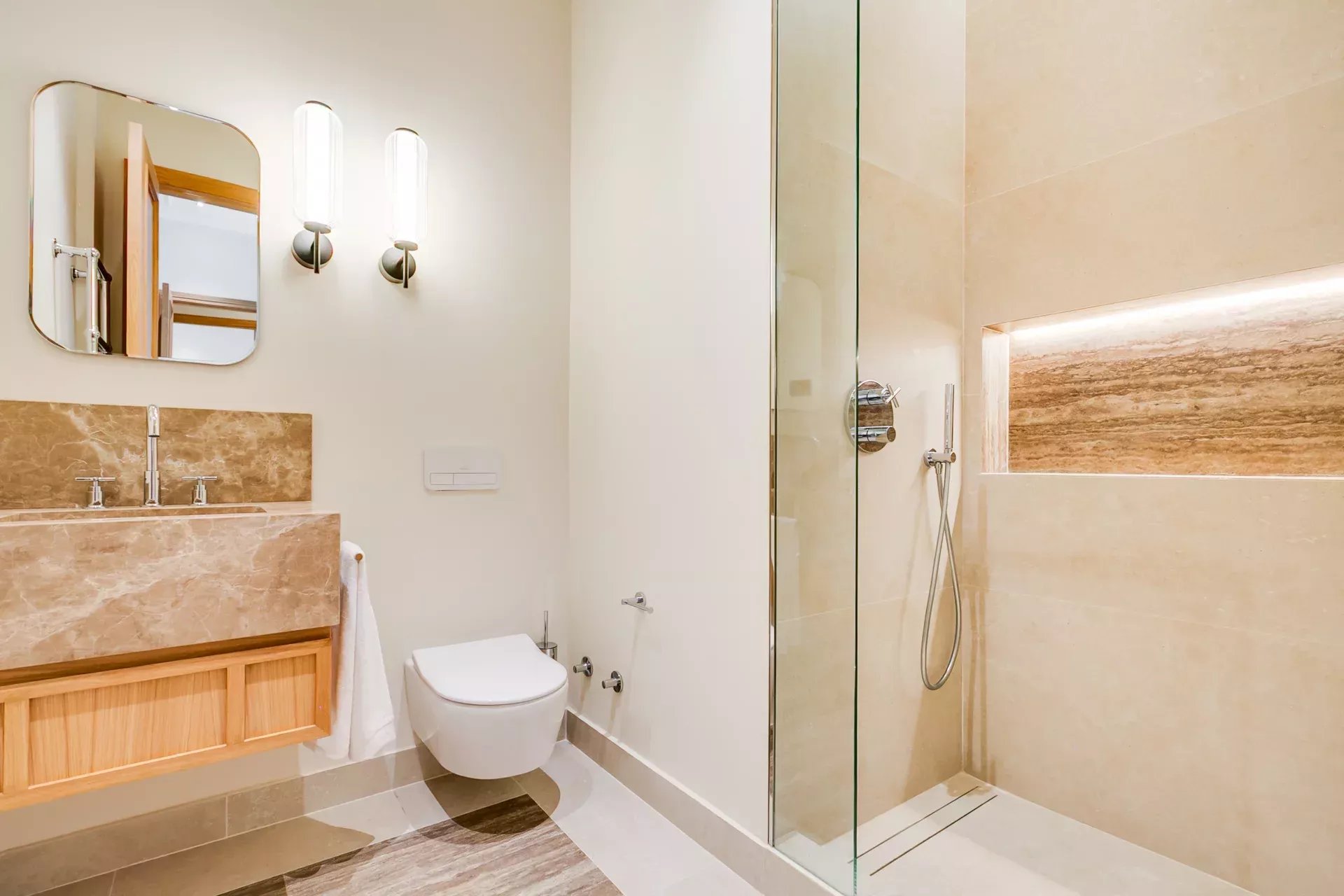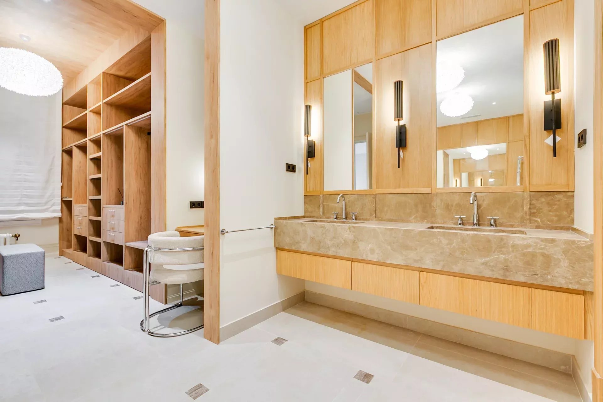 La zona de noche incluye cinco dormitorios: cuatro principales, todos con baño en suite y armarios empotrados a medida, y un quinto dormitorio más reducido ideal como cuarto de servicio. La espectacular suite principal dispone de un gran vestidor, zona de tocador, doble lavabo, doble ducha tipo lluvia, dos inodoros independientes y bañera exenta.