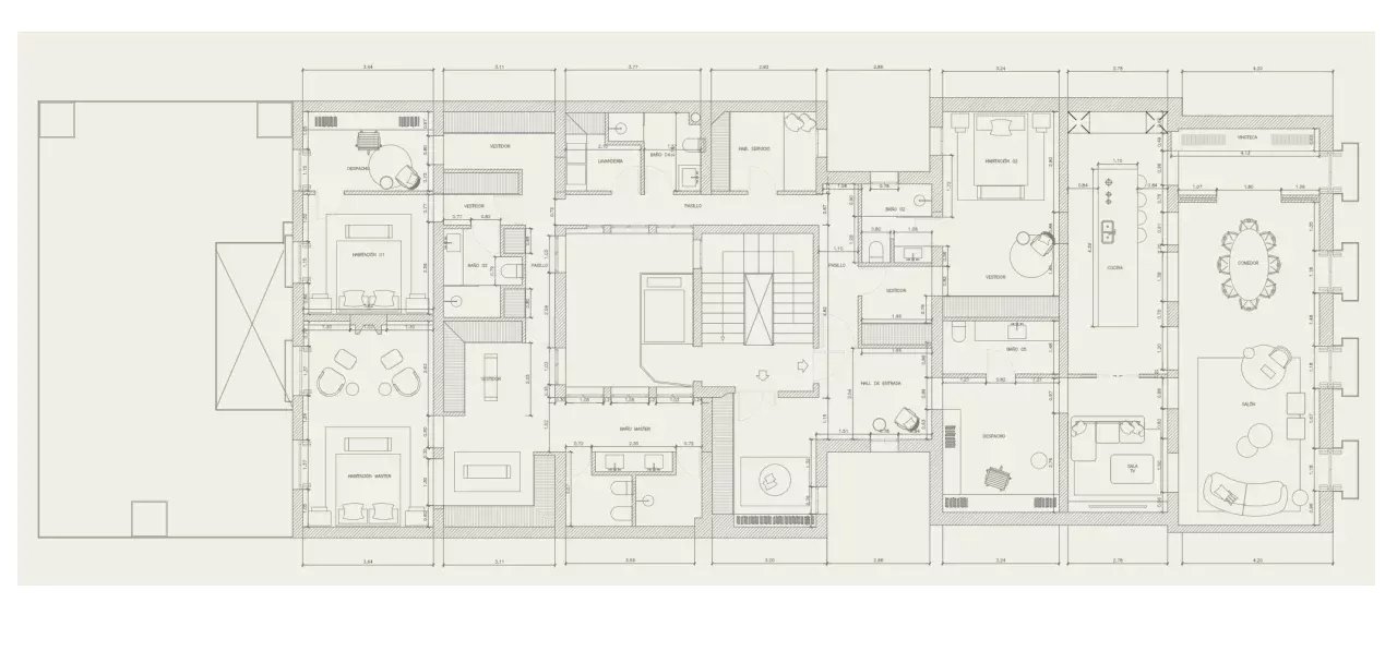 El piso destaca por su distribución diáfana, su luminosidad natural y sus vistas despejadas. Dispone de tres amplios dormitorios con baño en suite, un dormitorio de servicio con baño independiente y un aseo de cortesía. Cada espacio ha sido diseñado para ofrecer confort, amplitud y elegancia, con una reforma que integra tecnología moderna y soluciones inteligentes para aprovechar al máximo la luz natural, siguiendo el estándar de las mejores viviendas de lujo en venta en Madrid.