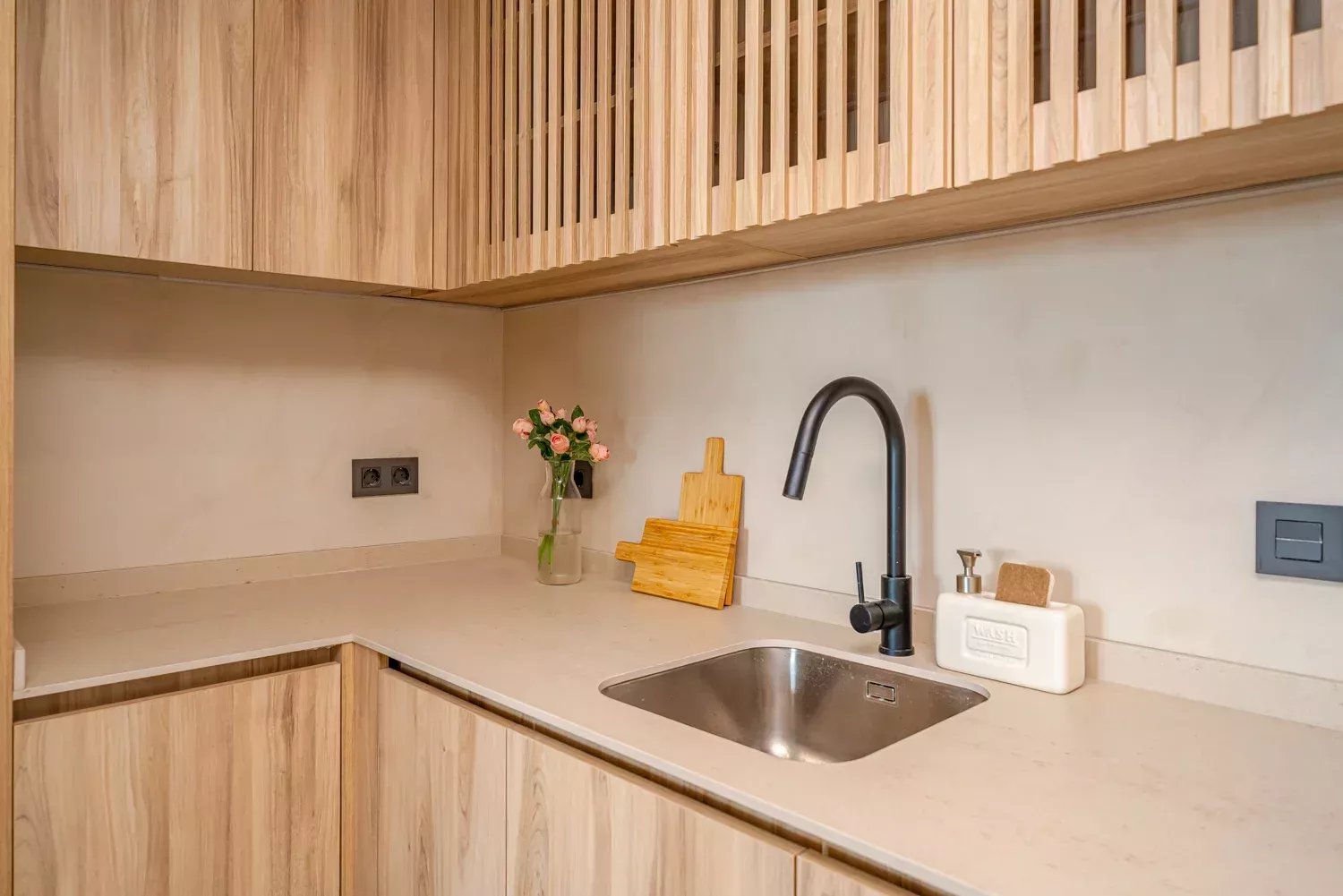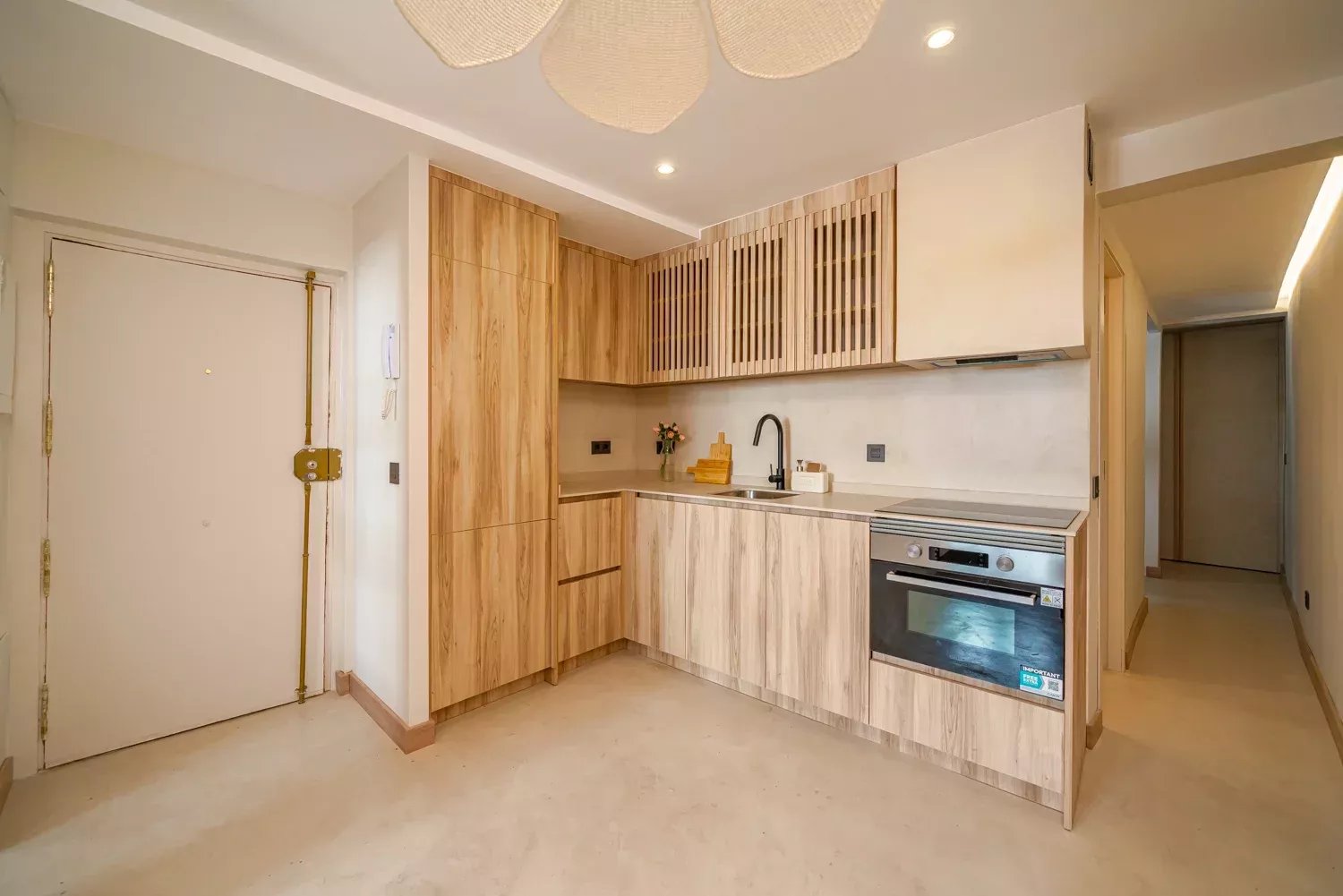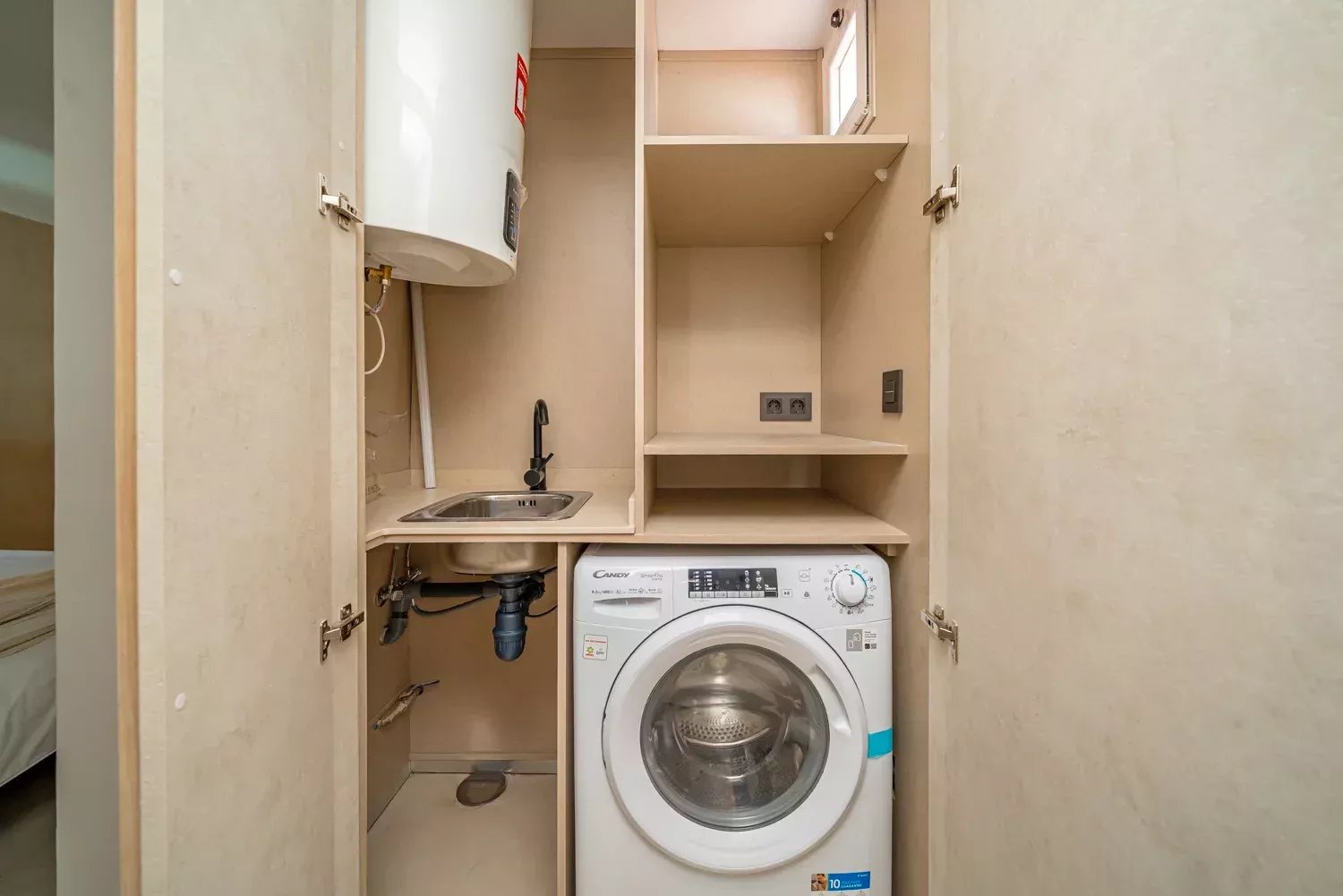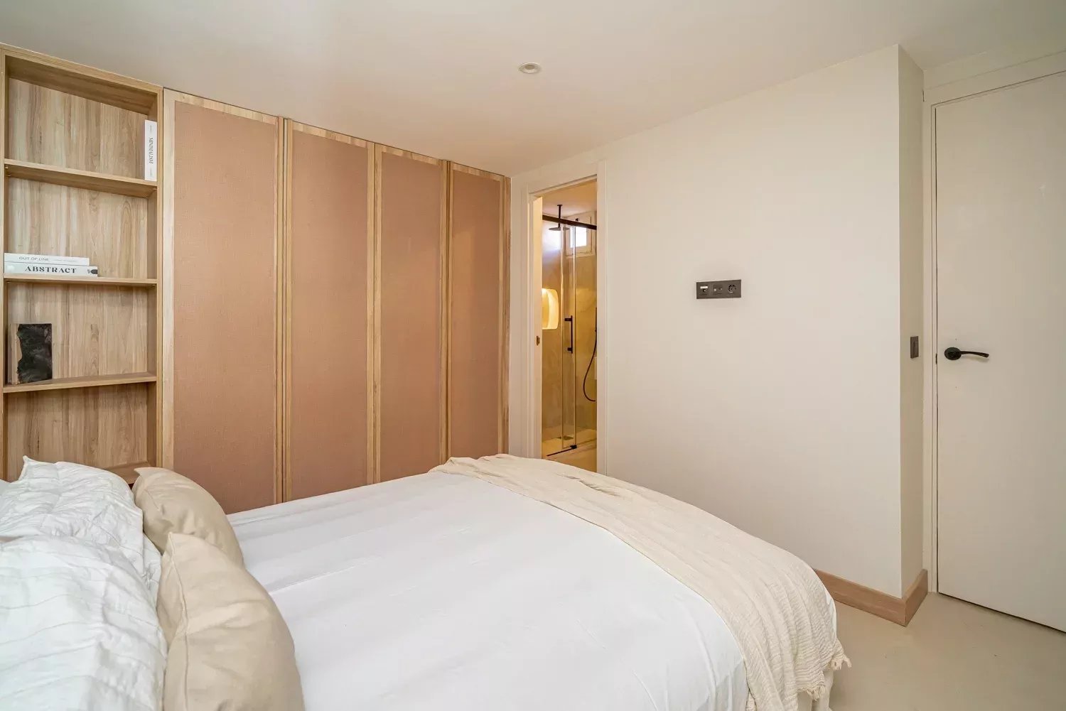 El apartamento cuenta con un salón contemporáneo de concepto abierto con cocina integrada, dos dormitorios bien proporcionados y un baño elegante. Las ventanas de doble acristalamiento, las persianas eléctricas y el aire acondicionado garantizan confort y eficiencia durante todo el año, mientras que el diseño interior ofrece un ambiente luminoso y acogedor.