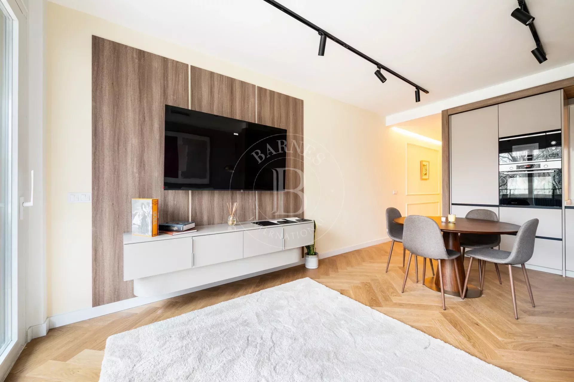 La zona social es luminosa y abierta, con cocina integrada de diseño minimalista, electrodomésticos de alta gama y salida directa a la terraza privada. El dormitorio principal tiene vestidor completo, baño en suite con grifería dorada y pantalla de cine retráctil integrada — un componente tecnológico que convierte el descanso en experiencia.