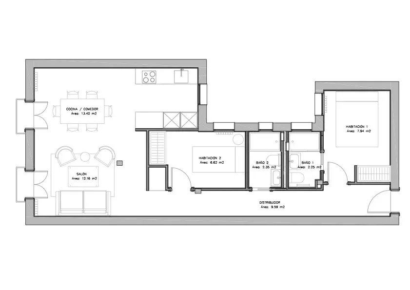 La propiedad ofrece dos dormitorios, uno de ellos en suite, además de un segundo baño completo y una práctica zona de lavandería. El salón-comedor se abre hacia dos balcones con vistas encantadoras, aportando amplitud y una agradable conexión con el exterior. La cocina, integrada en el espacio social, ha sido diseñada con líneas contemporáneas y materiales de alta calidad, creando un ambiente sofisticado y acogedor.