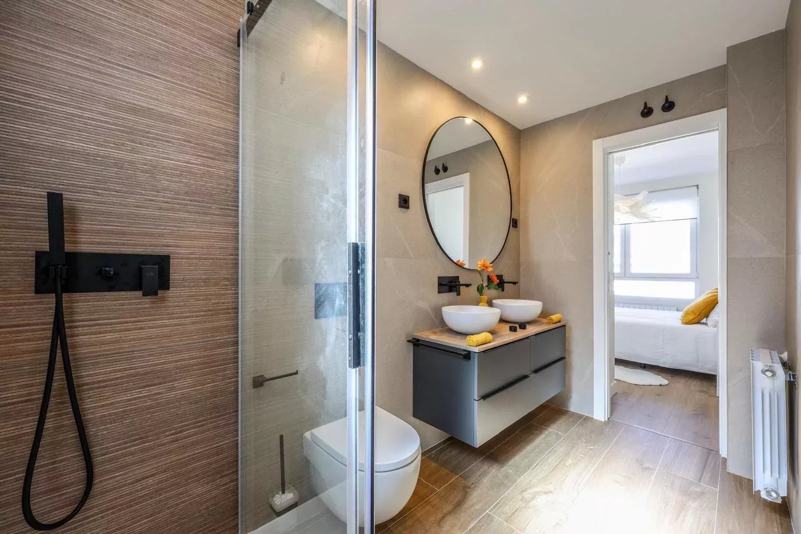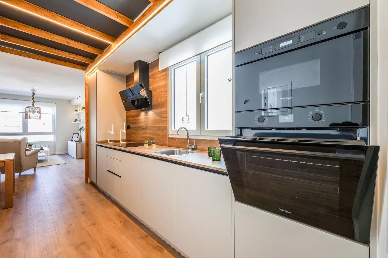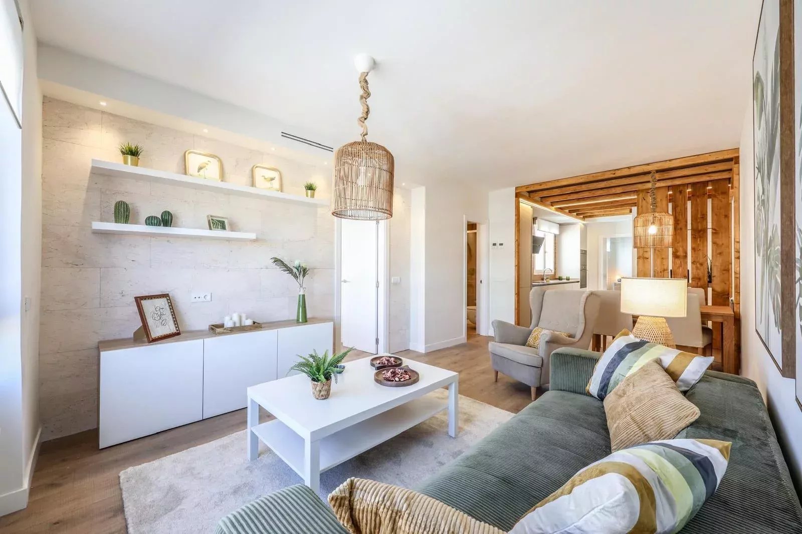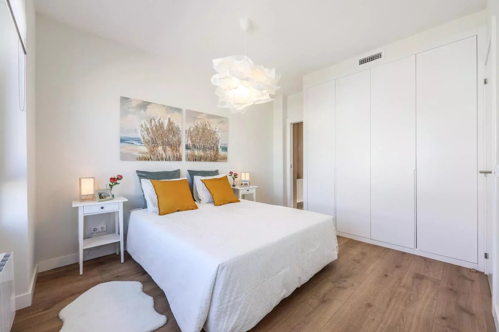 El piso cuenta con un amplio salón comedor, cocina moderna equipada con todos los electrodomésticos, dos dormitorios con armarios empotrados totalmente vestidos, y dos baños completos, uno de ellos en suite. El diseño interior combina funcionalidad y estilo contemporáneo, pensado para ofrecer el máximo confort tanto para residencia habitual como para inversión.