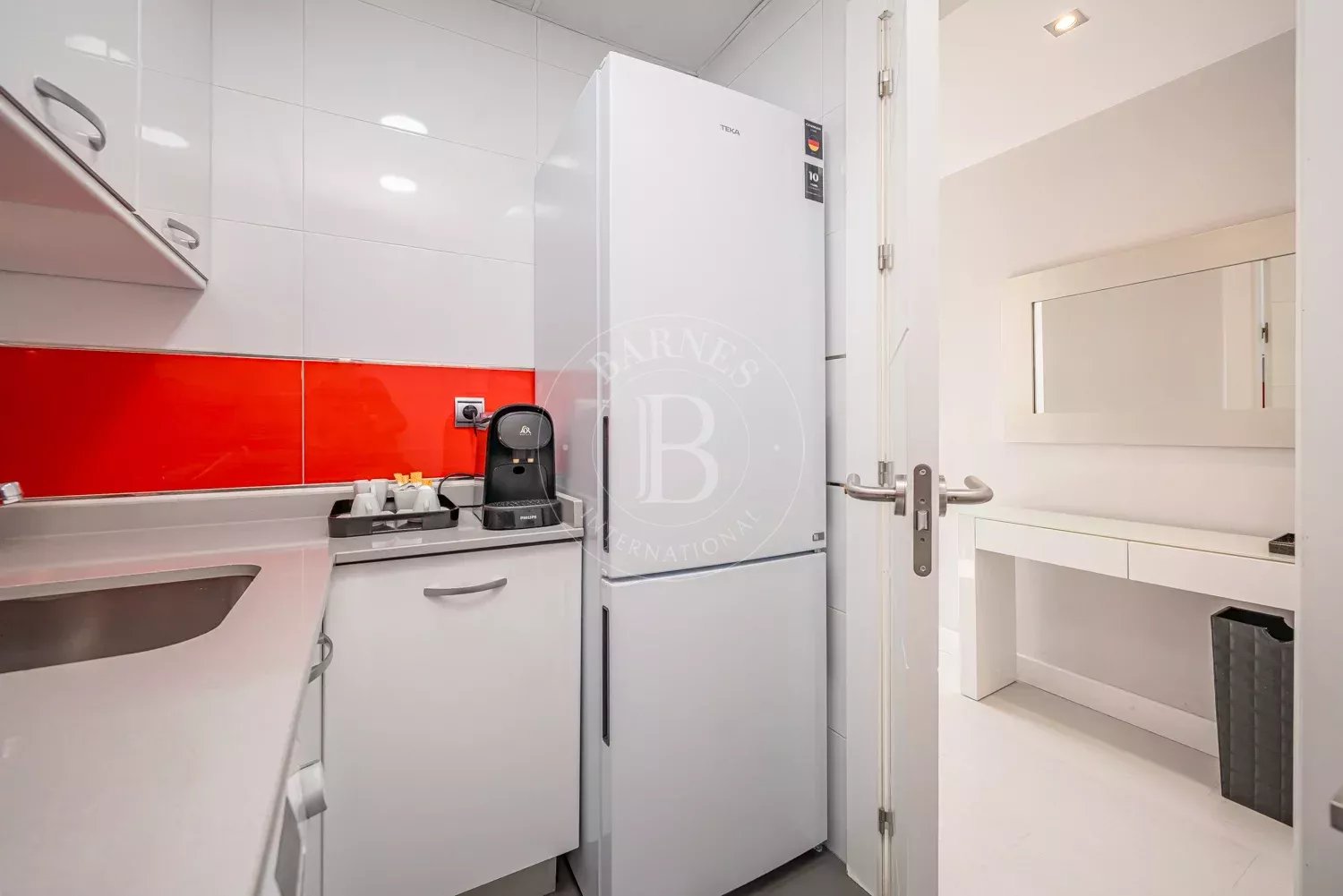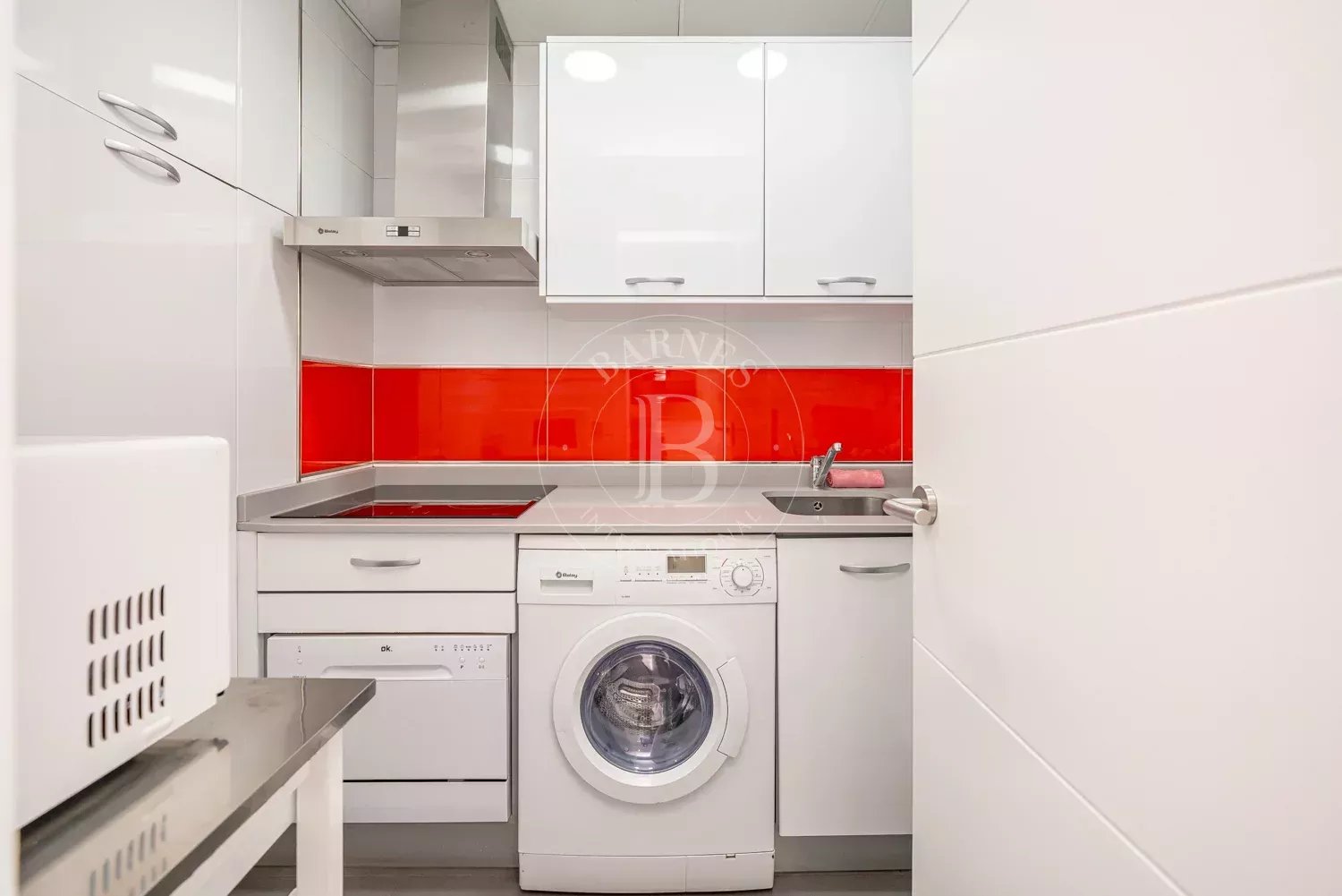 La cuisine est indépendante et entièrement équipée avec des électroménagers modernes, dont réfrigérateur, lave-linge et lave-vaisselle.