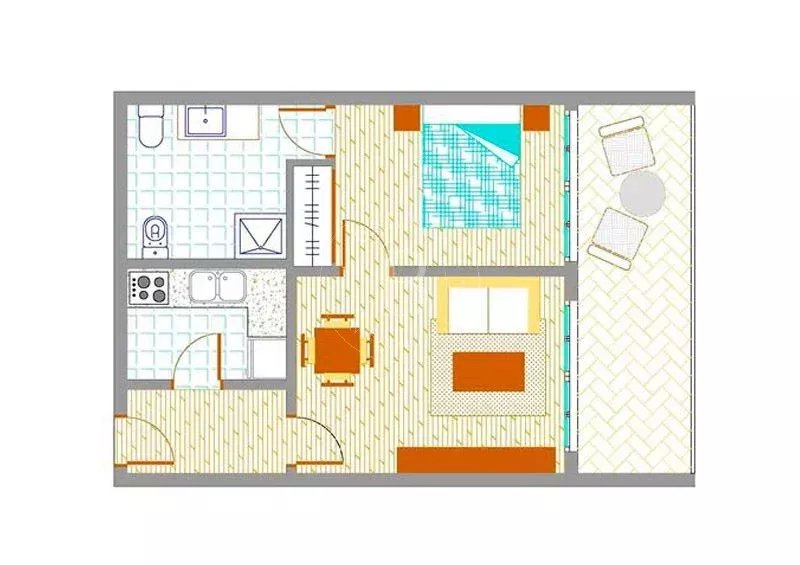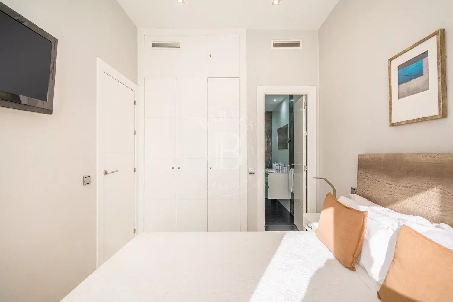 La chambre principale comprend un lit de 1,50 x 1,90 m et des placards intégrés offrant une excellente capacité de rangement. Elle bénéficie d’une salle de bains en suite avec douche et bidet, créant un espace confortable et fonctionnel.