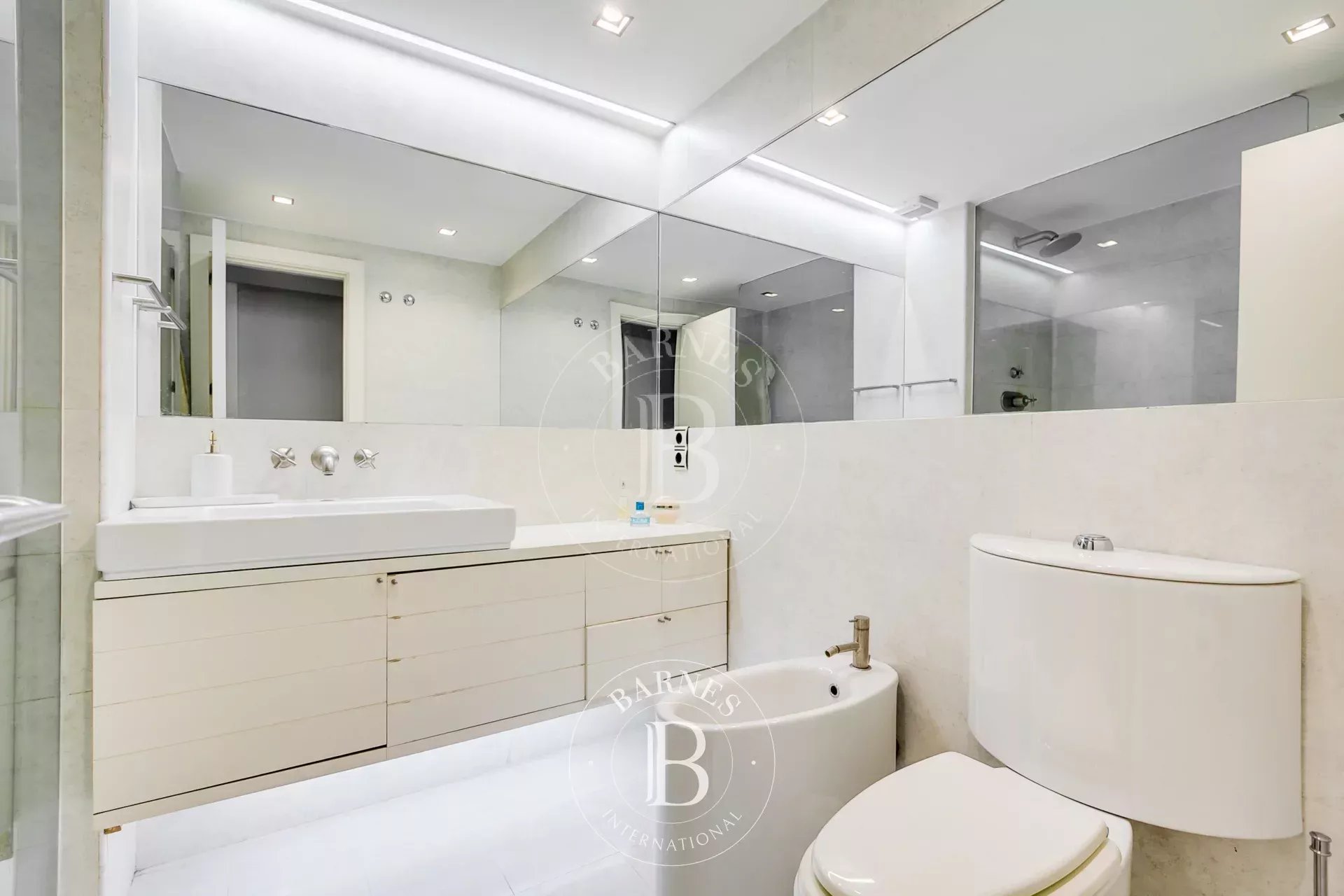 Dès l’entrée, un vaste hall avec placards intégrés mène à un grand salon–salle à manger, divisé en deux espaces indépendants, agrémentés d’étagères sur mesure et d’un grand miroir décoratif apportant profondeur et élégance.
