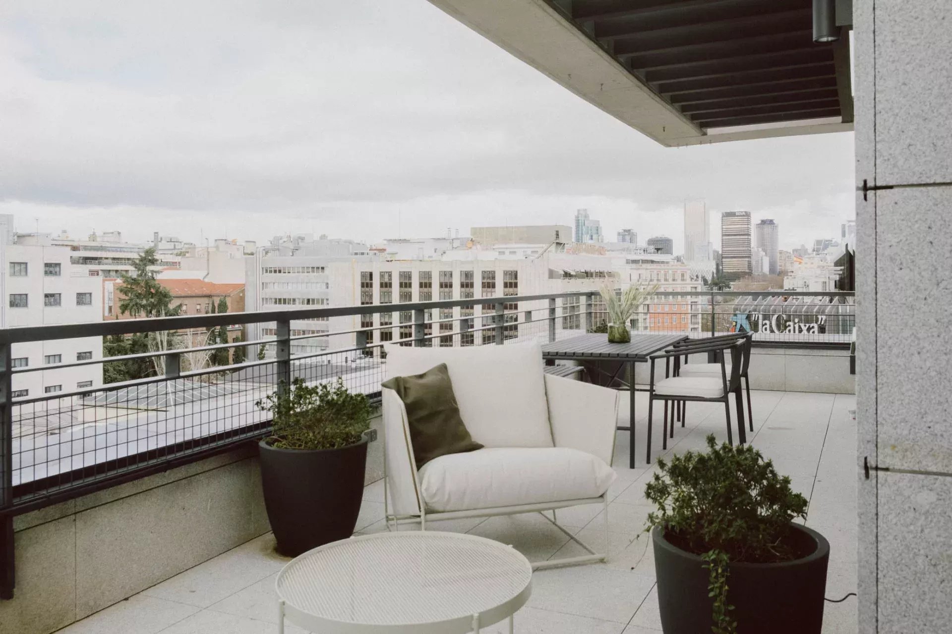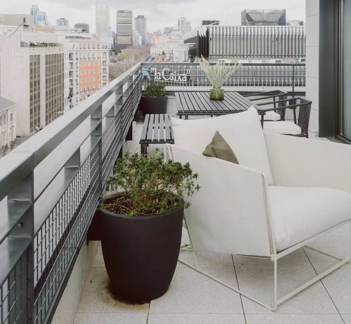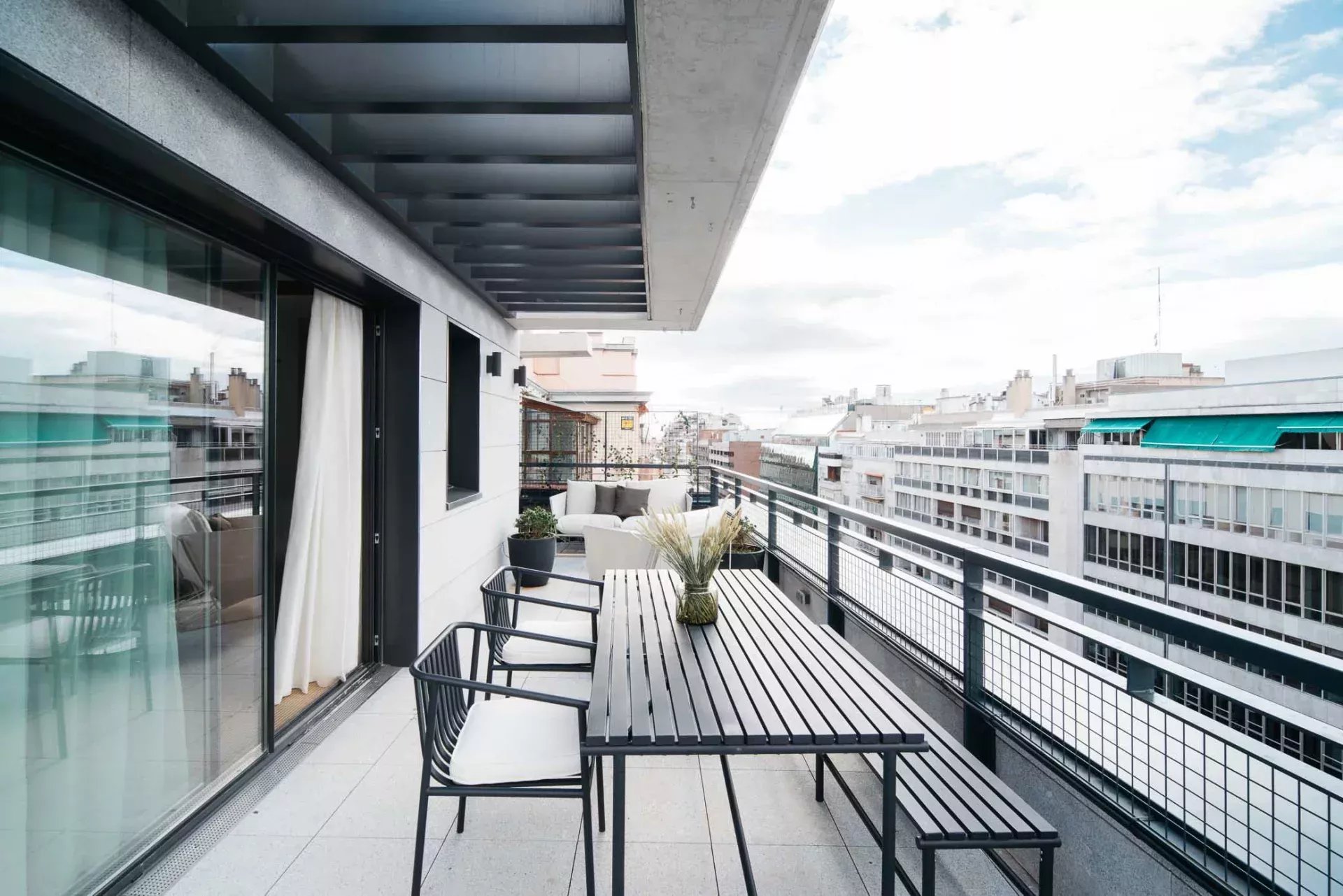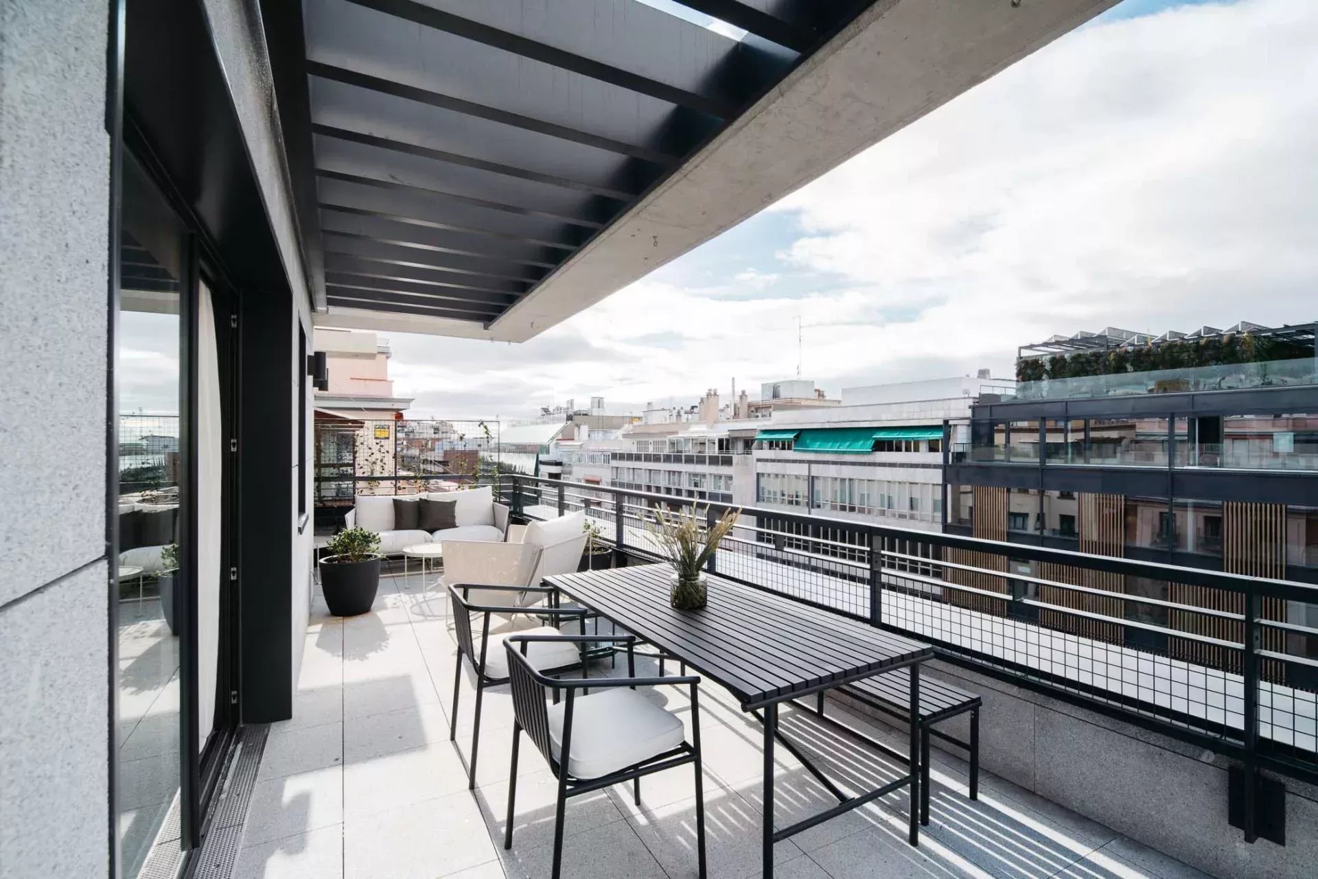 Superficie : 80m² + 90m² de terrasse. Dès l'entrée, on trouve un salon ouvert avec deux grandes portes coulissantes en verre qui donnent accès à une partie de la spectaculaire terrasse qui entoure la propriété. La terrasse, en forme de "U", entoure trois côtés de la propriété, offrant une grande quantité de lumière et des vues aériennes spectaculaires sur la ville. Les différentes zones de la terrasse comprennent une grande table à manger avec une pergola, des zones de détente avec des chaises longues, des fauteuils et des canapés, ainsi qu'une douche extérieure pour se rafraîchir pendant les journées les plus chaudes. L'ensemble est aménagé avec des plantes et des arbres pour en améliorer la beauté et le confort. La cuisine, ouverte sur le salon, est entièrement équipée de tous les appareils électroménagers et dispose d'un bar de style "show cooking". La chambre à coucher, entièrement extérieure et dotée d'un dressing, dispose également d'un accès direct à la terrasse. L'appartement dispose d'une salle de bain complète en-suite et d'une toilette pour les invités.