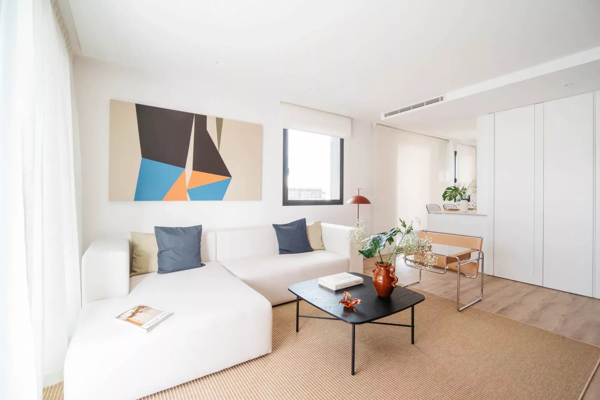 Parquet en chêne avec chauffage par le sol, ce qui rend l'appartement très confortable en hiver. Dallage et revêtement de la terrasse en granit gris clair de grand format. Grandes baies vitrées avec fenêtres étanches, insonorisées et à double vitrage en gris anthracite. Climatisation par gaines, chaud et froid, centrale pour l'ensemble de l'immeuble. Connexion internet gratuite à l'immeuble via le système WIFI. Appartement entièrement meublé et équipé, avec double jeu de draps et de serviettes dans chaque chambre, ainsi que panier de bienvenue et kit de produits d'hygiène à l'arrivée. L'appartement dispose d'une place de parking dans l'immeuble, avec accès à l'ascenseur.
