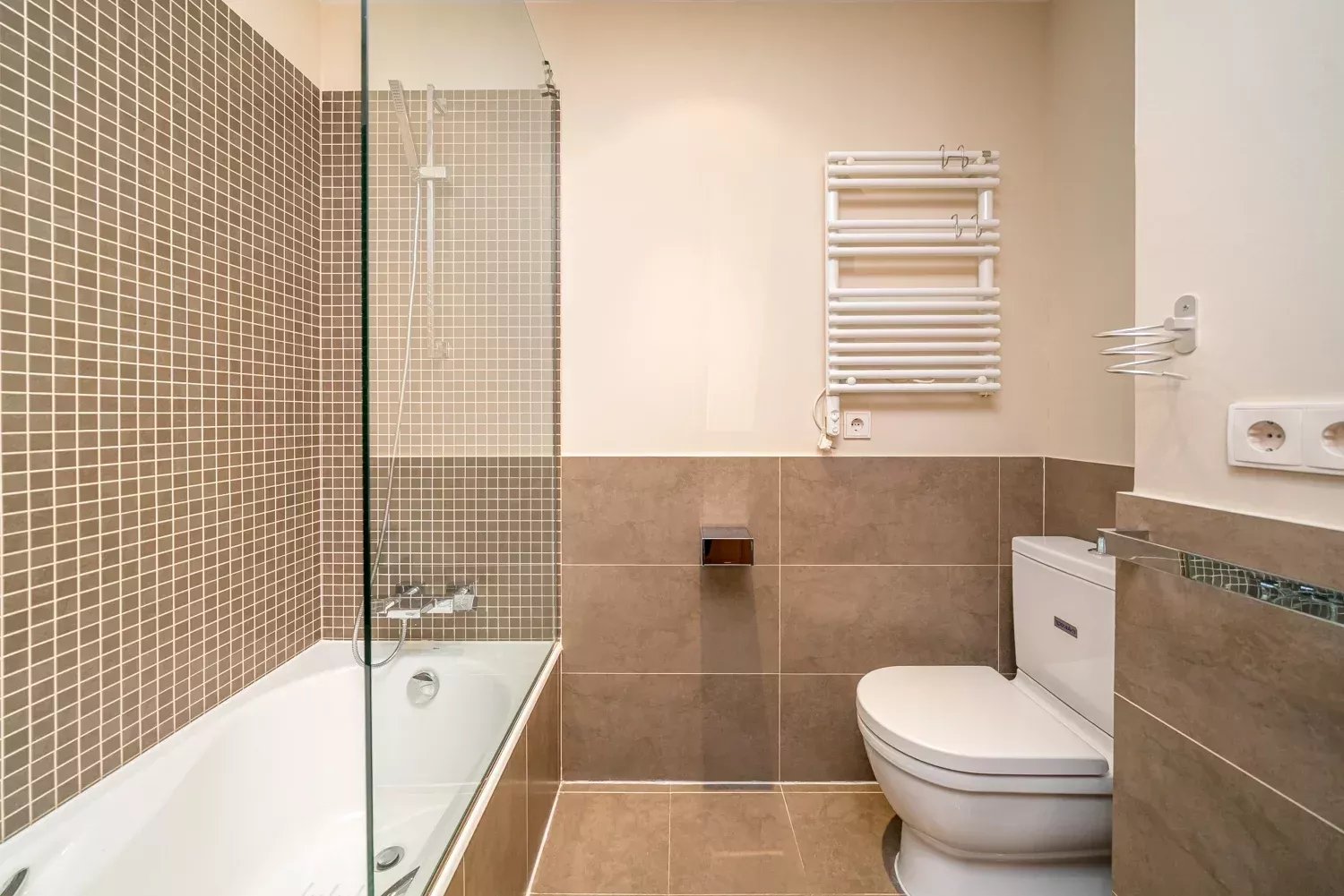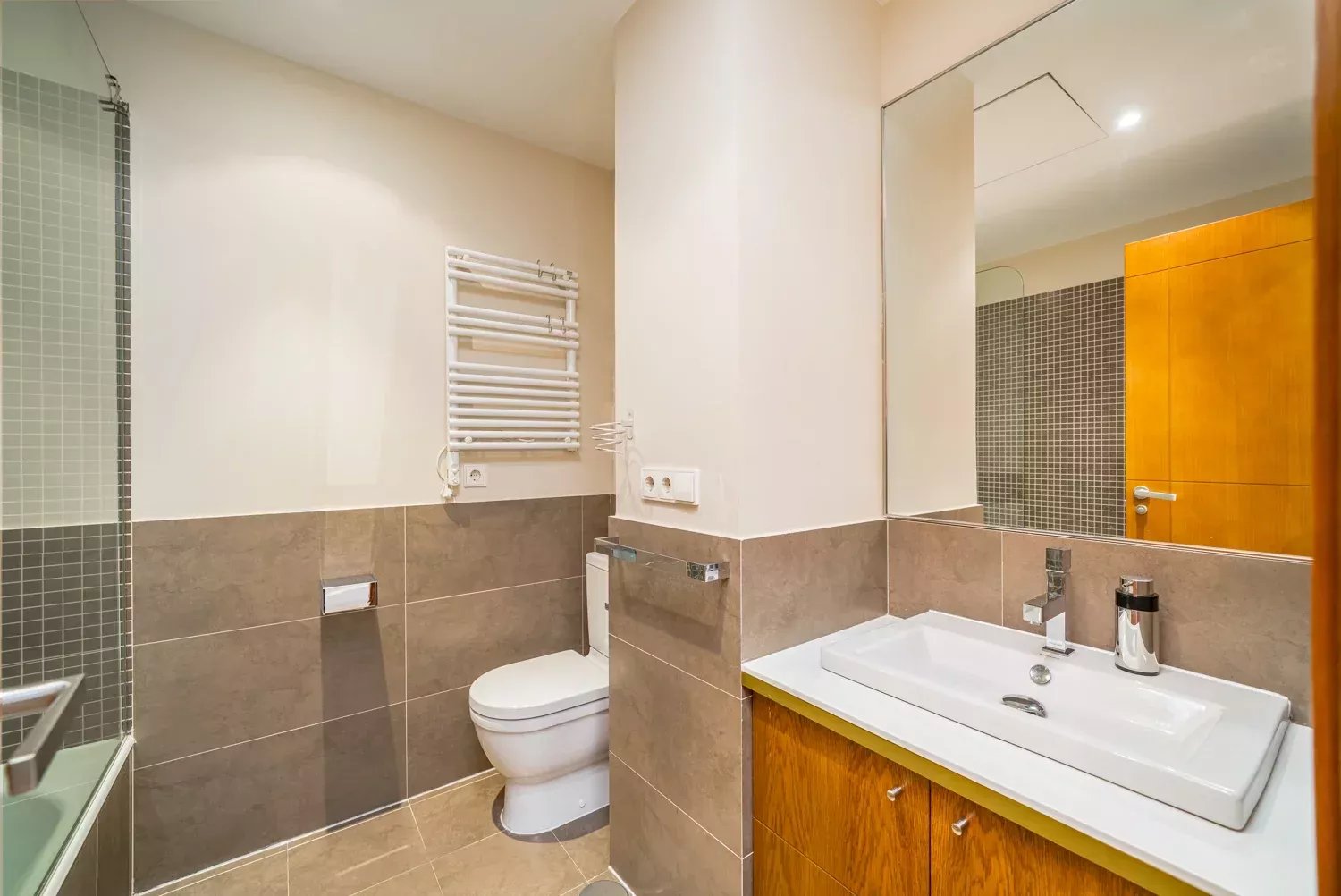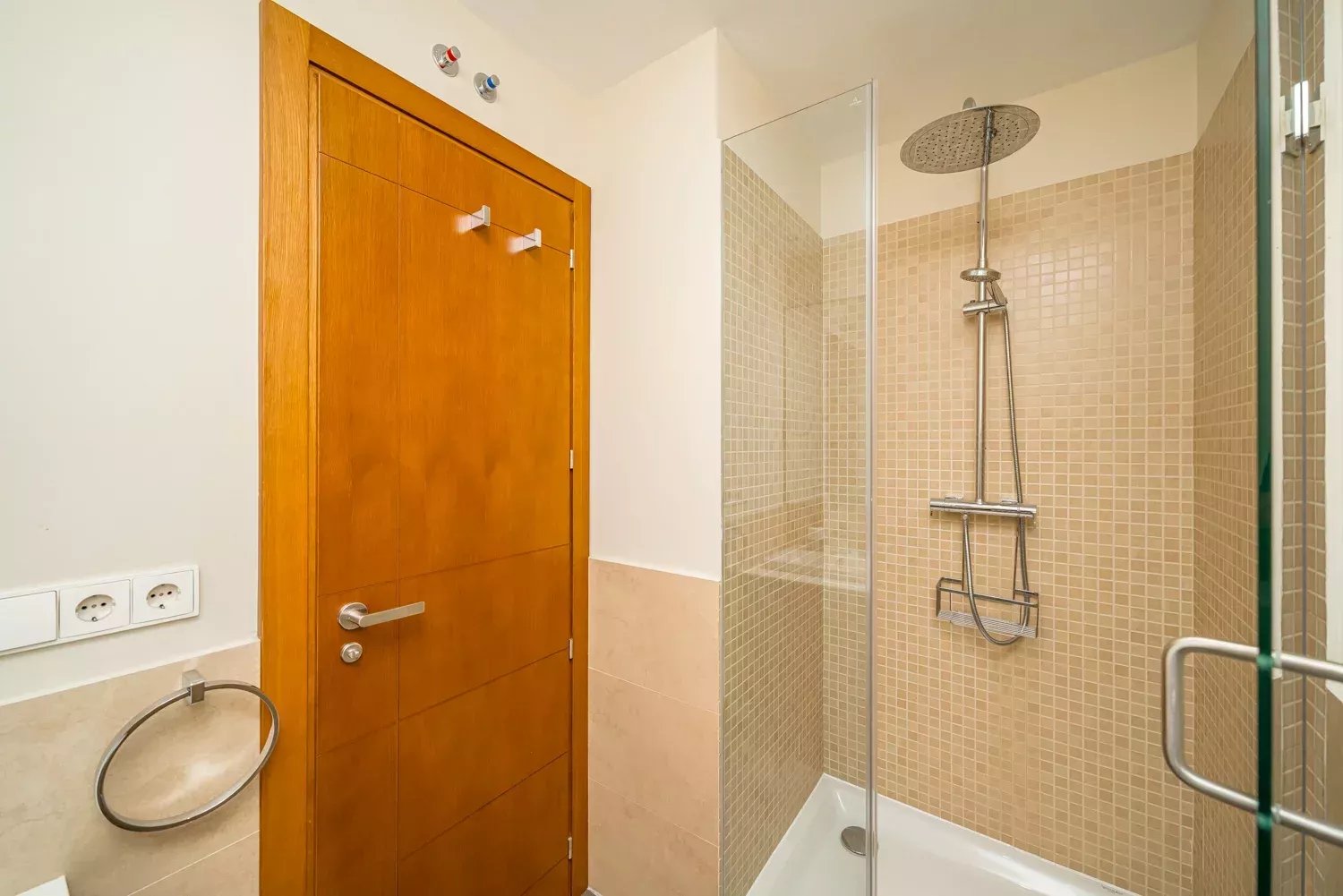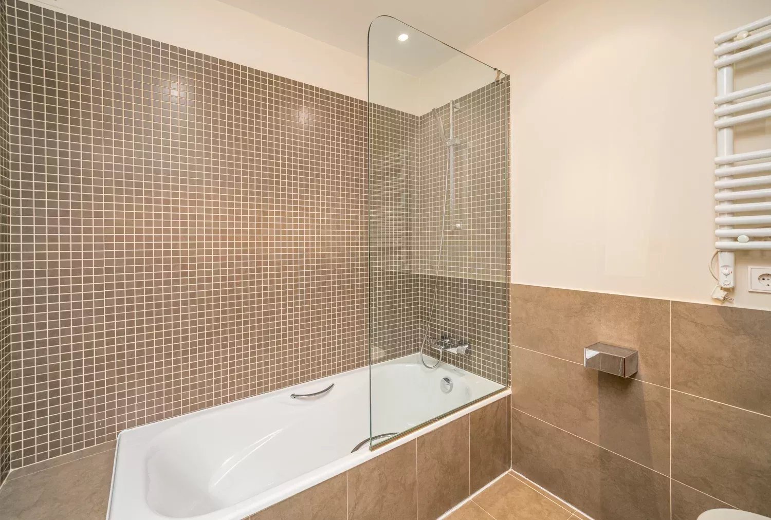 Ce bien de standing comprend deux chambres, dont une suite parentale avec salle de bains privative. La seconde chambre dispose de placards intégrés du sol au plafond, offrant un vaste espace de rangement, ainsi qu'une seconde salle de bains complète à disposition.