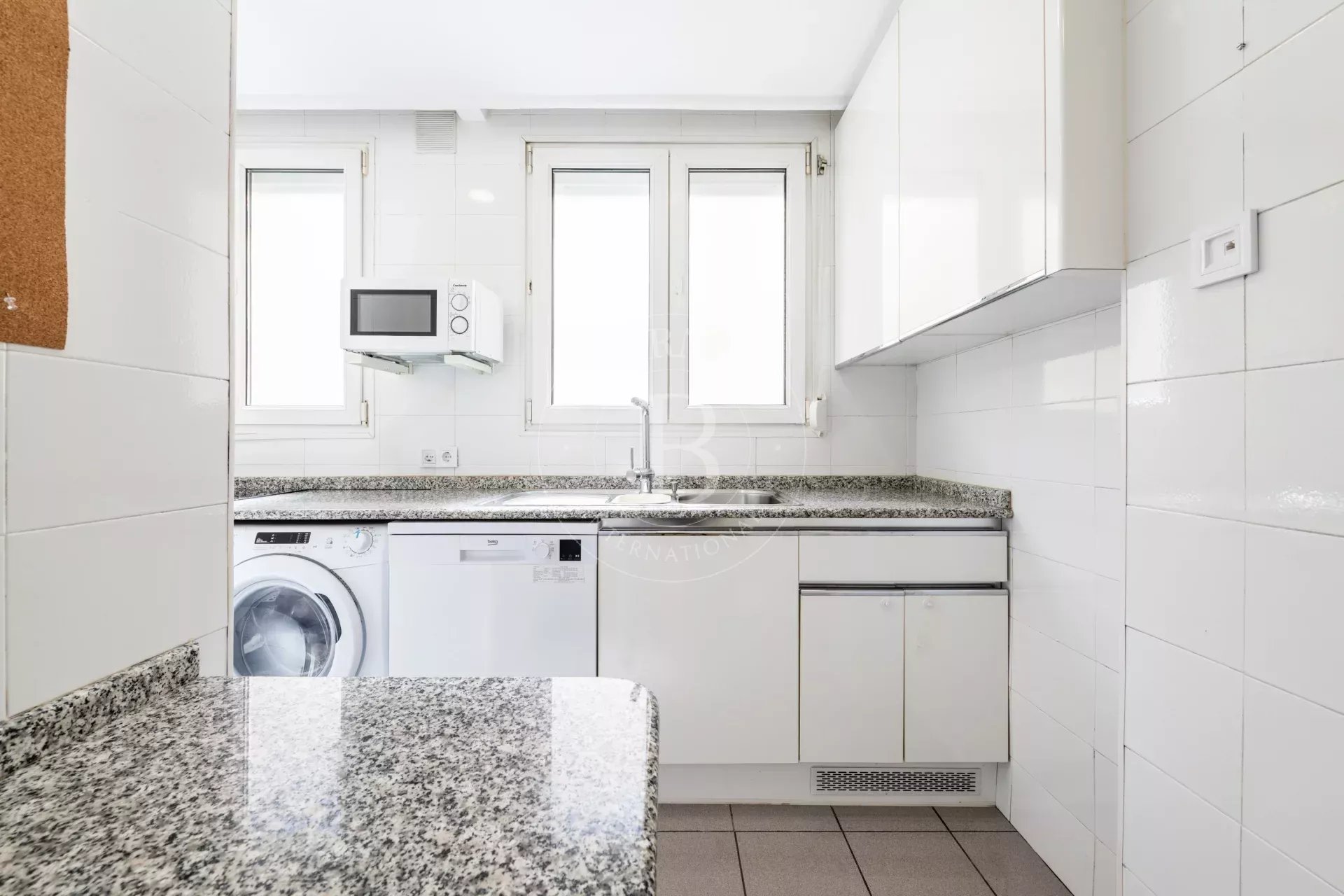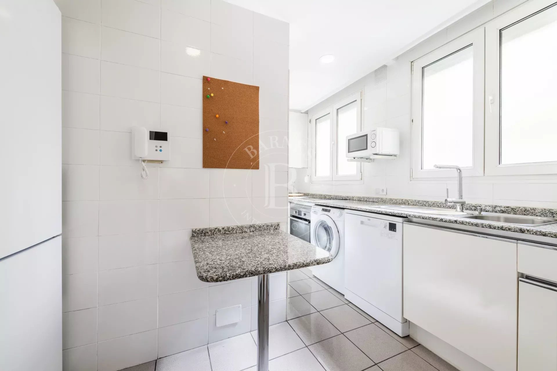 La cuisine indépendante, spacieuse, est entièrement équipée avec électroménagers et vaisselle, et dispose d’un coin bar pratique pour le quotidien.