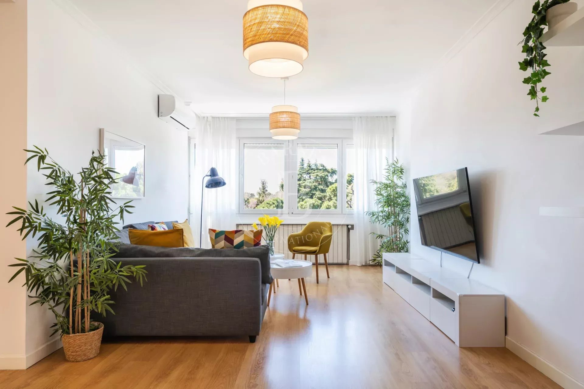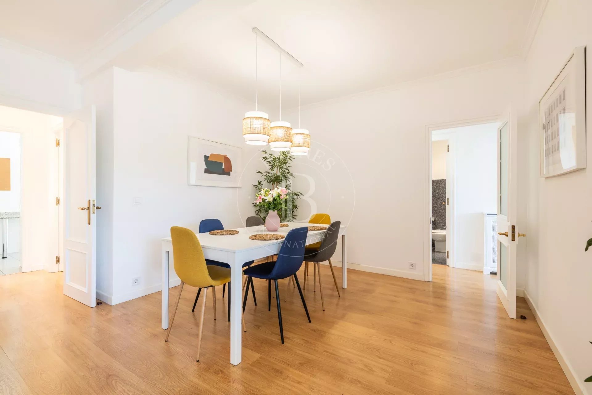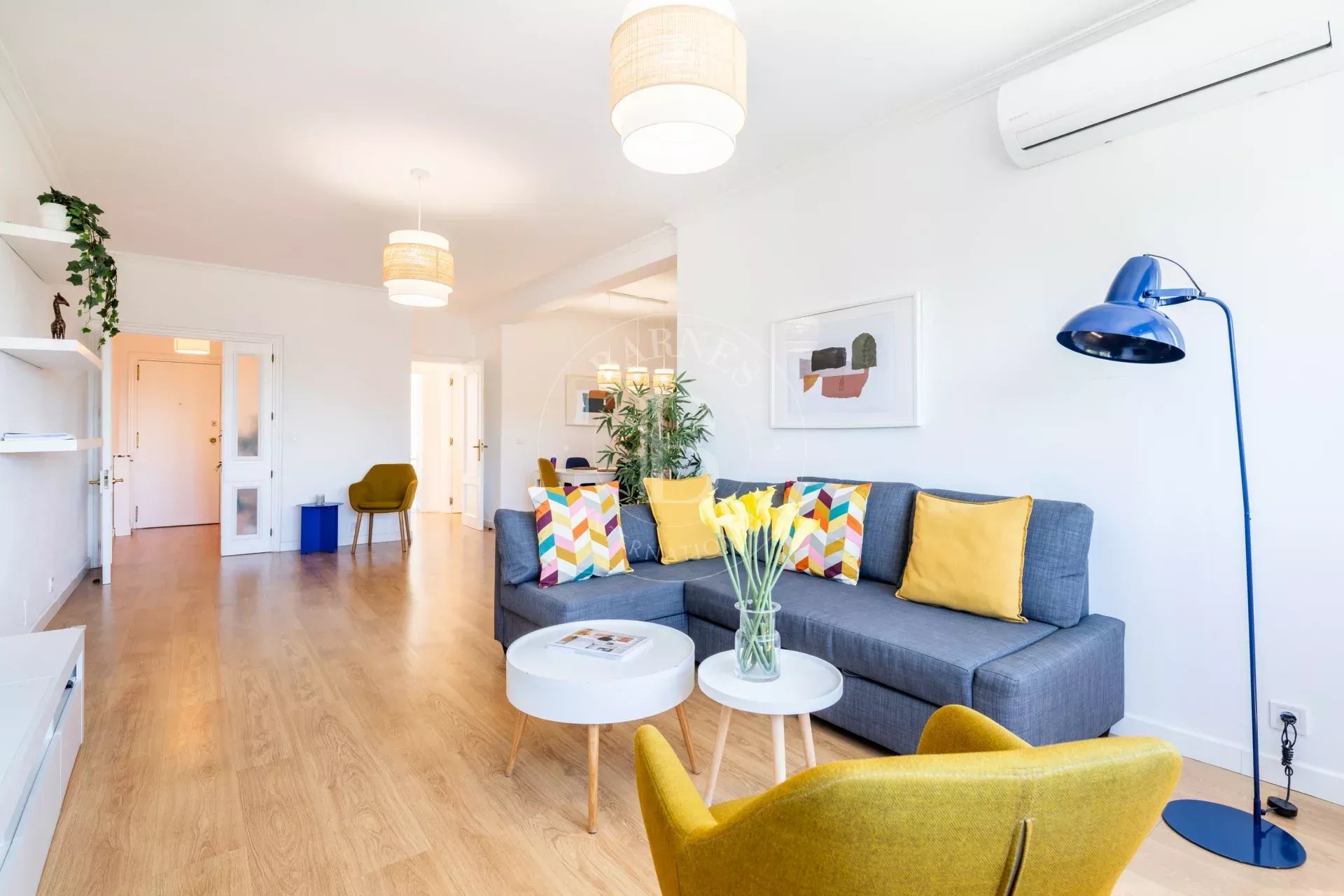 L’appartement offre de belles prestations : fenêtres double vitrage avec isolation thermique et acoustique, parquet stratifié, hauts plafonds, murs lisses et menuiseries neuves. Il dispose également de chauffage central, eau chaude collective, climatisation (splits dans toutes les pièces) et visiophone.