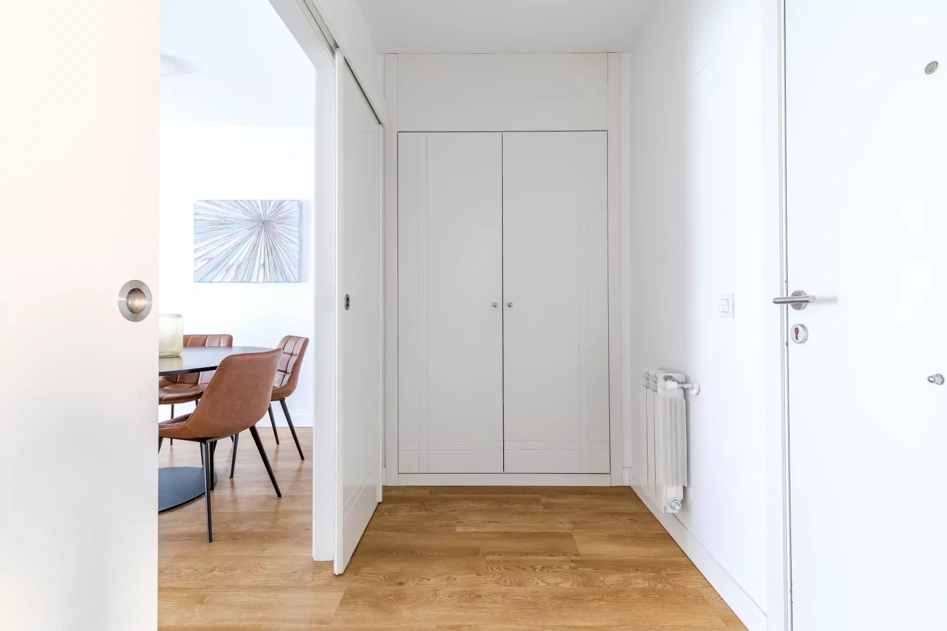 Le salon est équipé de placards intégrés qui maximisent l’espace de rangement, avec des tons neutres et de grandes fenêtres qui inondent le logement de lumière naturelle, créant une ambiance chaleureuse. Le chauffage est central.