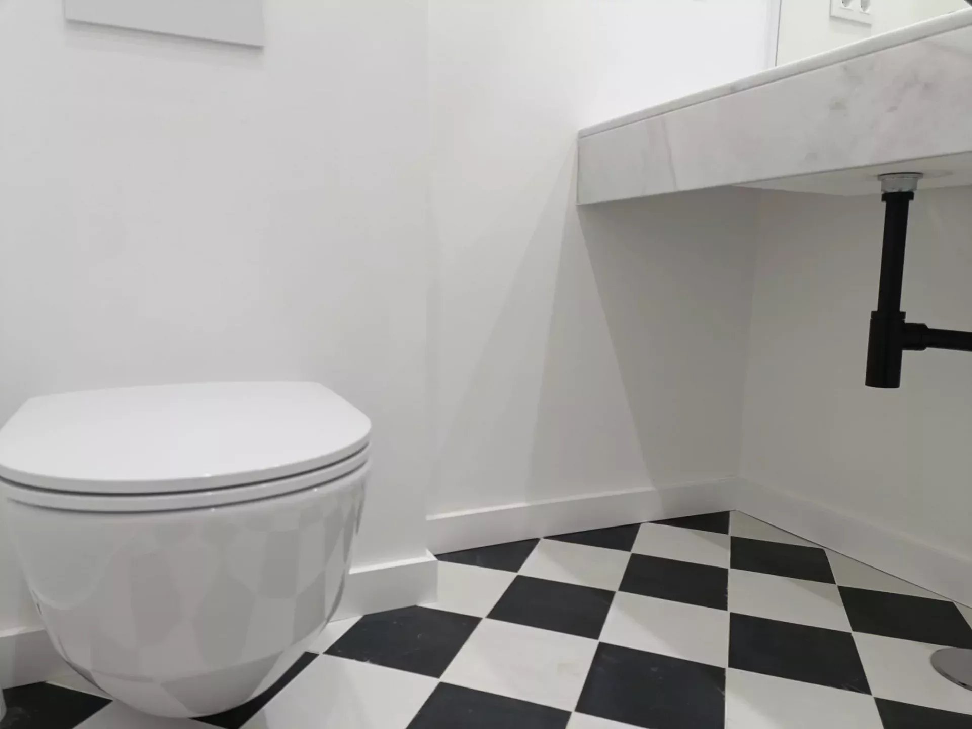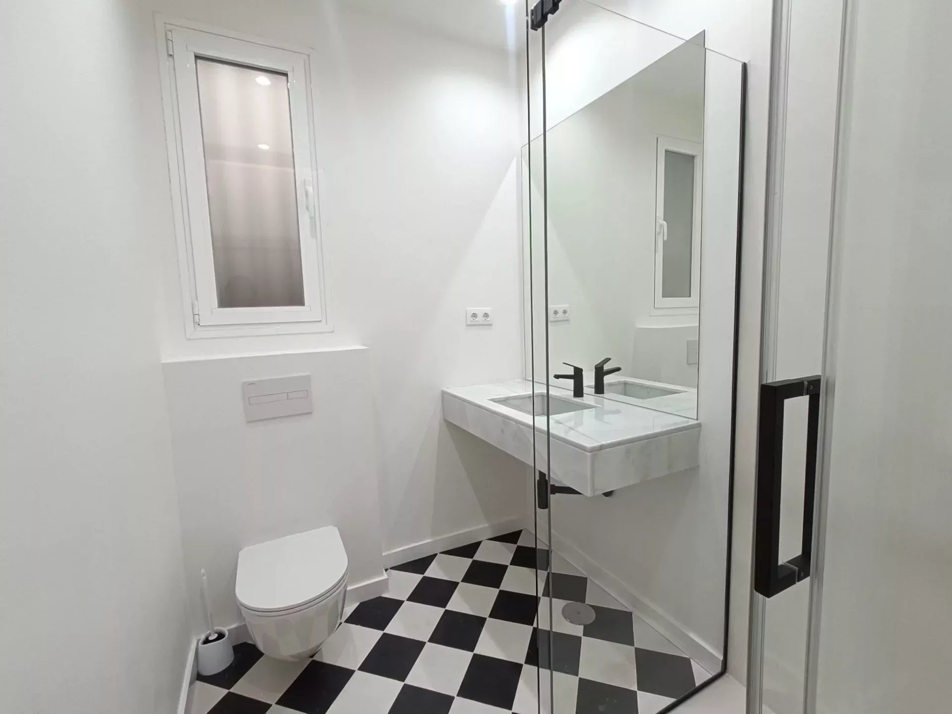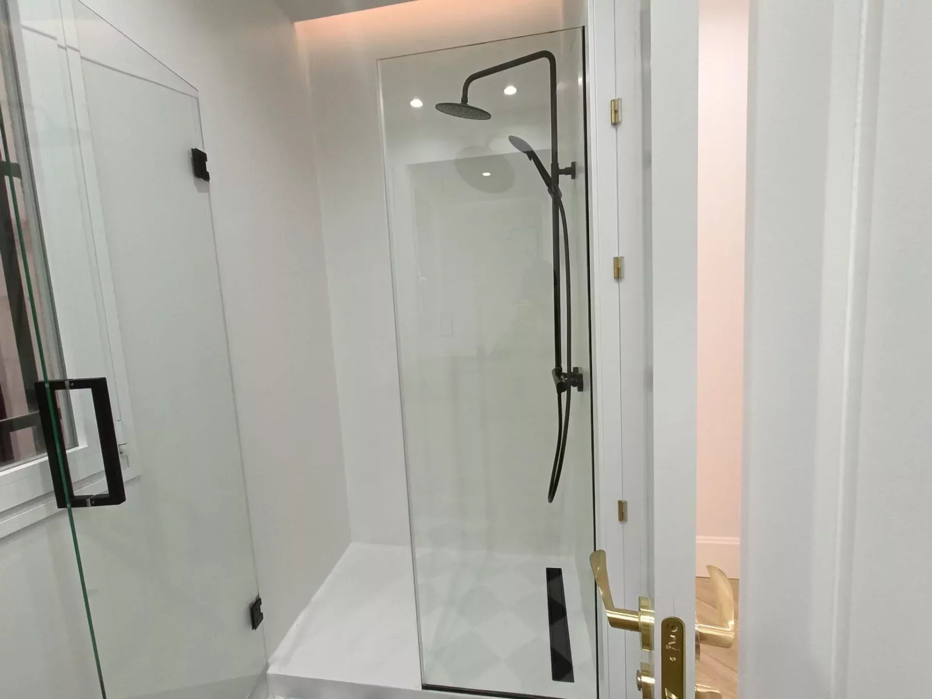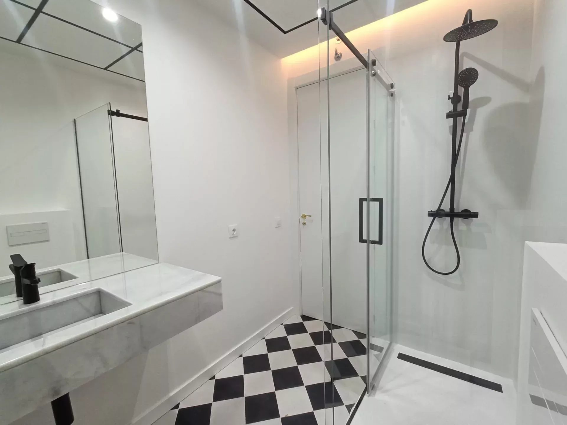 Salles de bains en marbre avec robinetterie noire, parquets en chêne, hauts plafonds, climatisation canalisée, vidéophone, portes coulissantes.