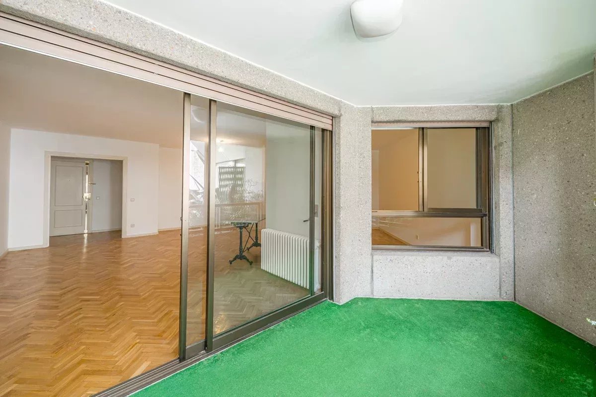 Le salon-salle à manger, entièrement extérieur, s'ouvre sur une charmante terrasse privée avec vue directe sur le parc récemment rénové de la résidence, avec des espaces verts, des bancs et des fontaines qui confèrent à la maison une atmosphère sereine et exclusive. La lumière naturelle, le silence et la vue font de cette pièce un refuge difficile à trouver dans un emplacement aussi central.