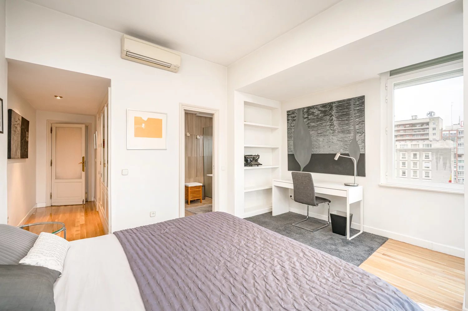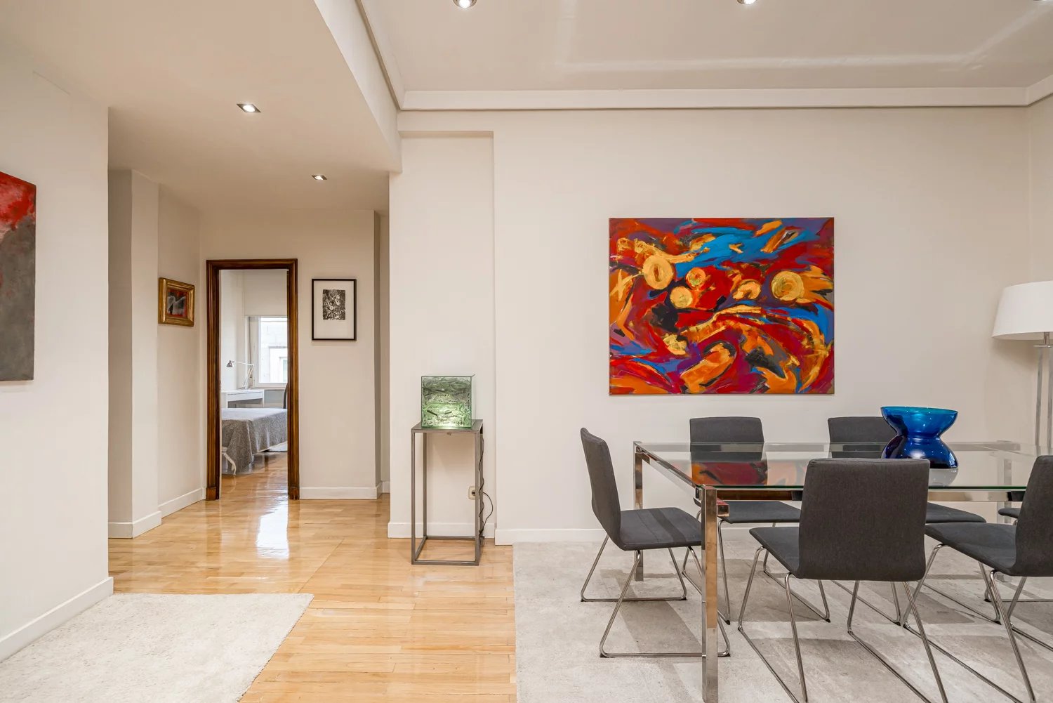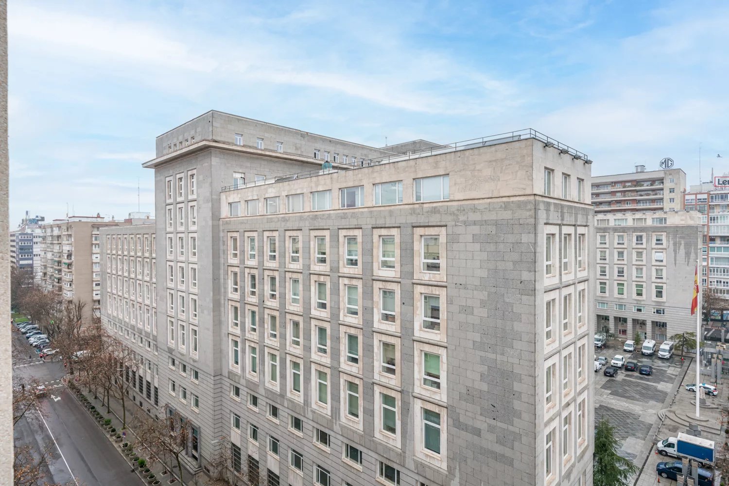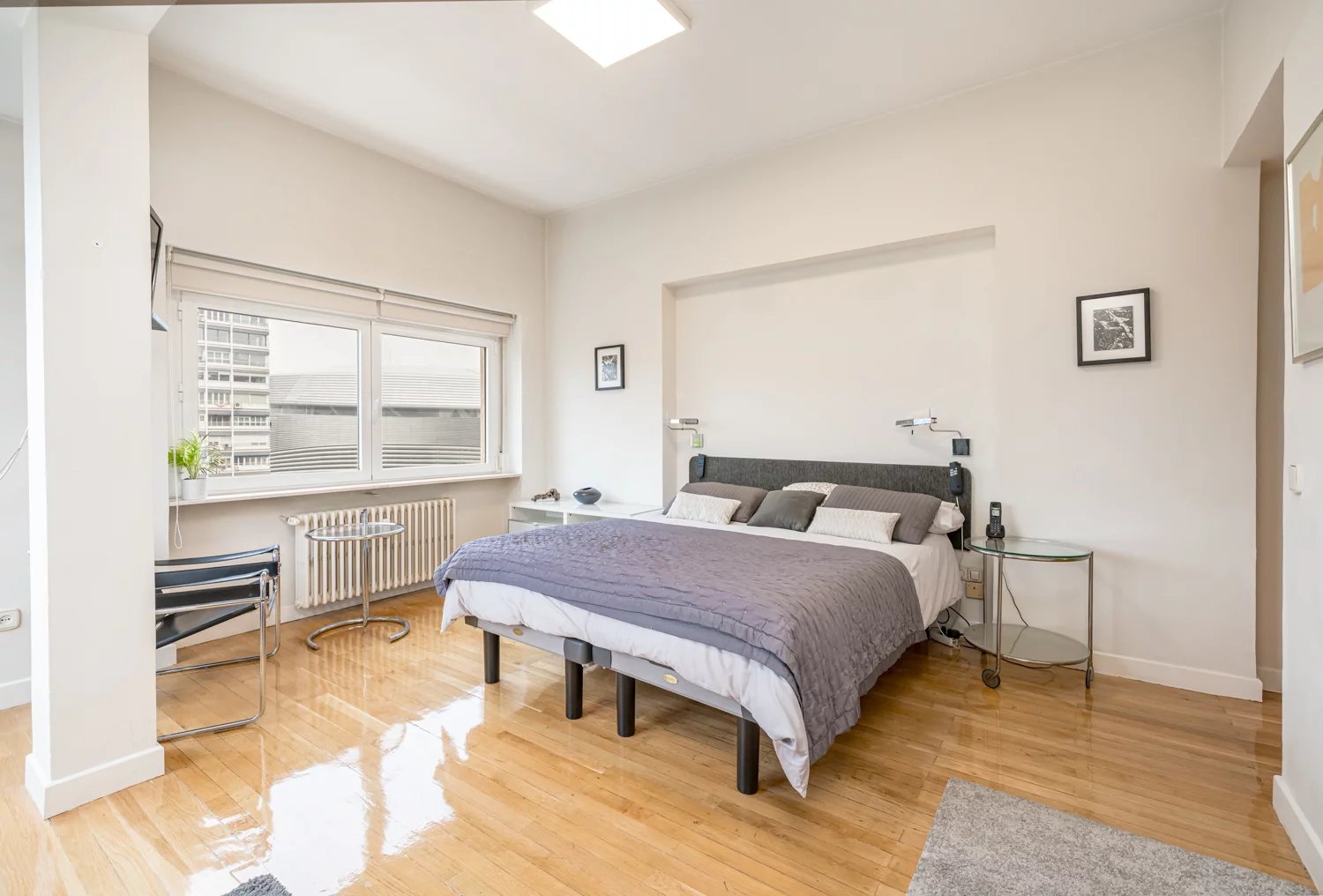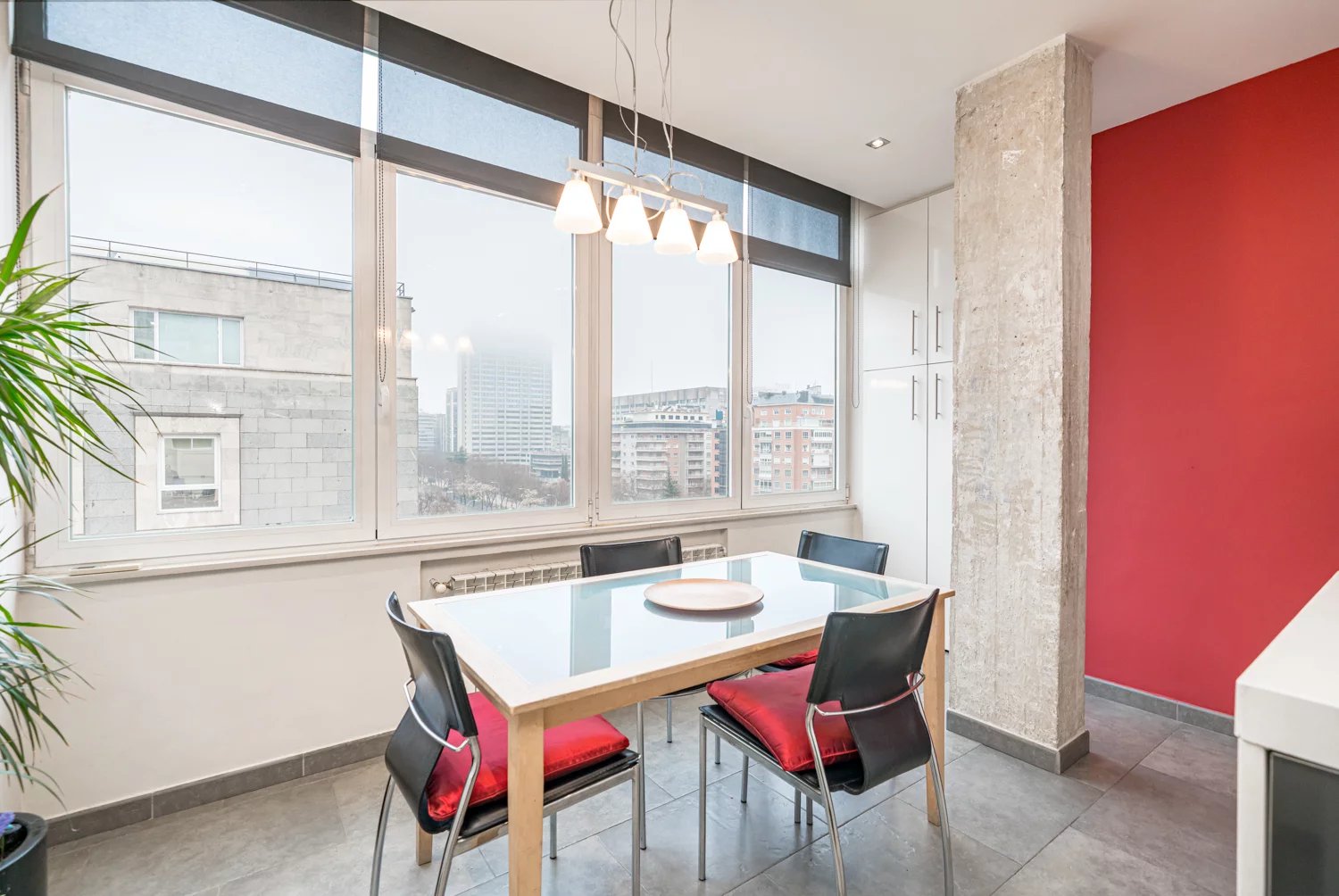Grâce à ses grandes baies vitrées, la lumière naturelle est omniprésente dans toutes les pièces, tant dans les espaces de vie que dans la cuisine, créant un lien permanent avec le paysage urbain et permettant de profiter de vues dégagées sur la Castellana, un véritable privilège dans ce quartier.