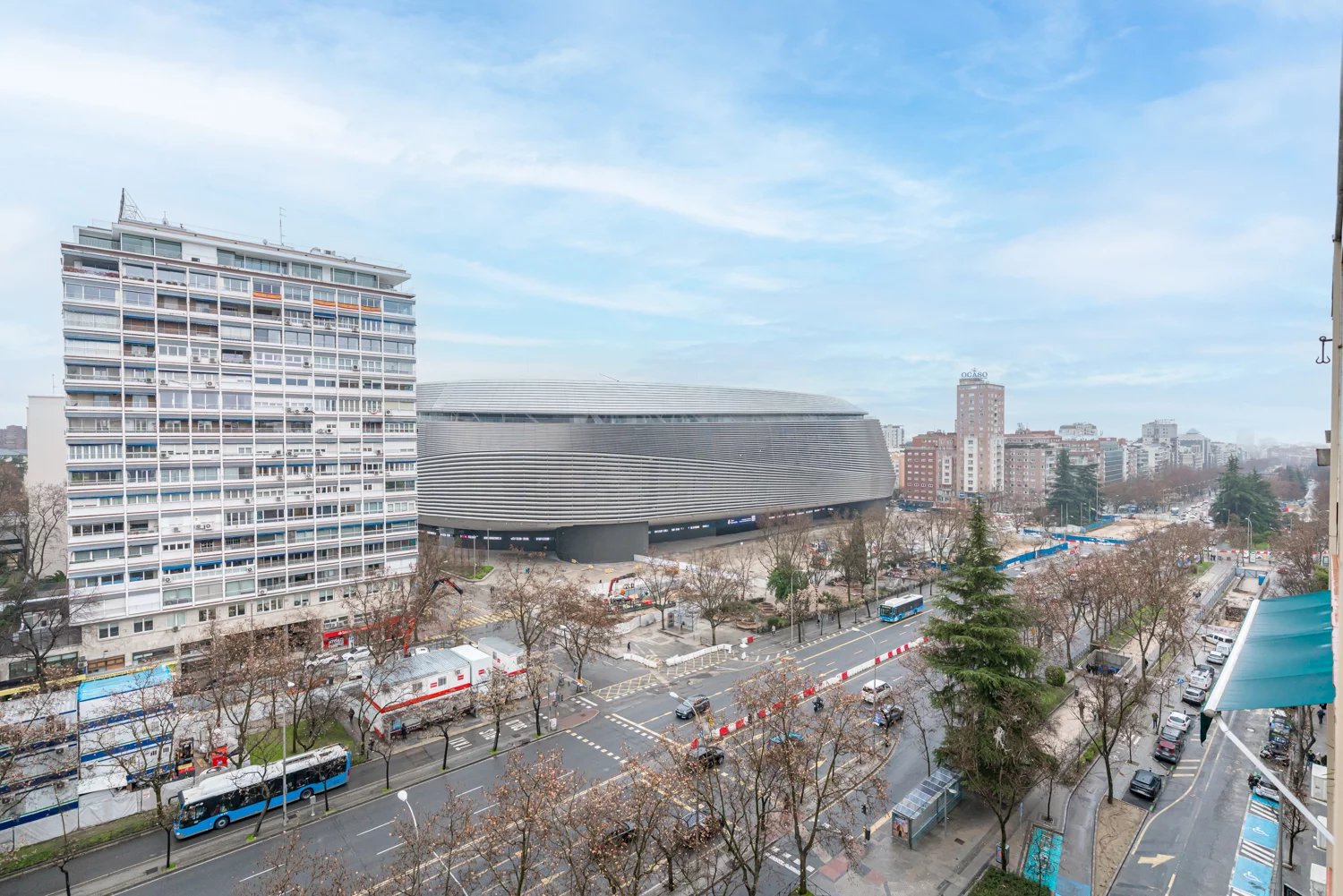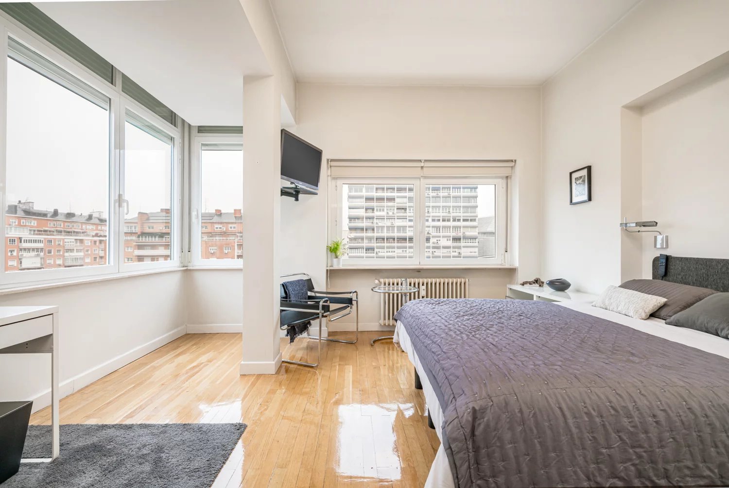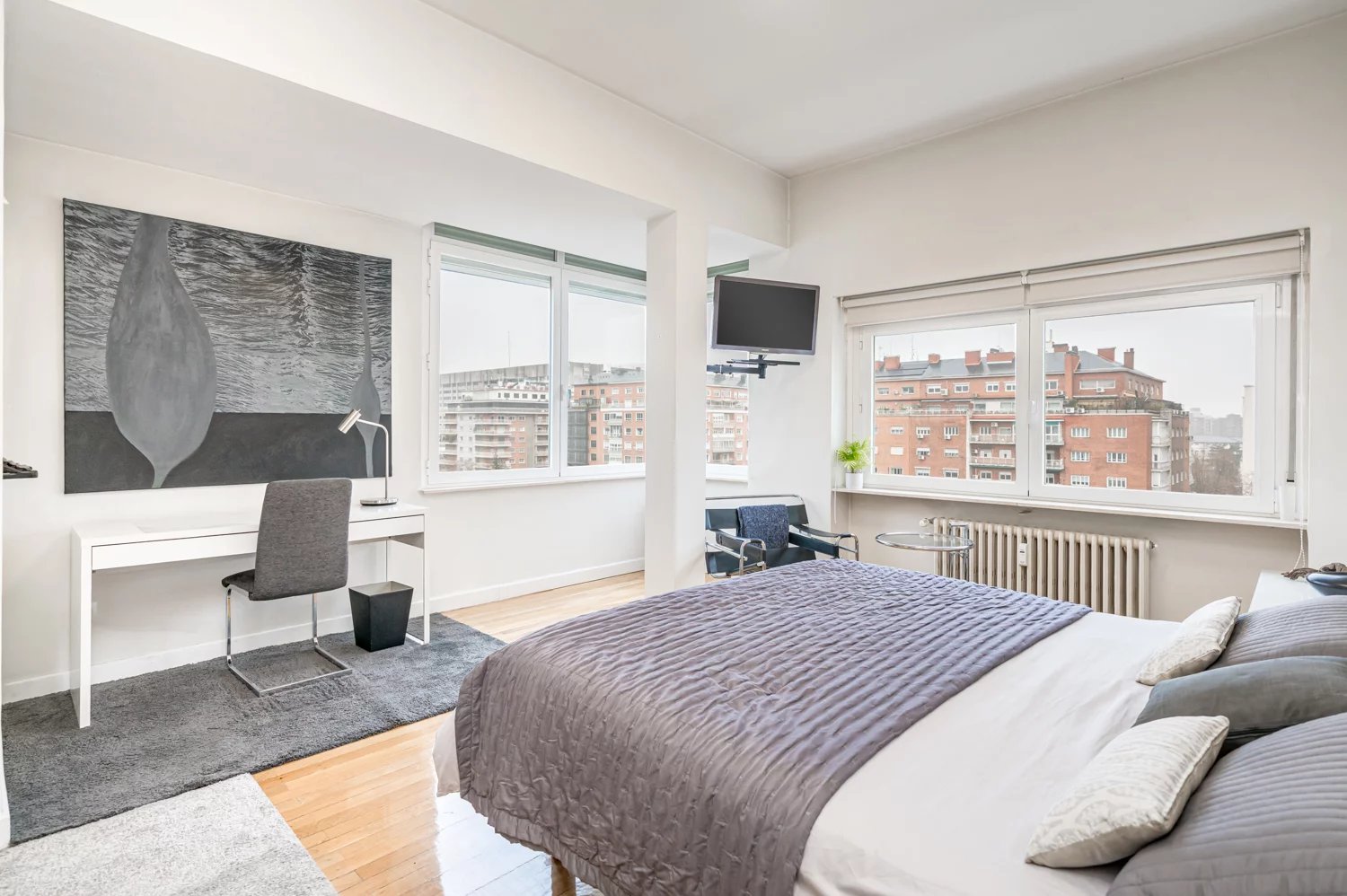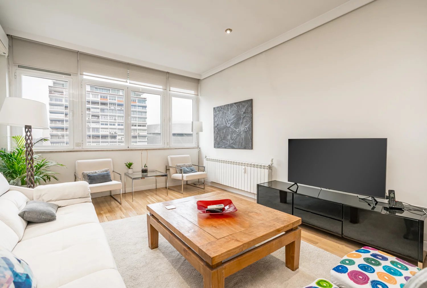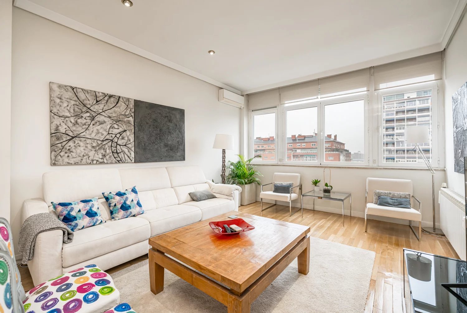 Grâce à ses grandes baies vitrées, la lumière naturelle est omniprésente dans toutes les pièces, tant dans les espaces de vie que dans la cuisine, créant un lien permanent avec le paysage urbain et permettant de profiter de vues dégagées sur la Castellana, un véritable privilège dans ce quartier.