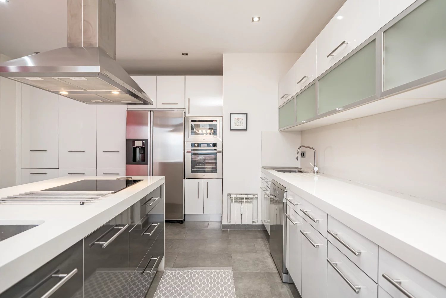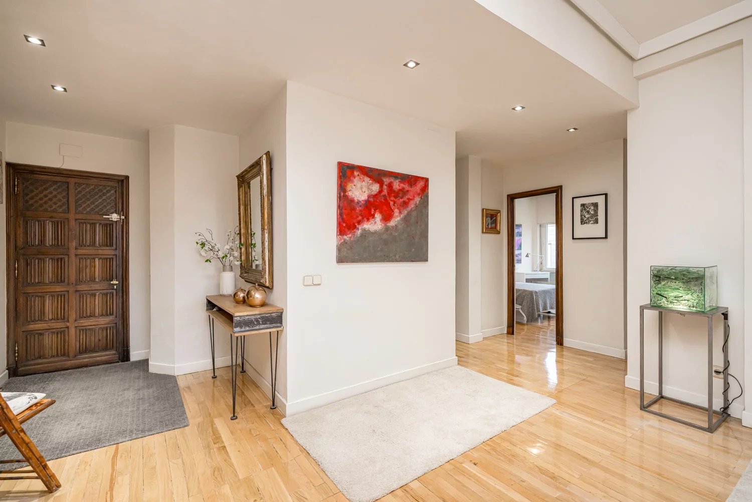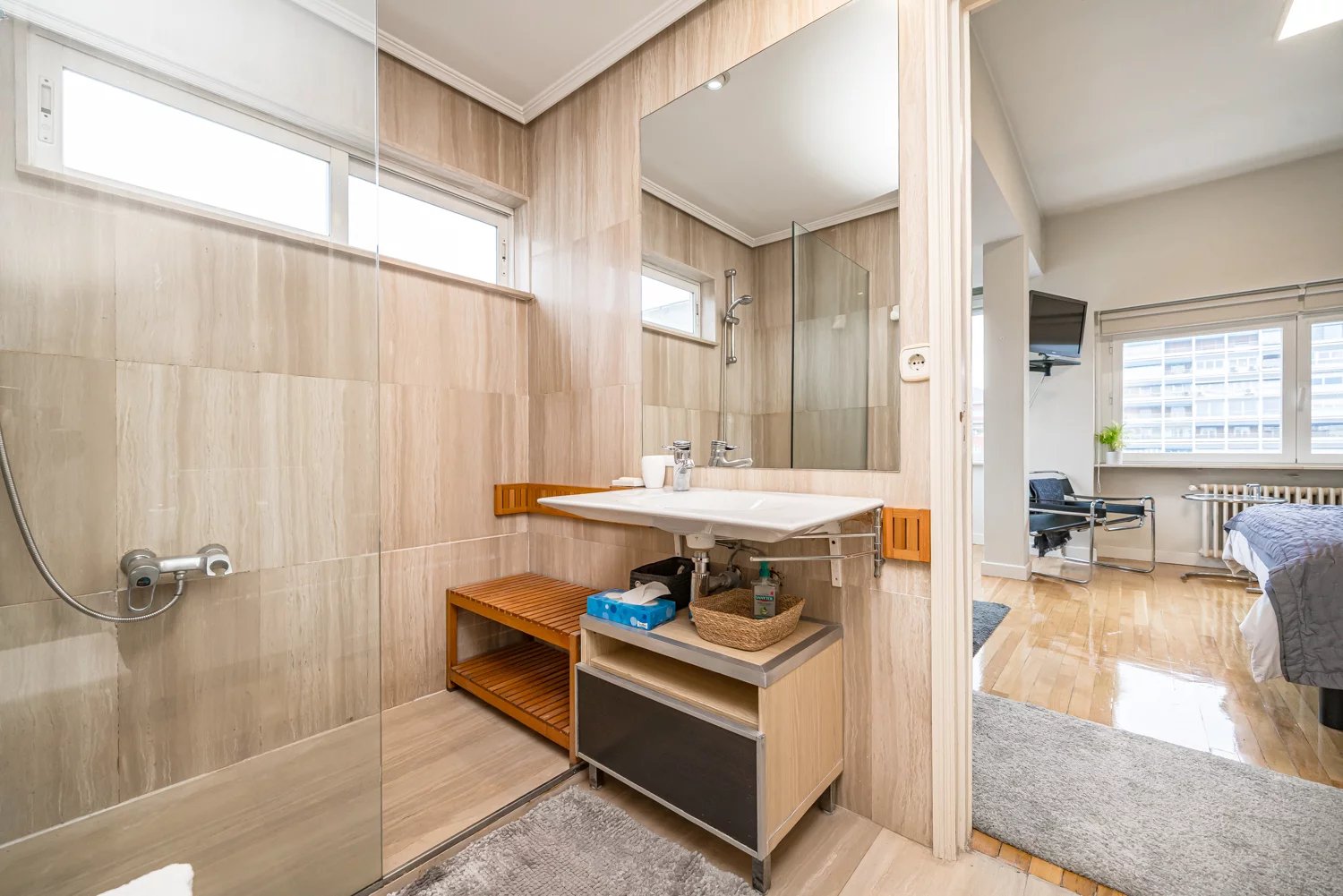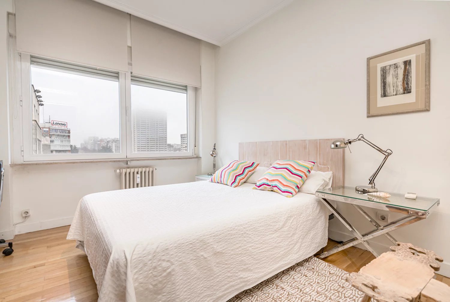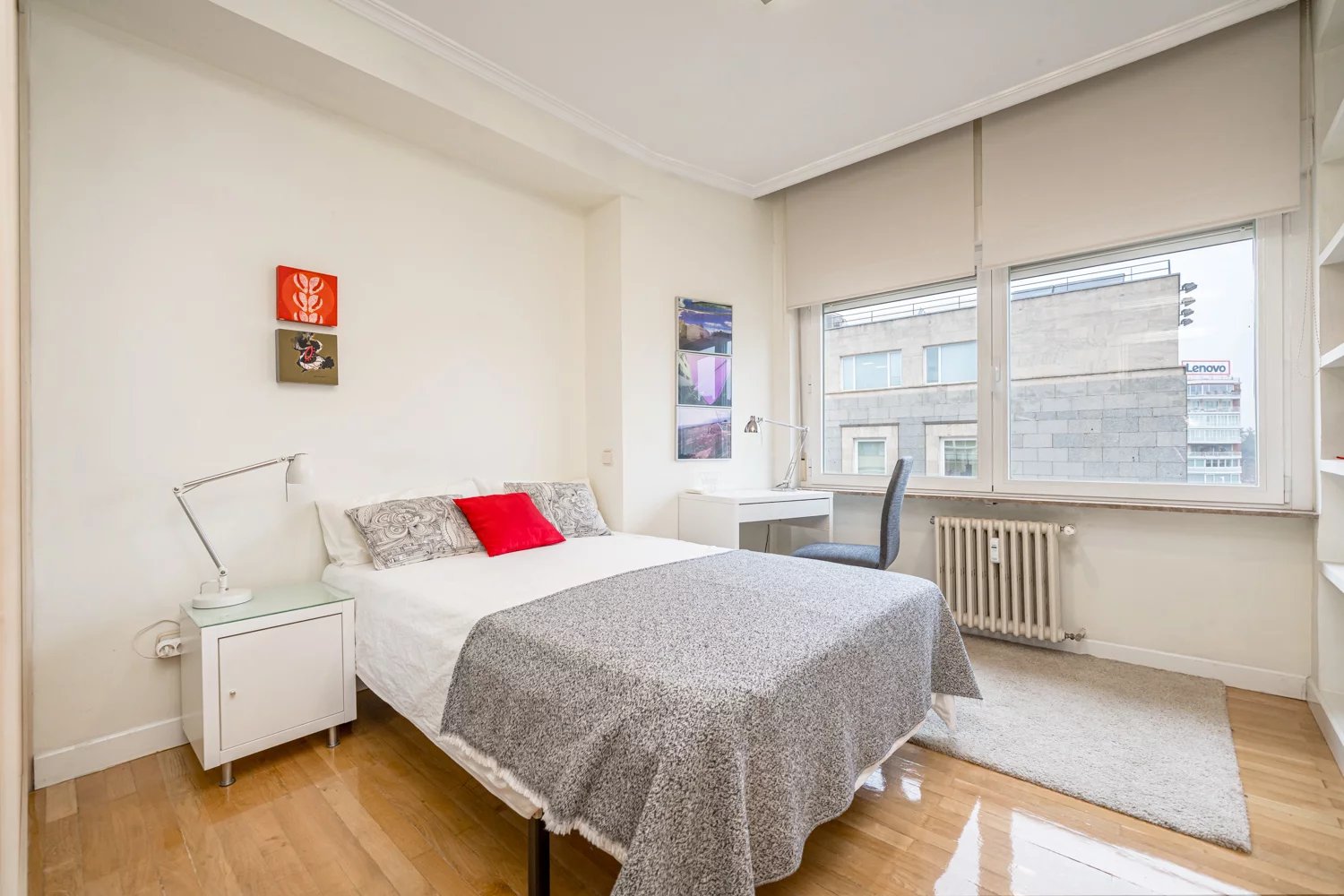 Grâce à ses grandes baies vitrées, la lumière naturelle est omniprésente dans toutes les pièces, tant dans les espaces de vie que dans la cuisine, créant un lien permanent avec le paysage urbain et permettant de profiter de vues dégagées sur la Castellana, un véritable privilège dans ce quartier.