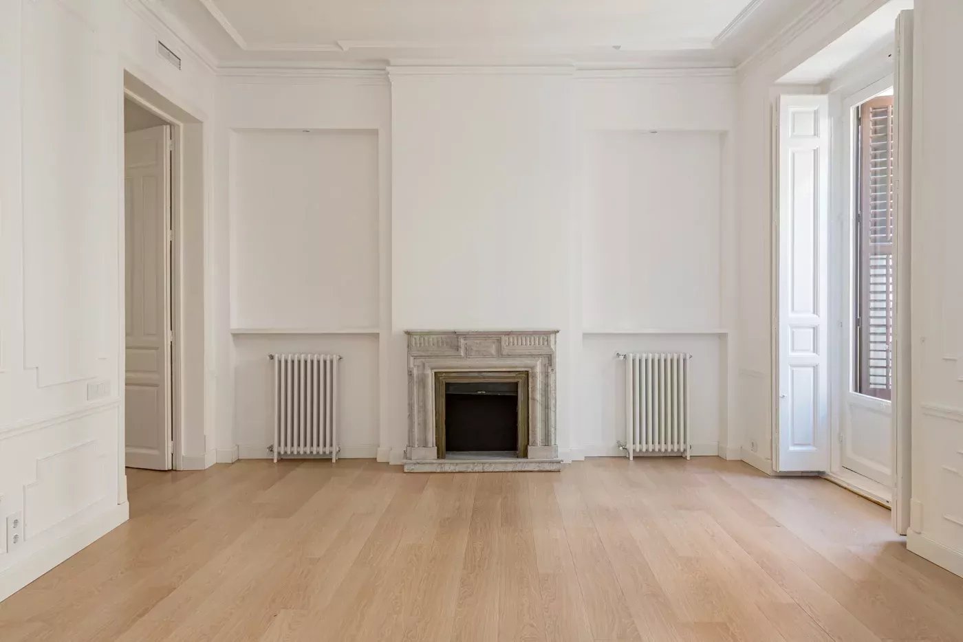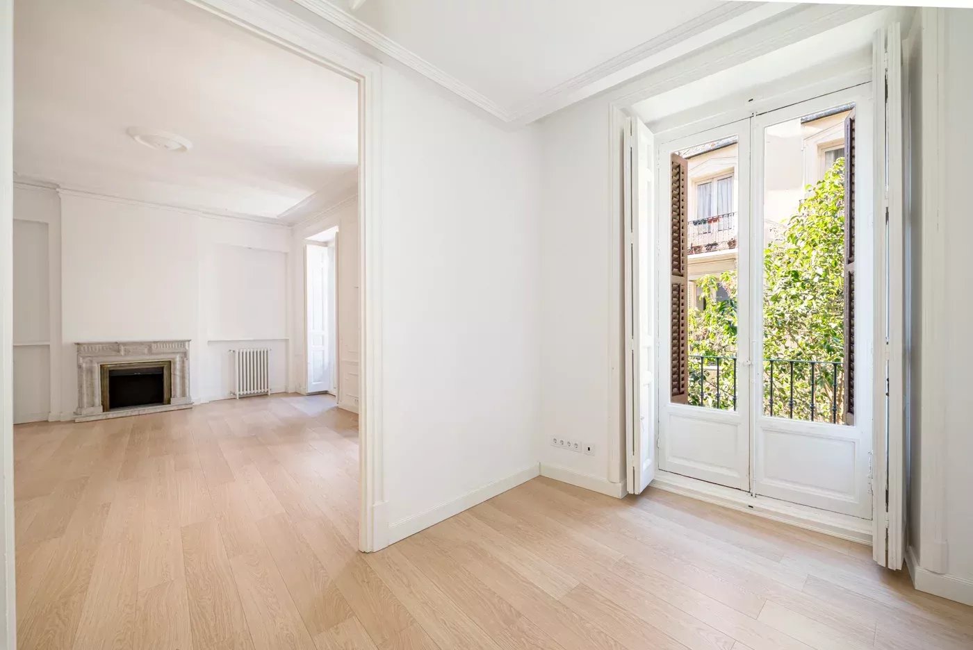 Ses quatre balcons extérieurs offrent une grande luminosité à la résidence et des vues sur le paysage urbain animé de Madrid.