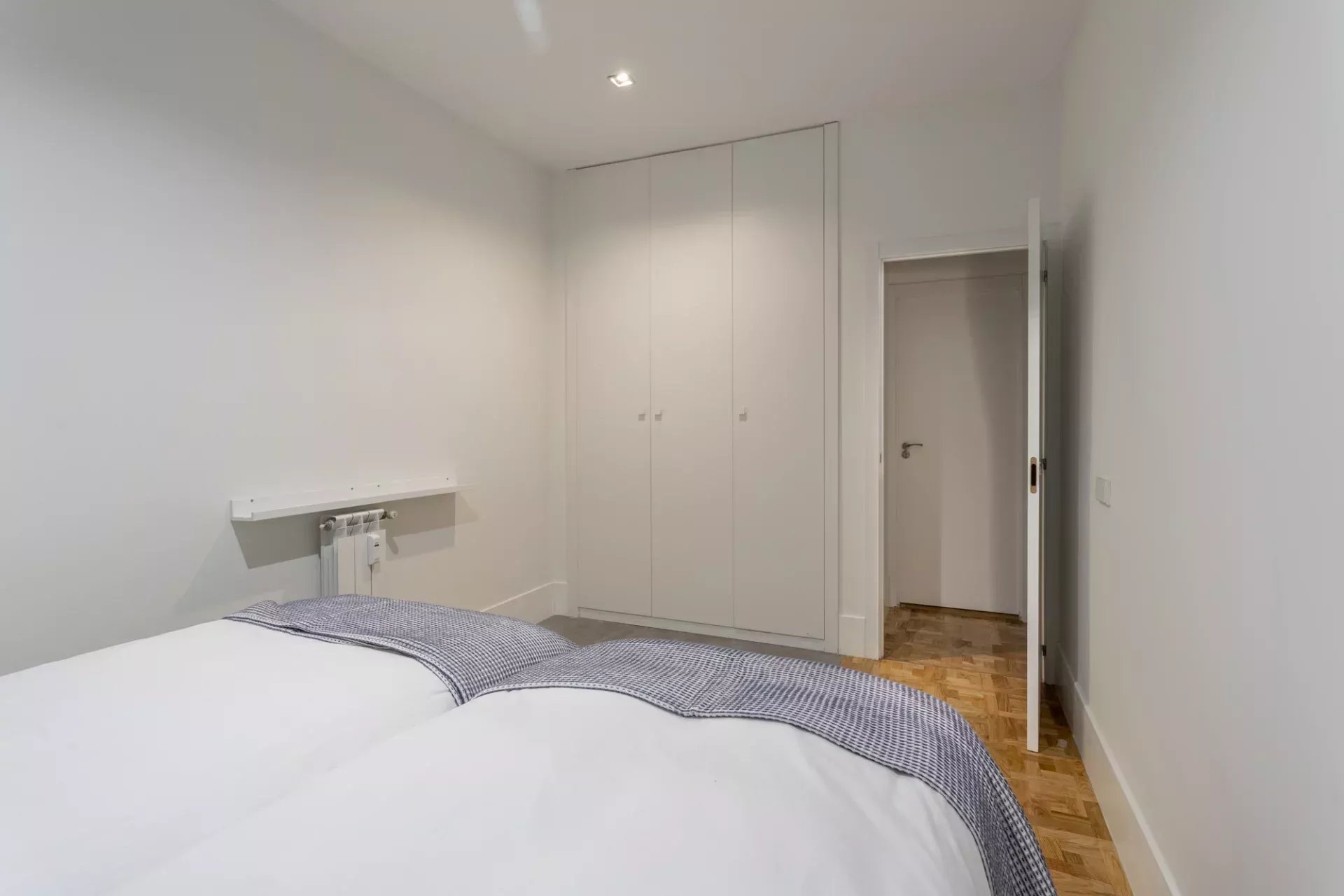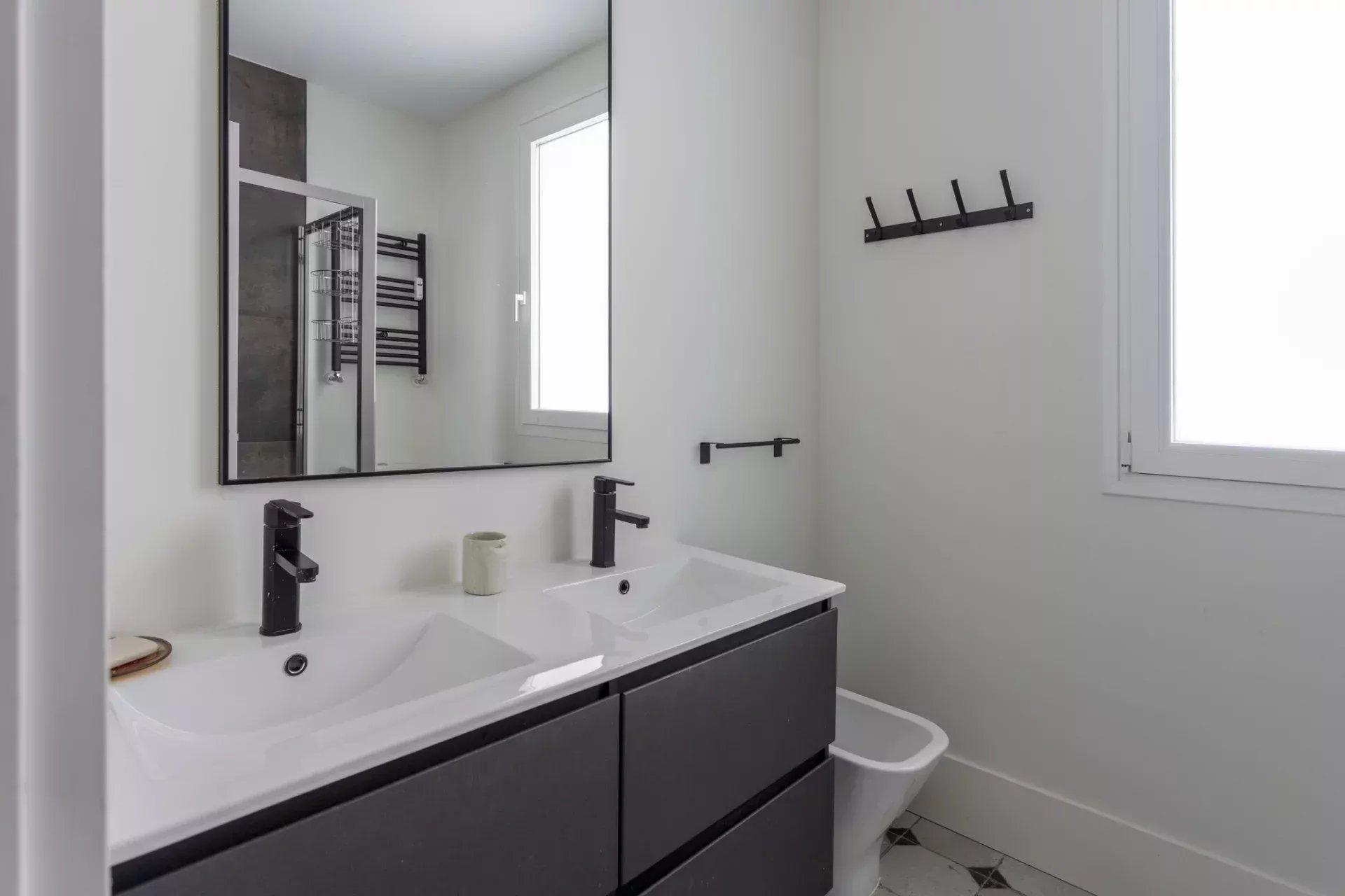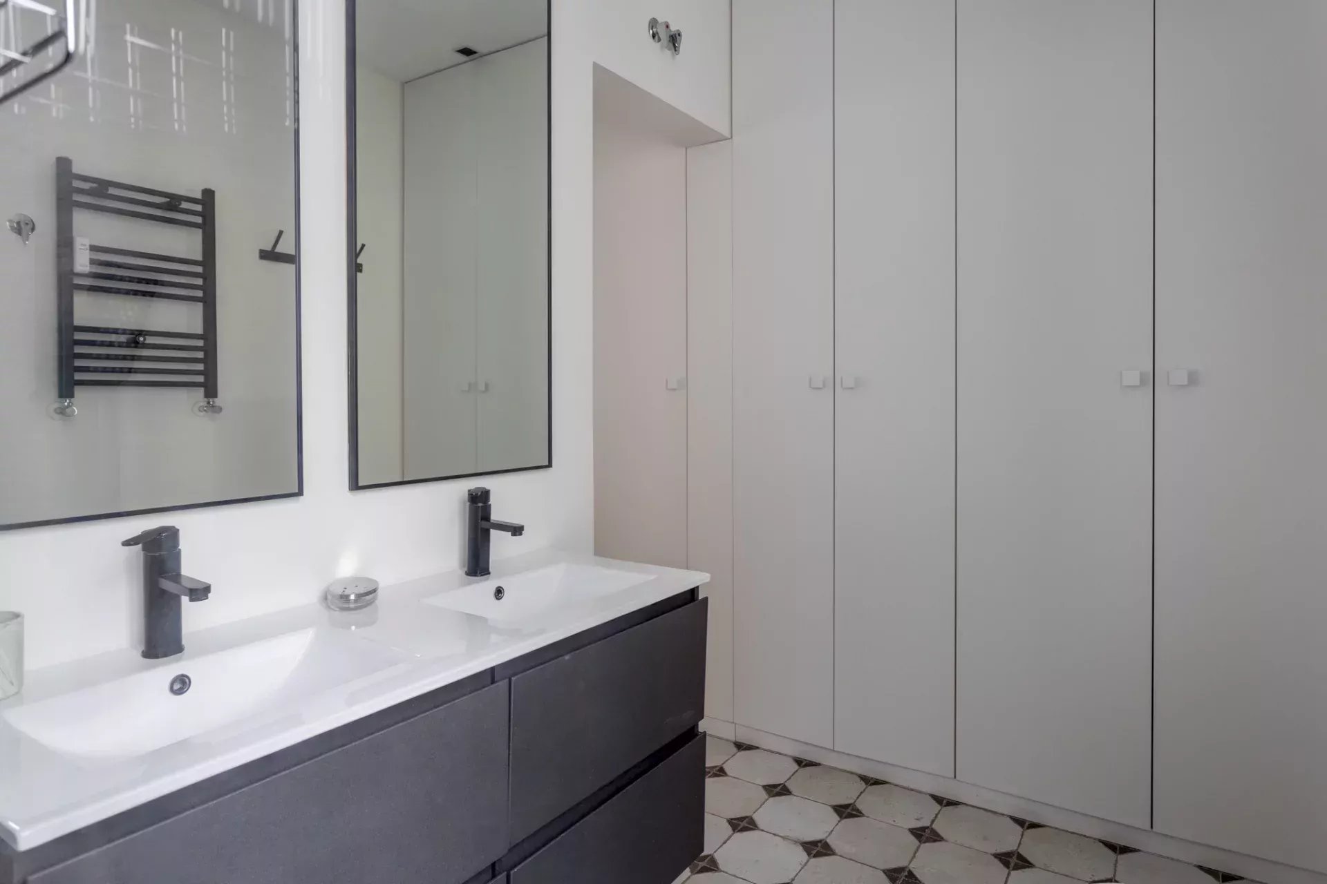 La partie nuit comprend deux chambres avec de grands placards intégrés. La chambre principale bénéficie d’une salle de bains en suite pour plus d’intimité, tandis qu’une seconde salle de bains complète dessert le reste du logement.