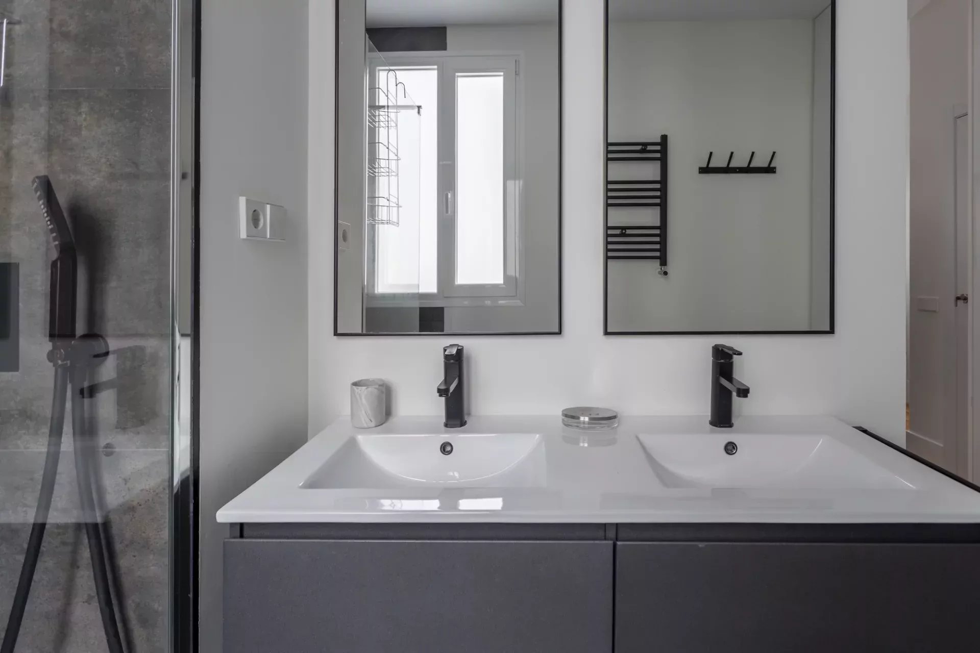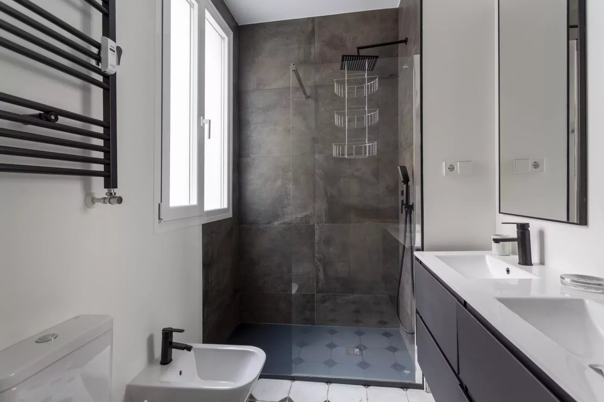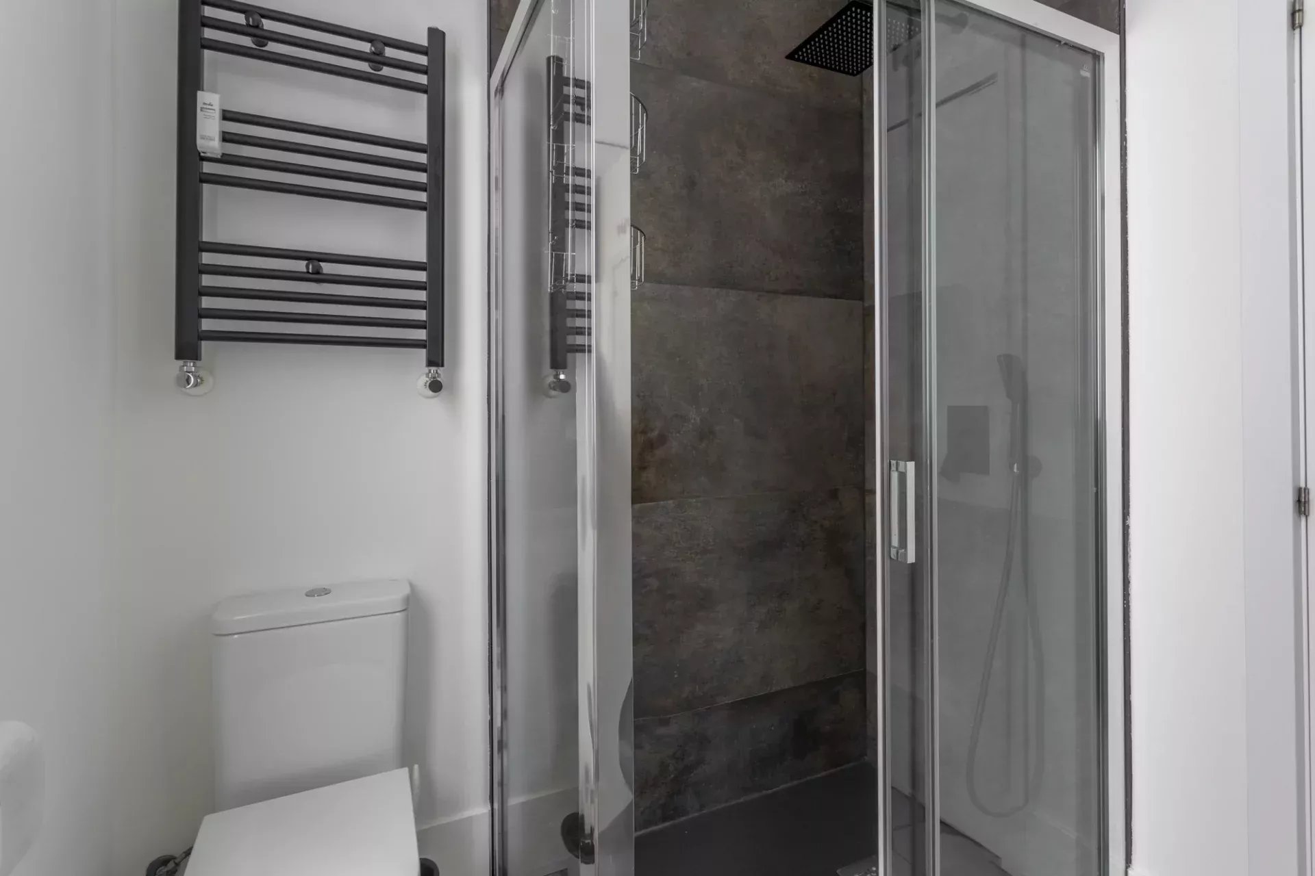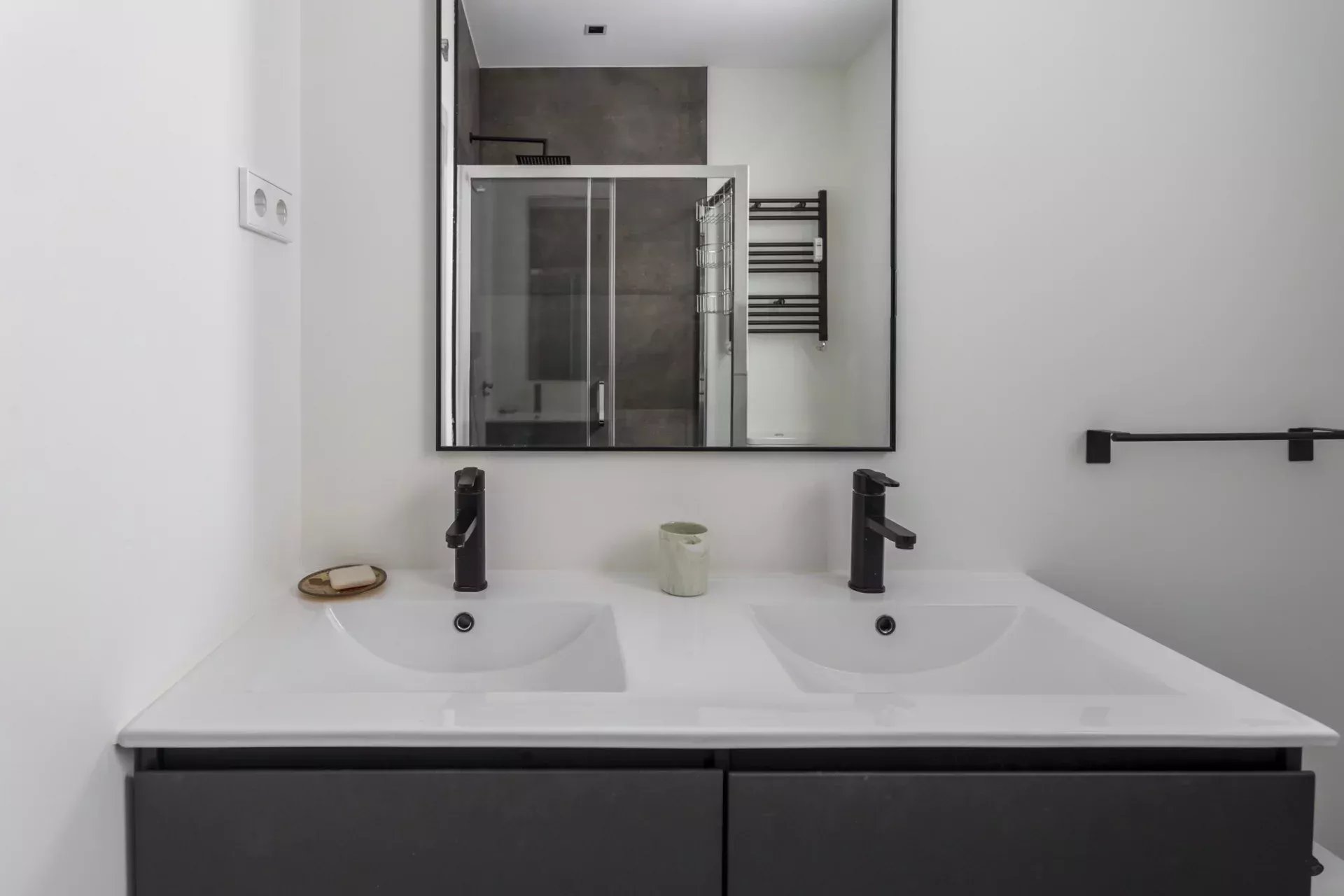 La partie nuit comprend deux chambres avec de grands placards intégrés. La chambre principale bénéficie d’une salle de bains en suite pour plus d’intimité, tandis qu’une seconde salle de bains complète dessert le reste du logement.
