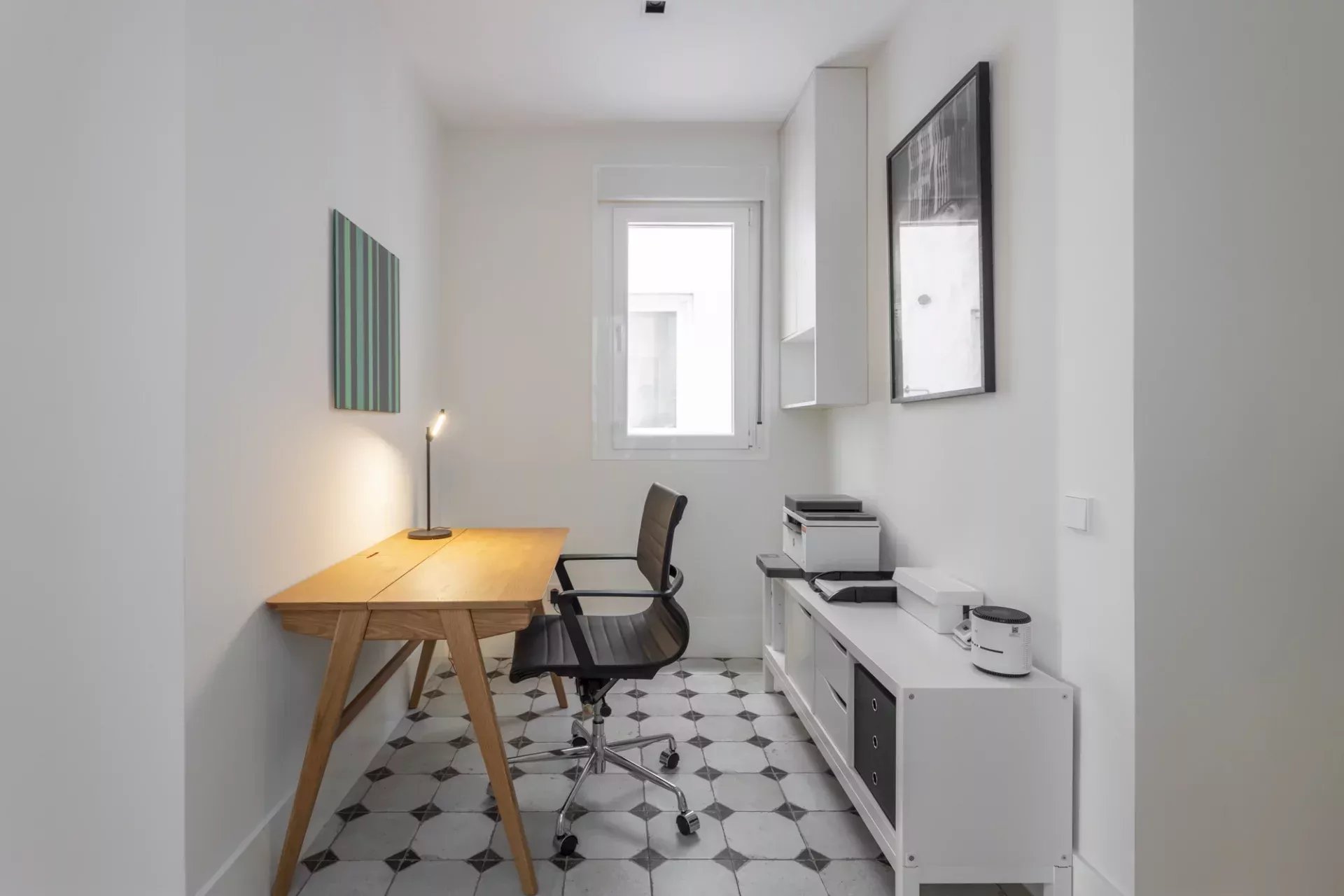 La cuisine, entièrement équipée avec électroménagers et ustensiles, dispose également d’un coin repas pour plus de fonctionnalité au quotidien. Un espace bureau complète l’ensemble.