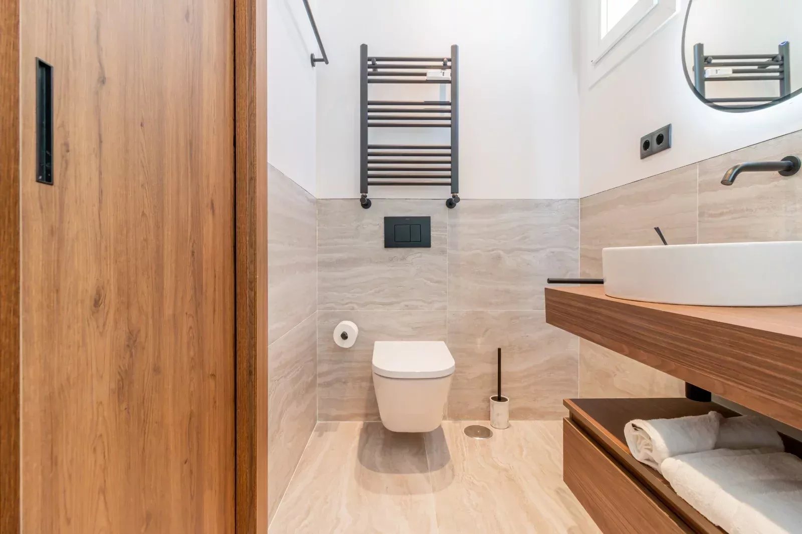 La zone nuit comprend trois chambres, chacune avec sa salle de bains en suite, garantissant intimité et confort. Une toilette invités complète l’agencement intérieur.