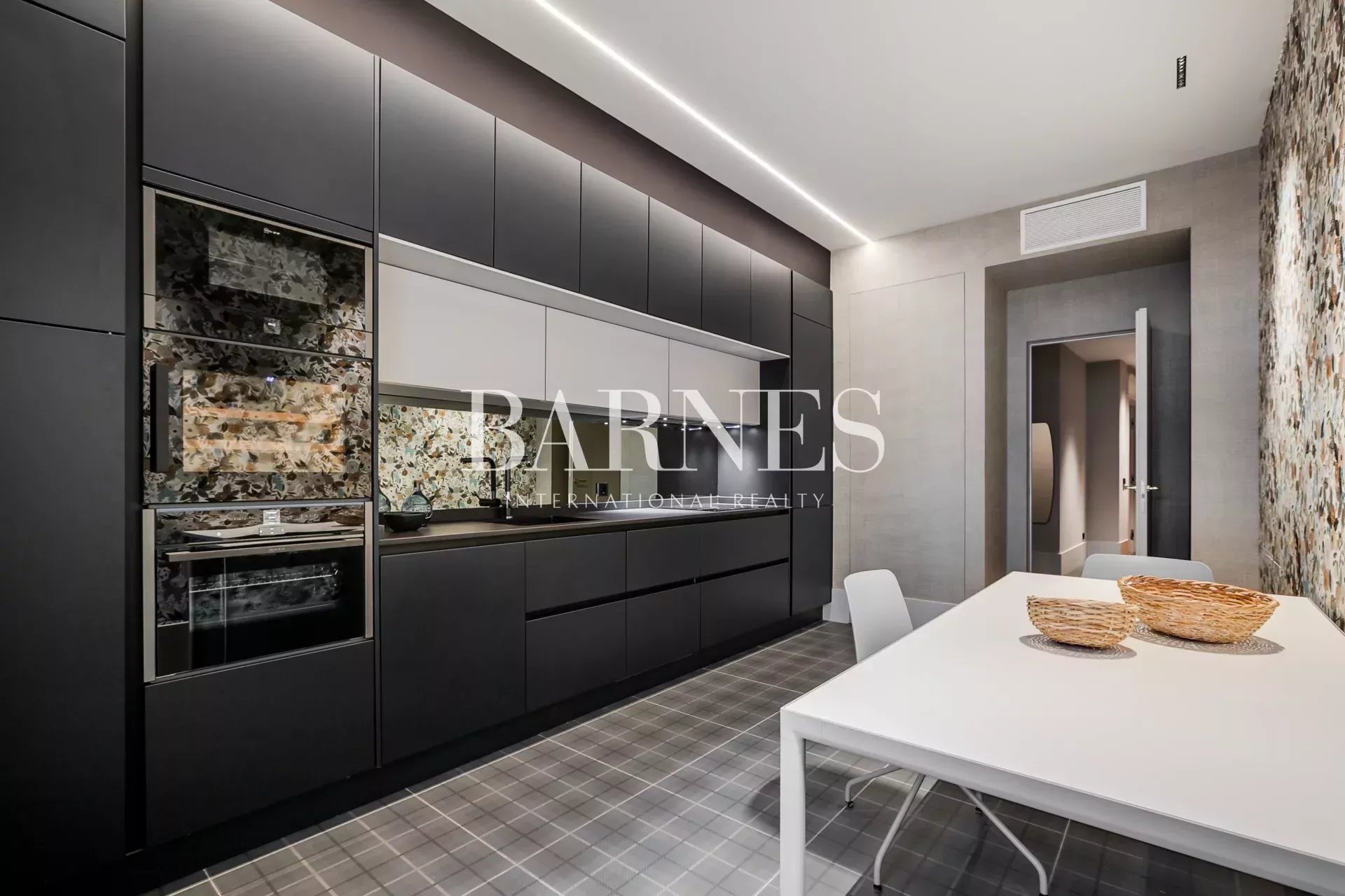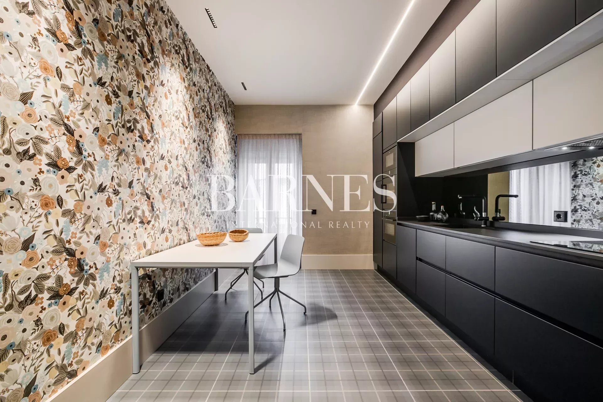 Le vaste salon-salle à manger, doté de balcons donnant sur la rue Serrano, est livré entièrement équipé avec des rideaux sur mesure, des luminaires design et un salon indépendant avec Smart TV 75”. La cuisine, avec coin repas, est équipée d’électroménagers intégrés de haute qualité, d’un équipement complet de cuisine et de petits appareils électroménagers.