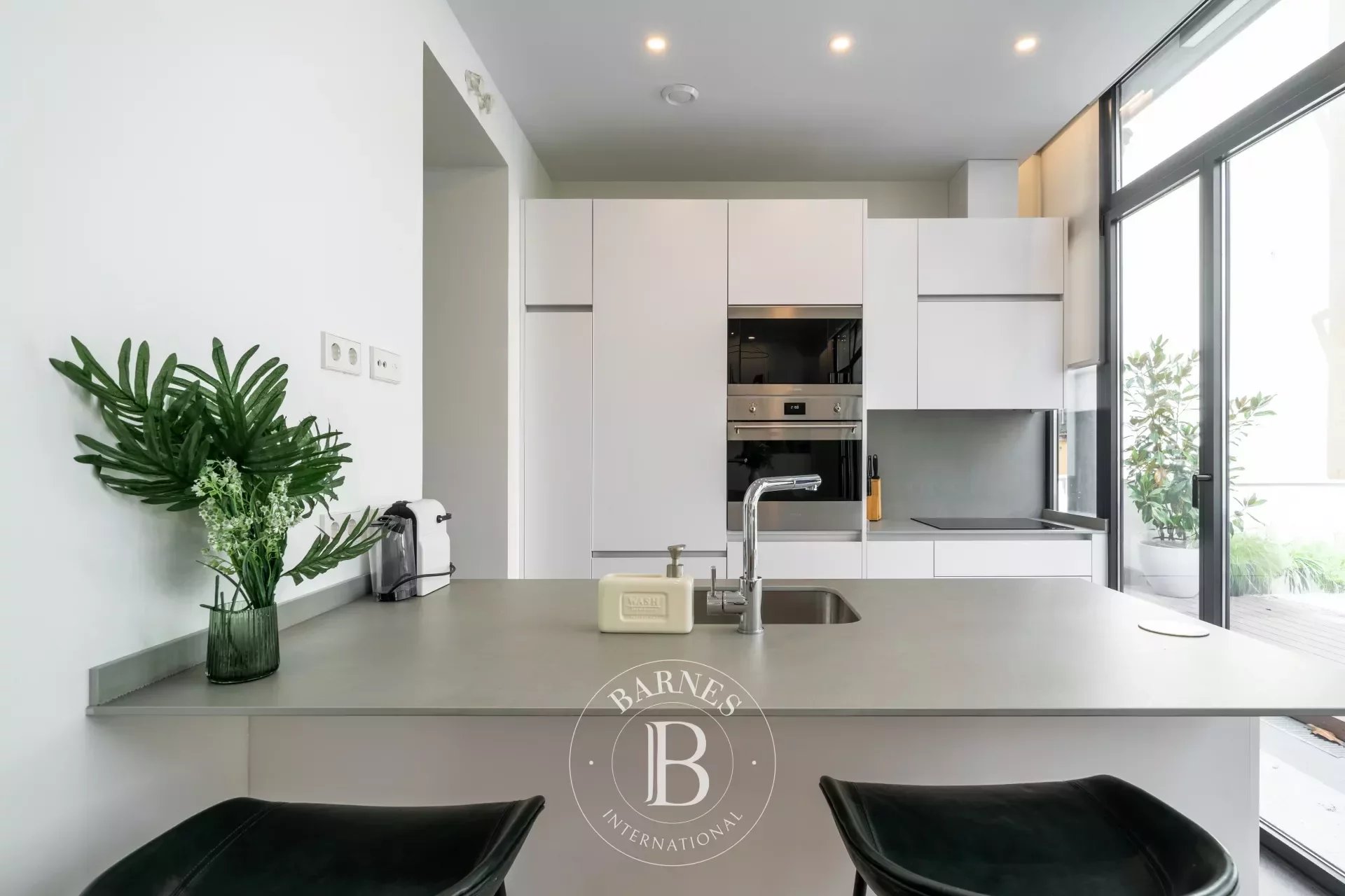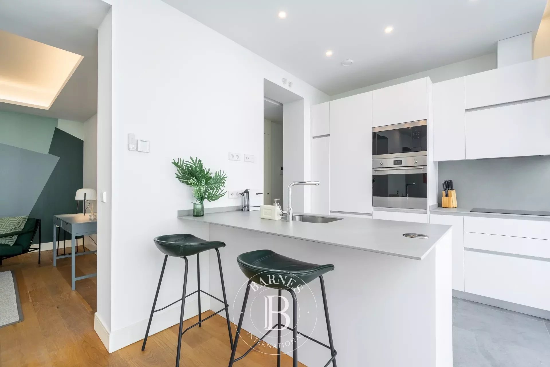 La cuisine semi-ouverte est équipée de tous les électroménagers nécessaires et d’un bar américain aux tons blancs, en harmonie avec le salon. Une configuration en phase avec la demande de biens de prestige en location dans le Barrio de Salamanca, où praticité et style priment.