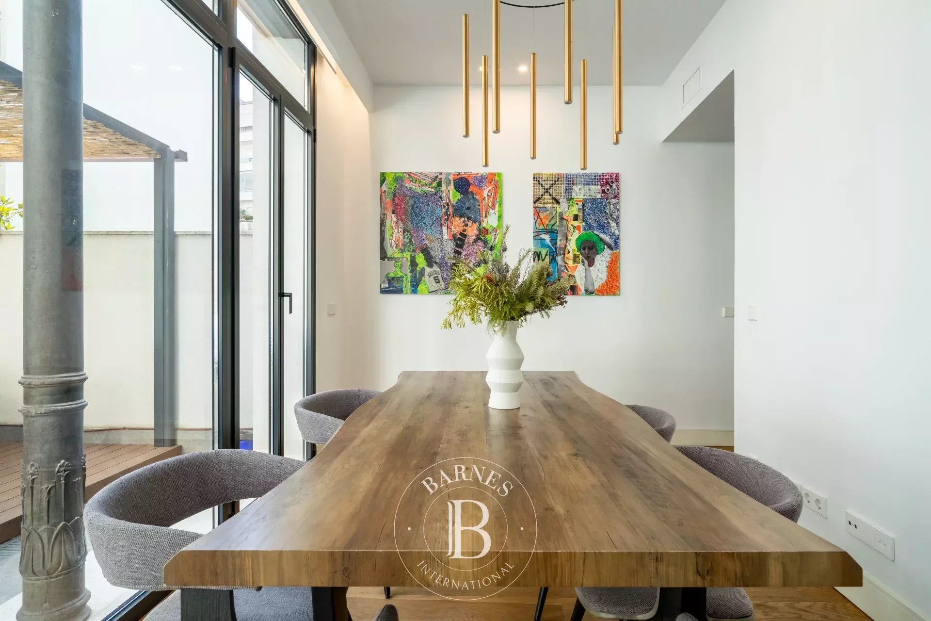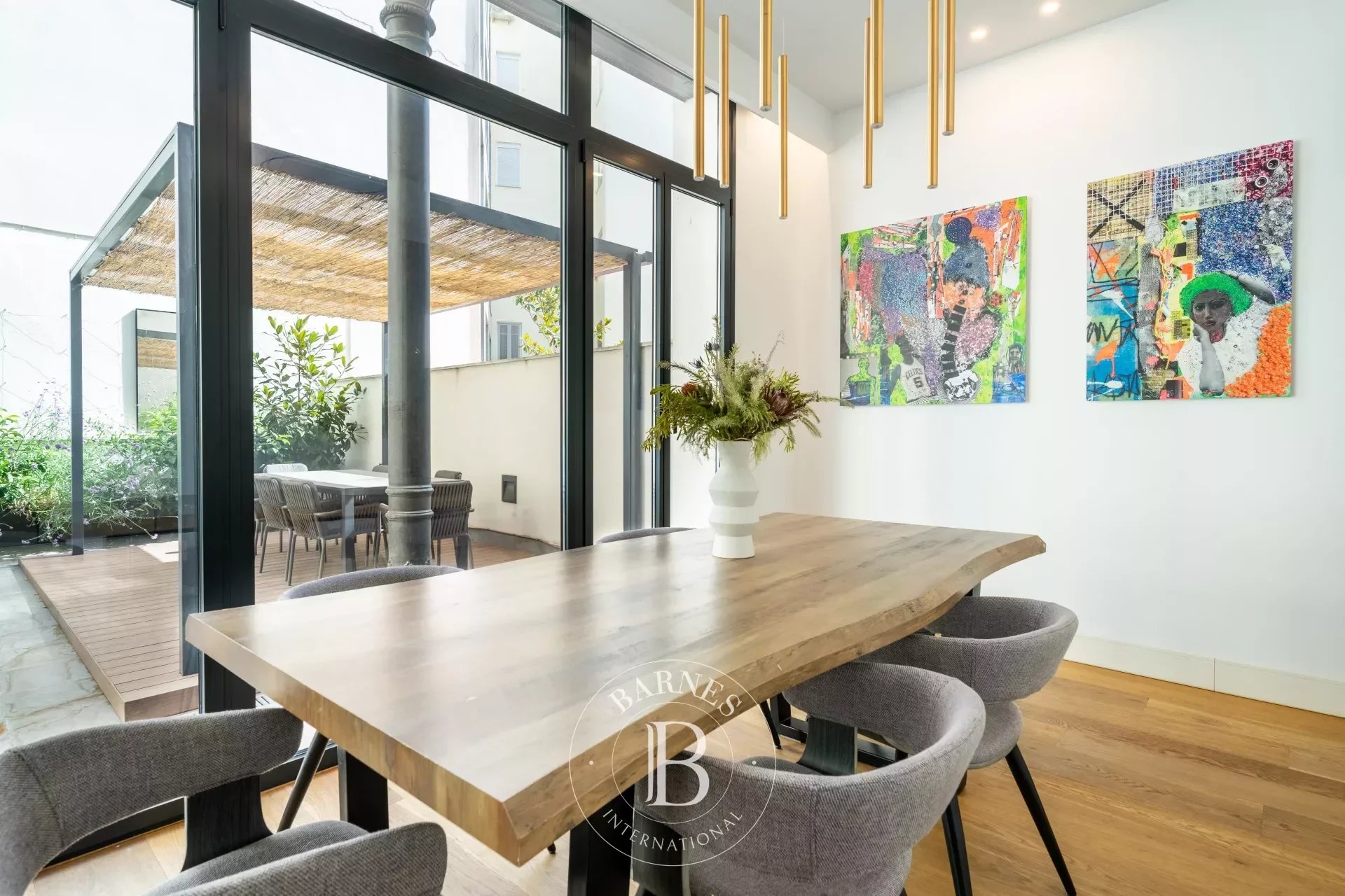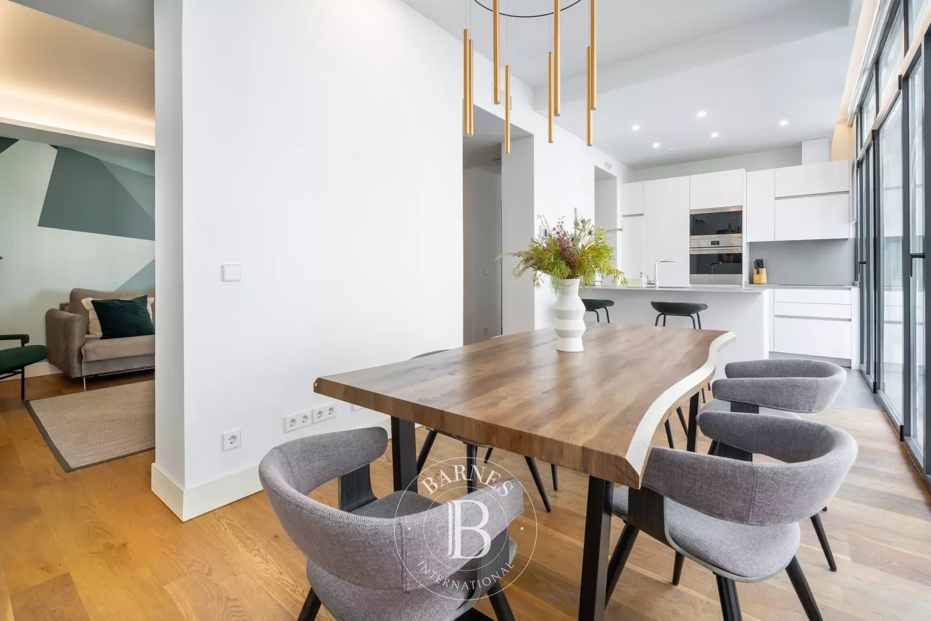 L’intérieur combine espaces ouverts, mobilier moderne et touches de design à l’inspiration romantique, créant une atmosphère fonctionnelle et chaleureuse. Le vaste séjour-salle à manger, avec sols en bois naturel, dispose d’une table pour six convives et d’un éclairage soigné—idéal au quotidien comme pour recevoir.