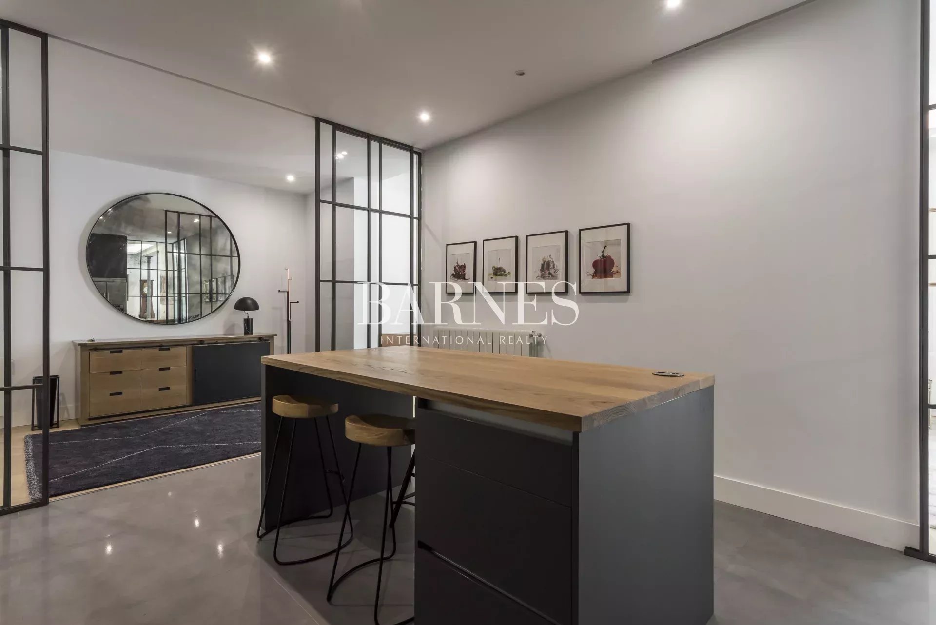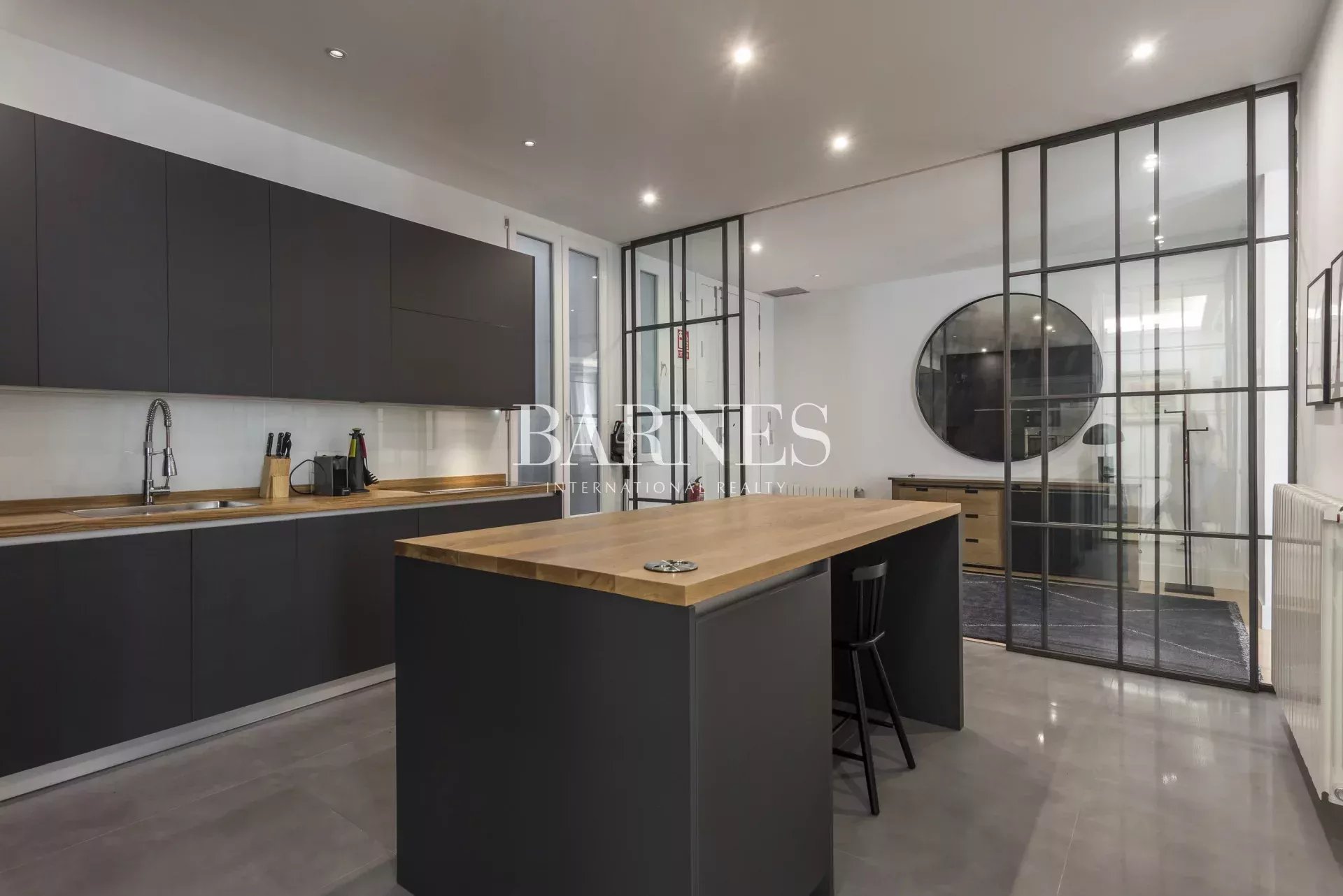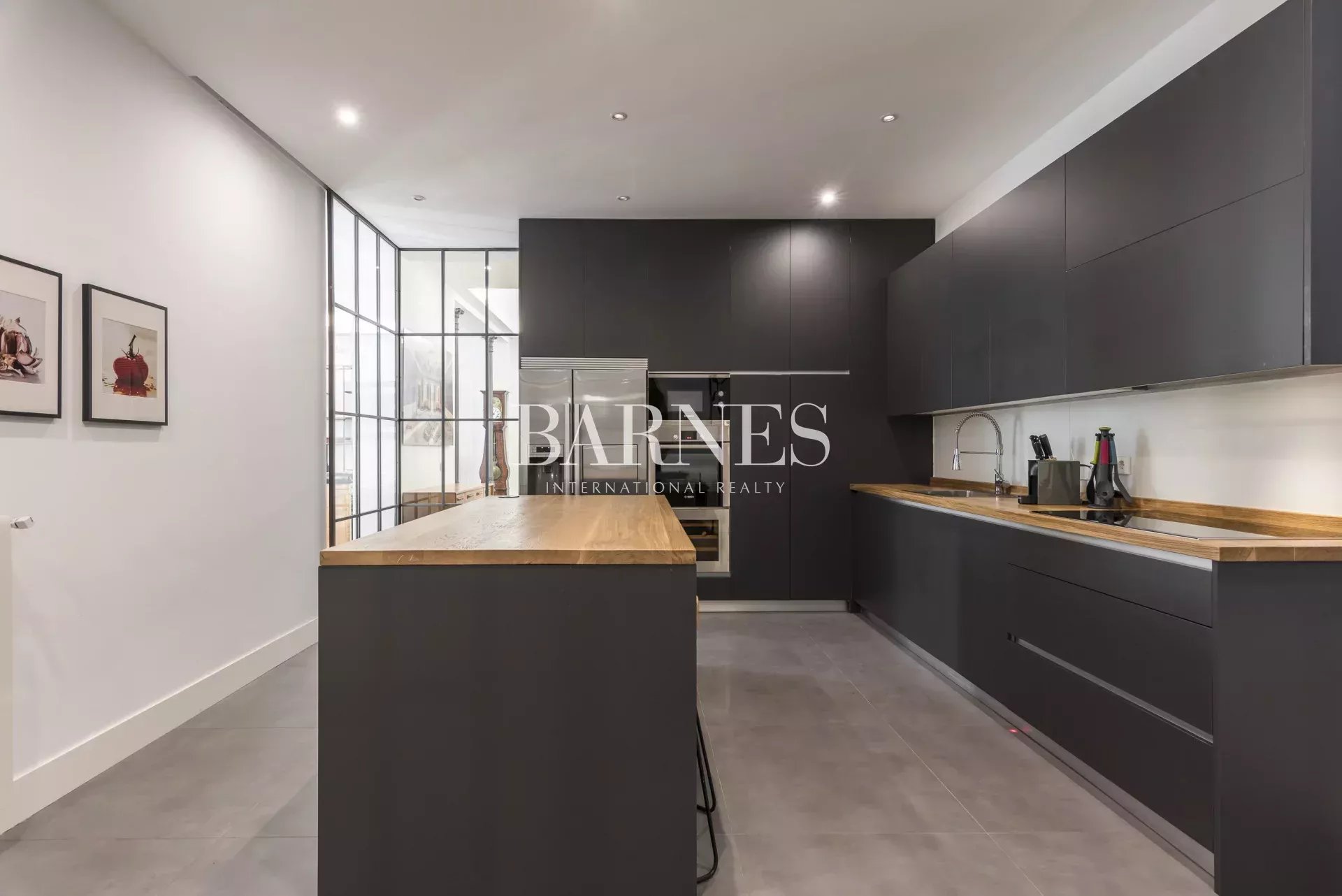 La cuisine, intégrée au salon mais séparée par des portes en verre élégantes, est équipée d'appareils électroménagers haut de gamme et d'ustensiles de cuisine, et comprend un espace bureau et une buanderie avec lave-linge séchant.