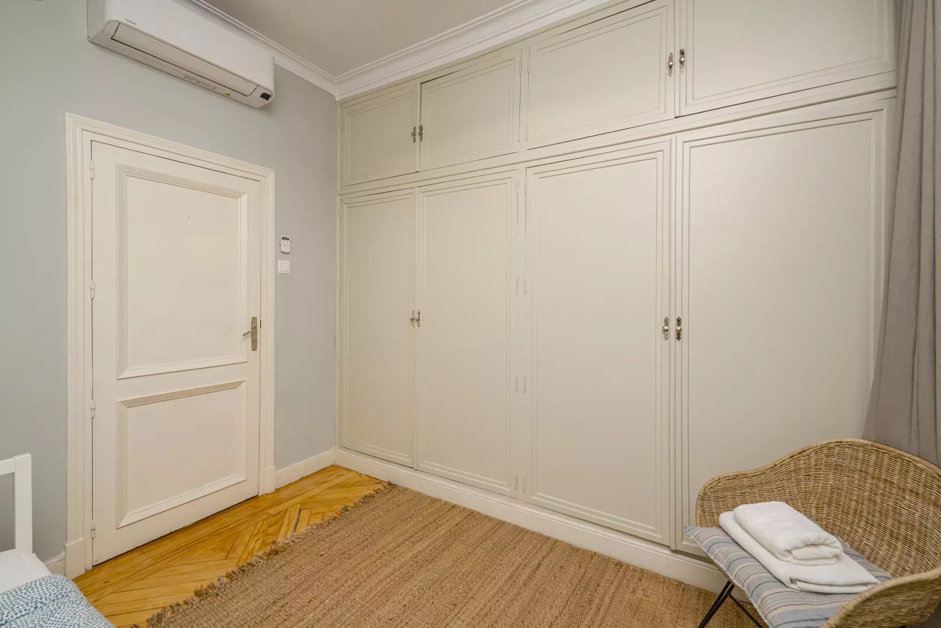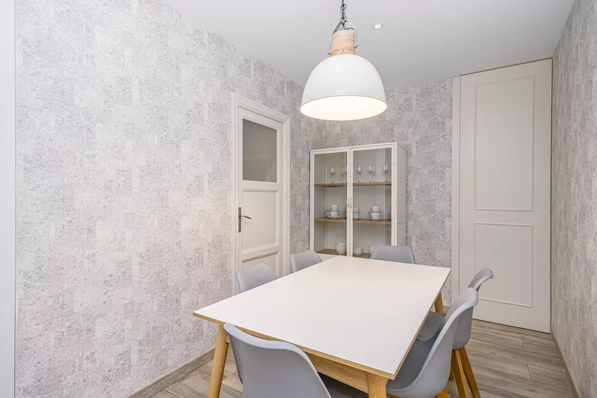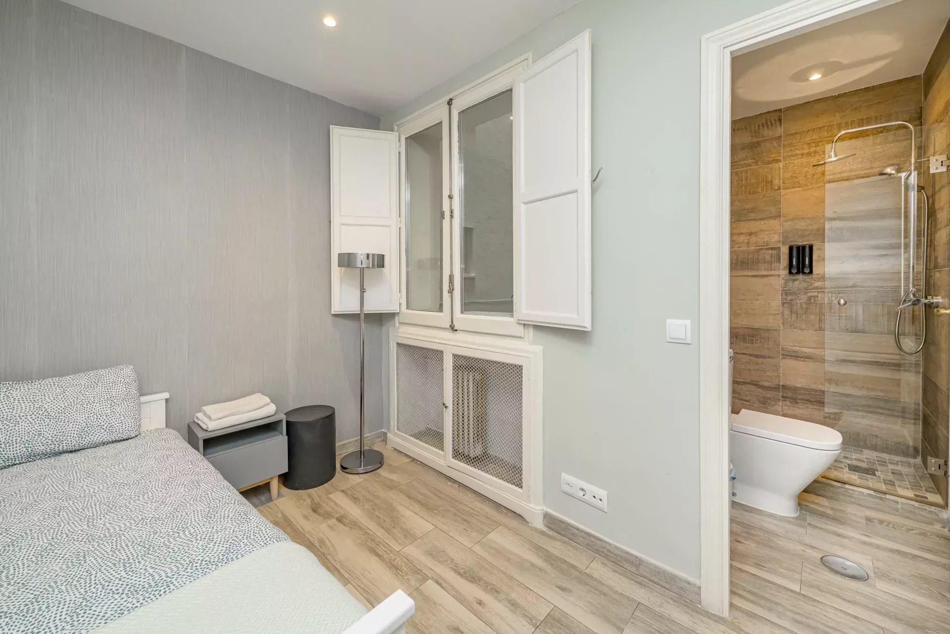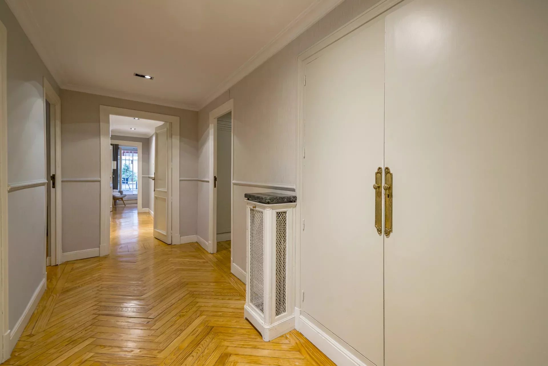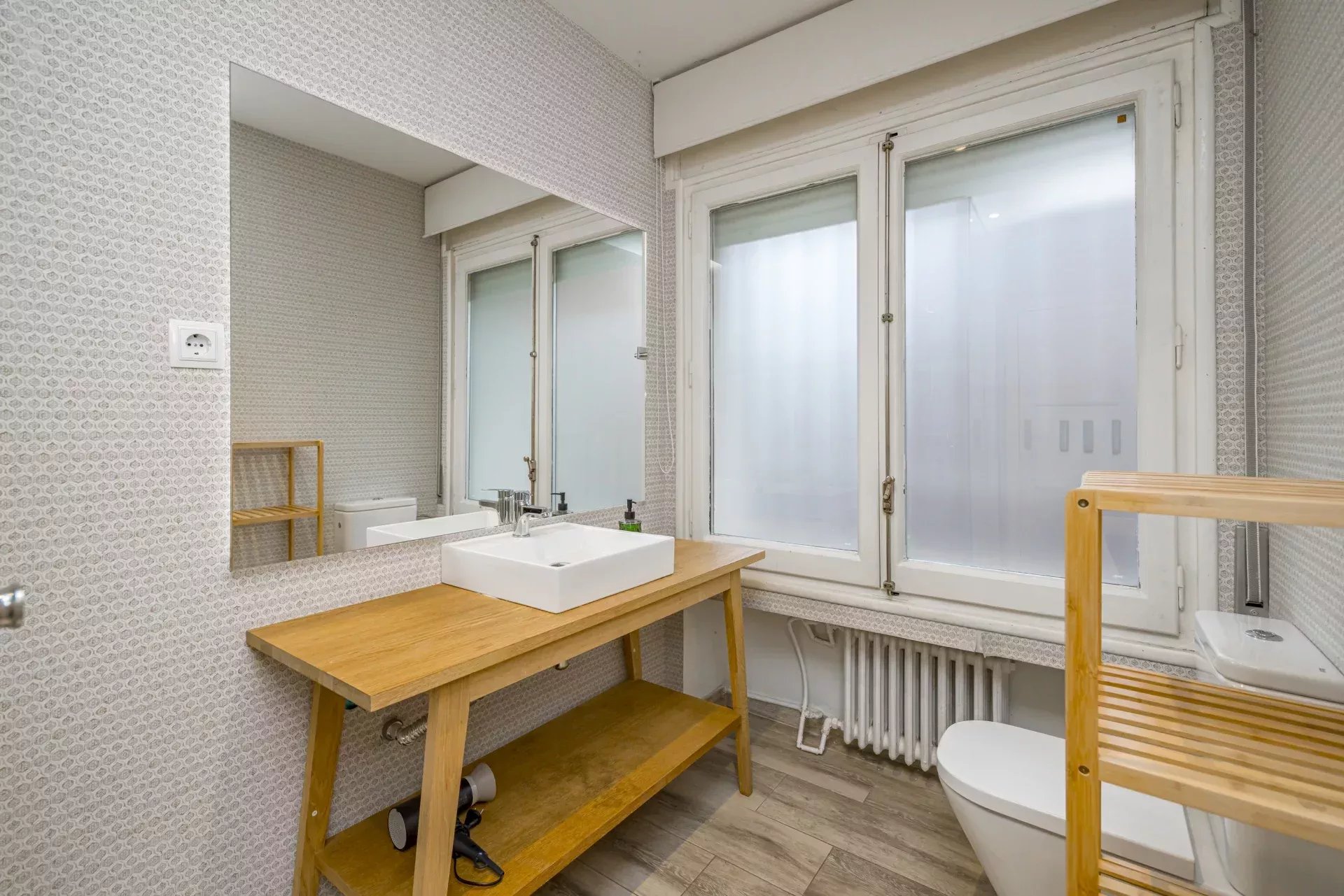 Les sols en pin mélis apportent chaleur et élégance à l’ensemble du logement, qui bénéficie également de la climatisation, du chauffage central et de l’eau chaude collective pour un confort optimal tout au long de l’année.