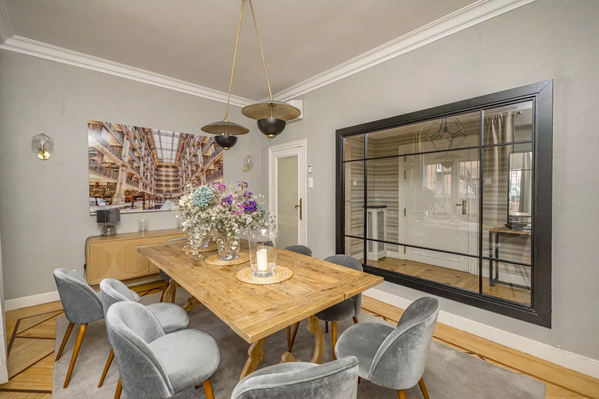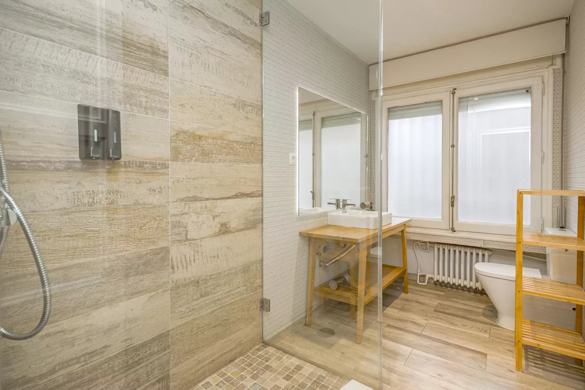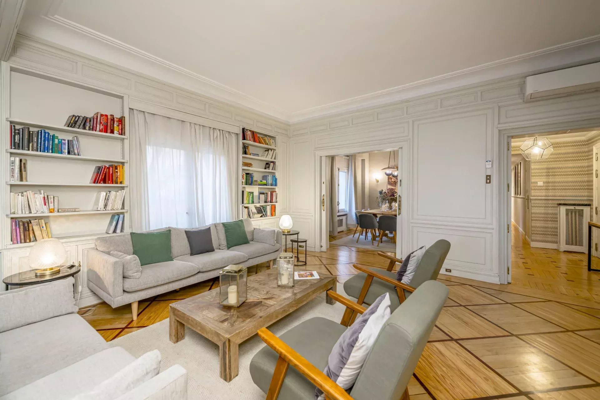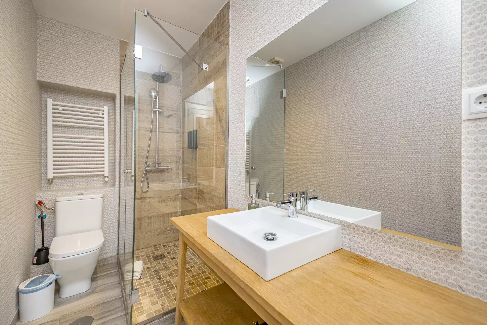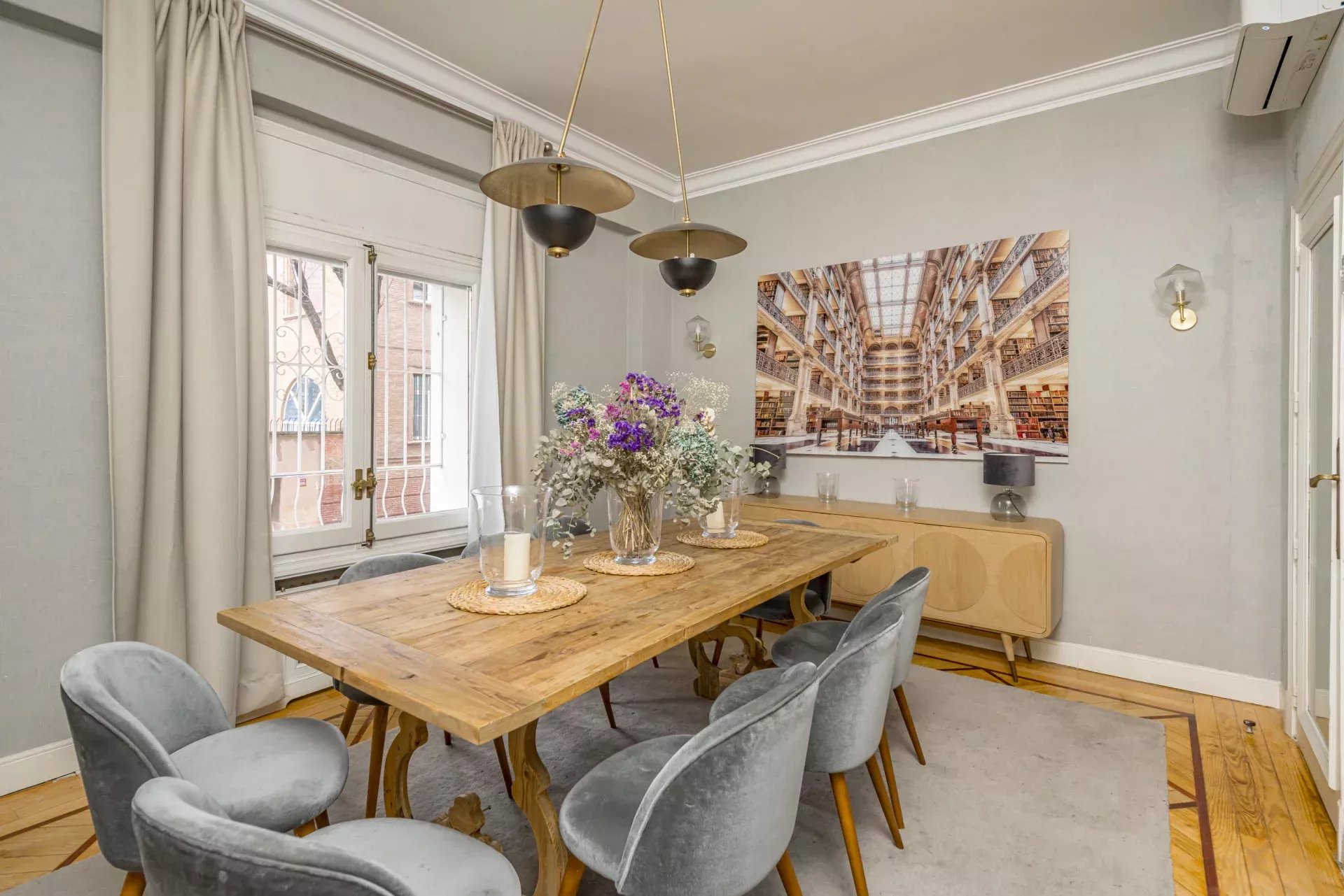 Les sols en pin mélis apportent chaleur et élégance à l’ensemble du logement, qui bénéficie également de la climatisation, du chauffage central et de l’eau chaude collective pour un confort optimal tout au long de l’année.