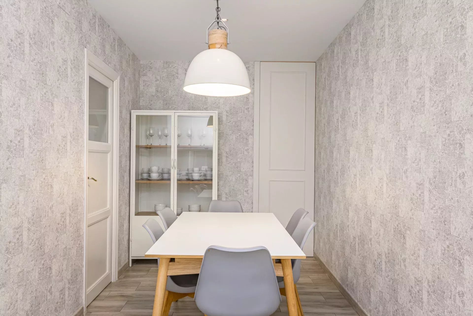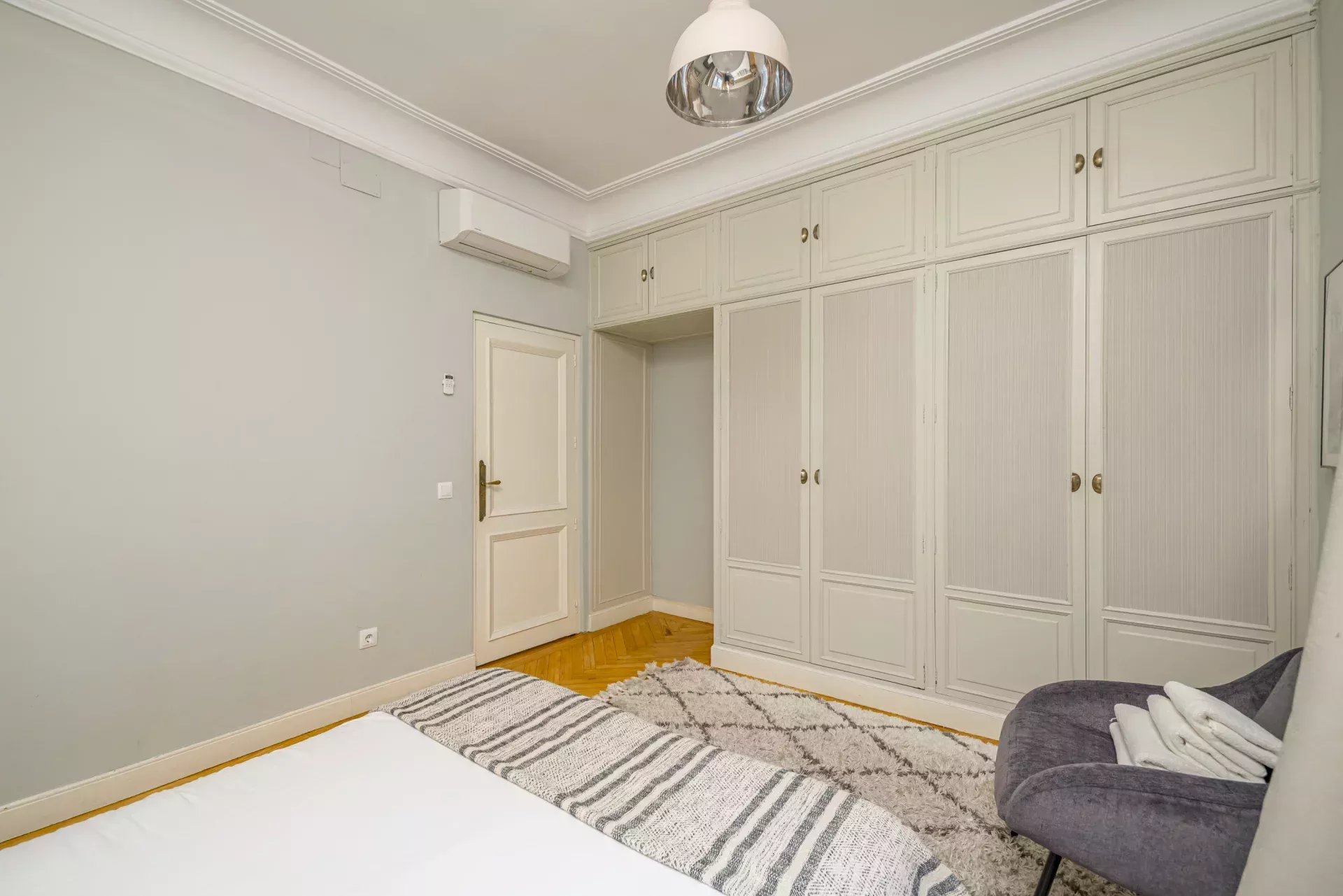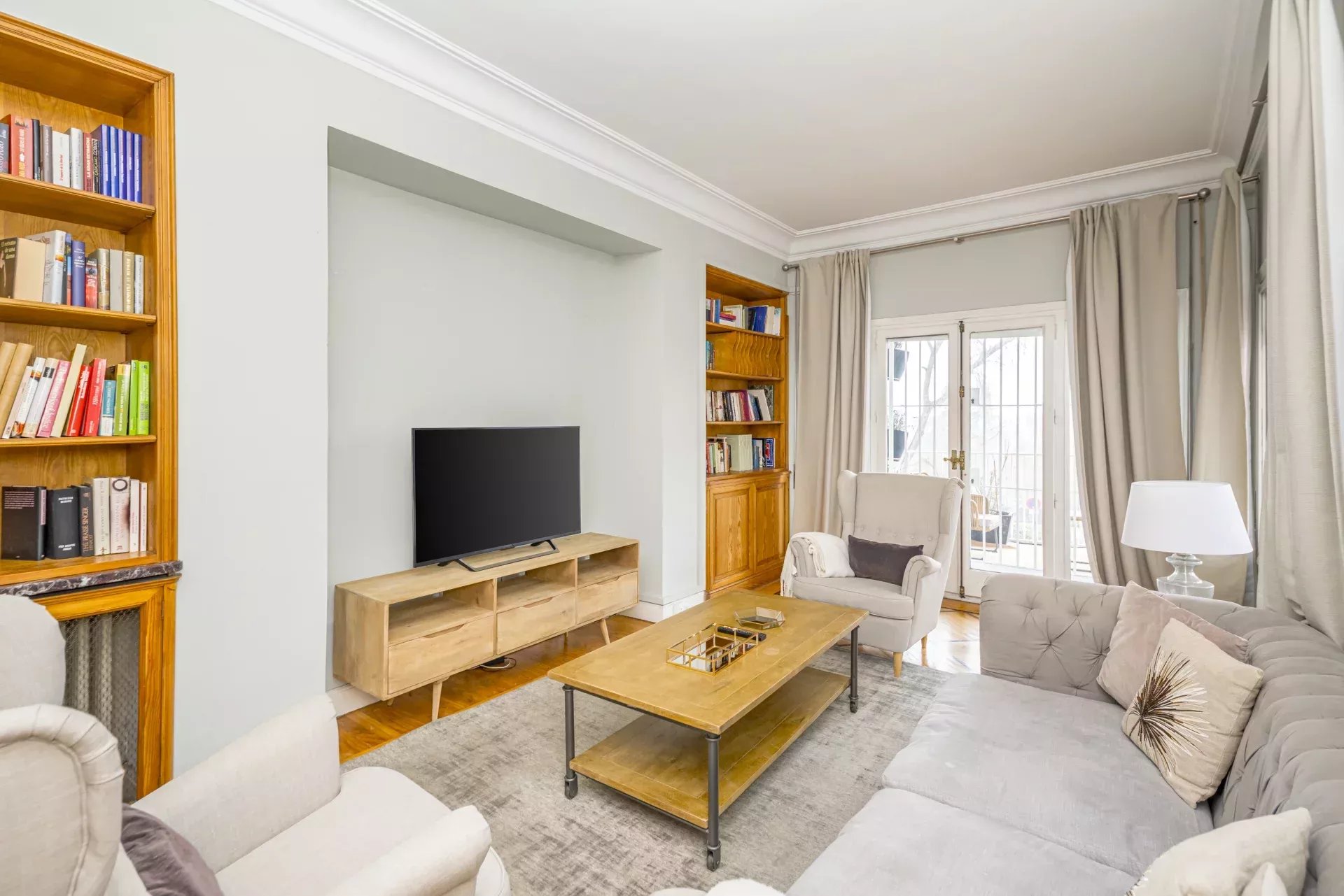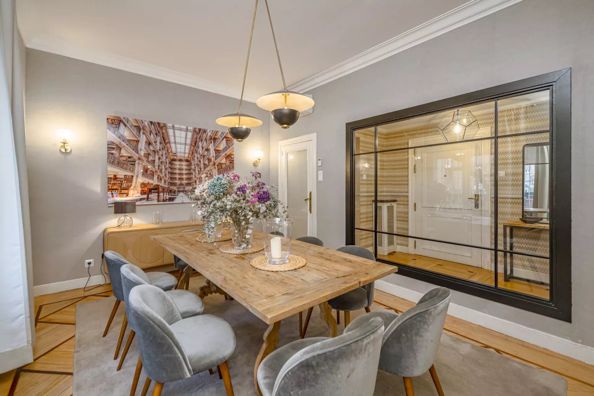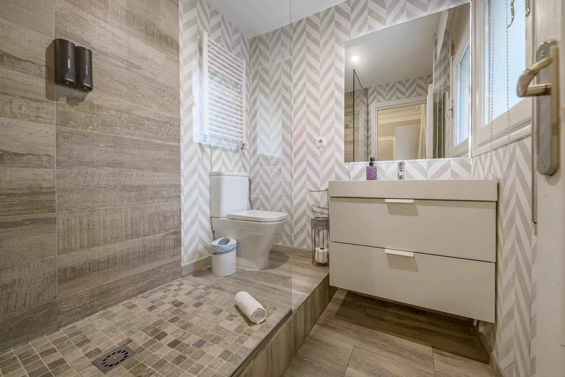 Les sols en pin mélis apportent chaleur et élégance à l’ensemble du logement, qui bénéficie également de la climatisation, du chauffage central et de l’eau chaude collective pour un confort optimal tout au long de l’année.