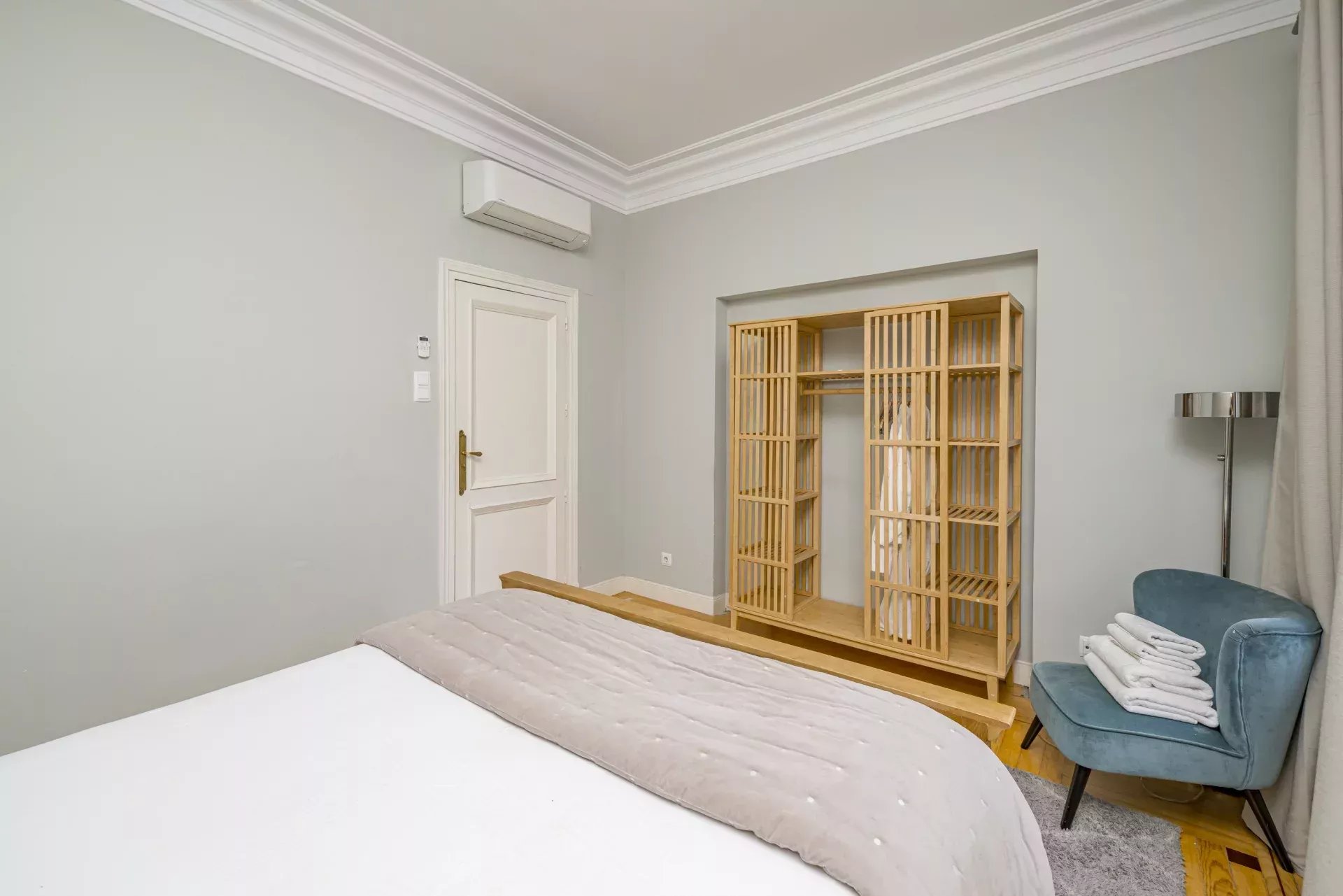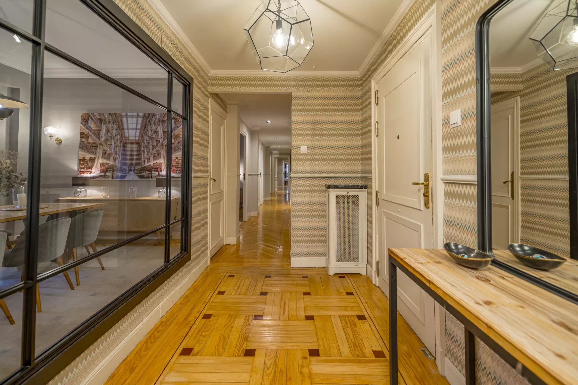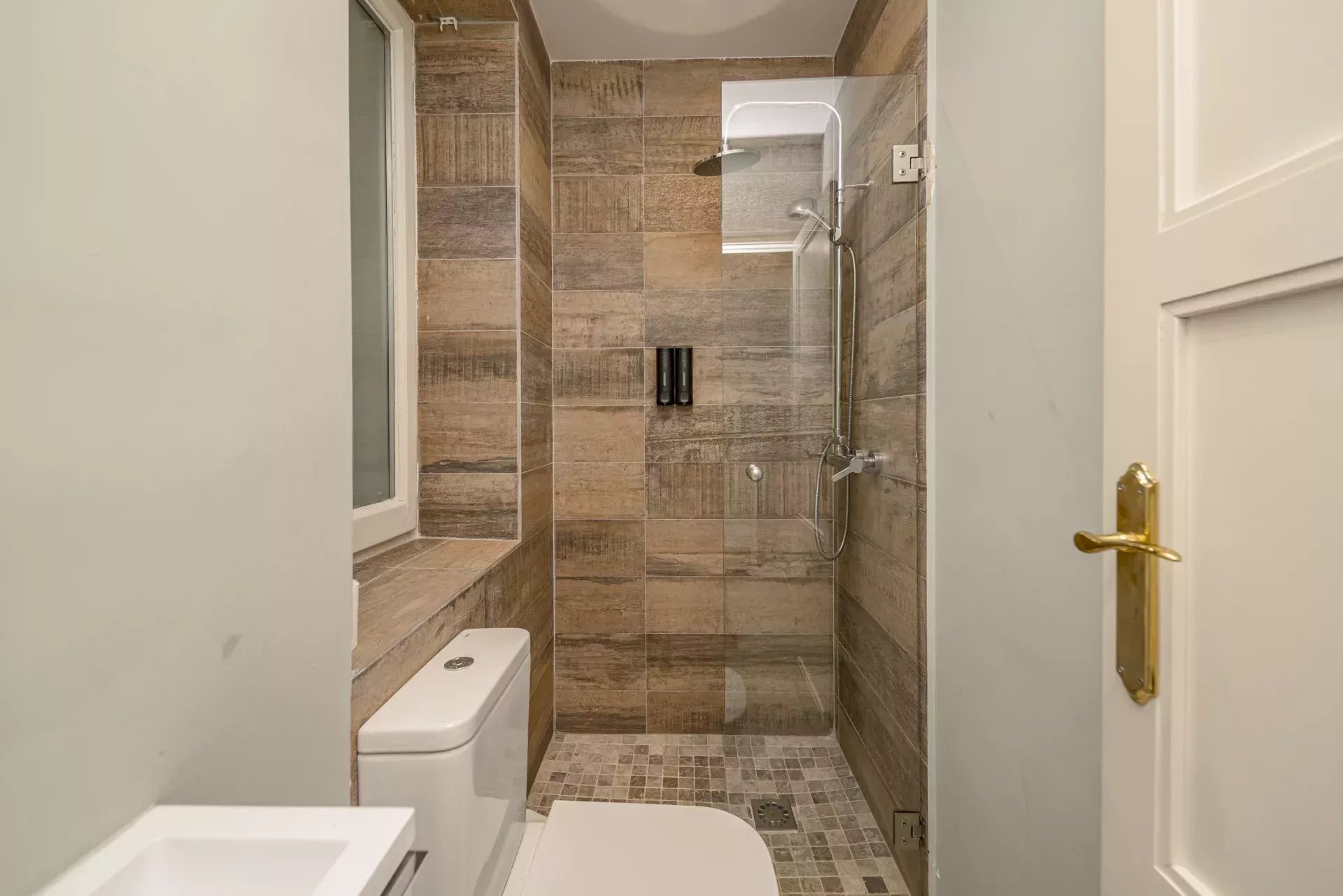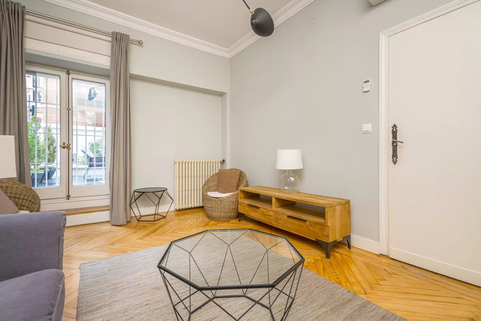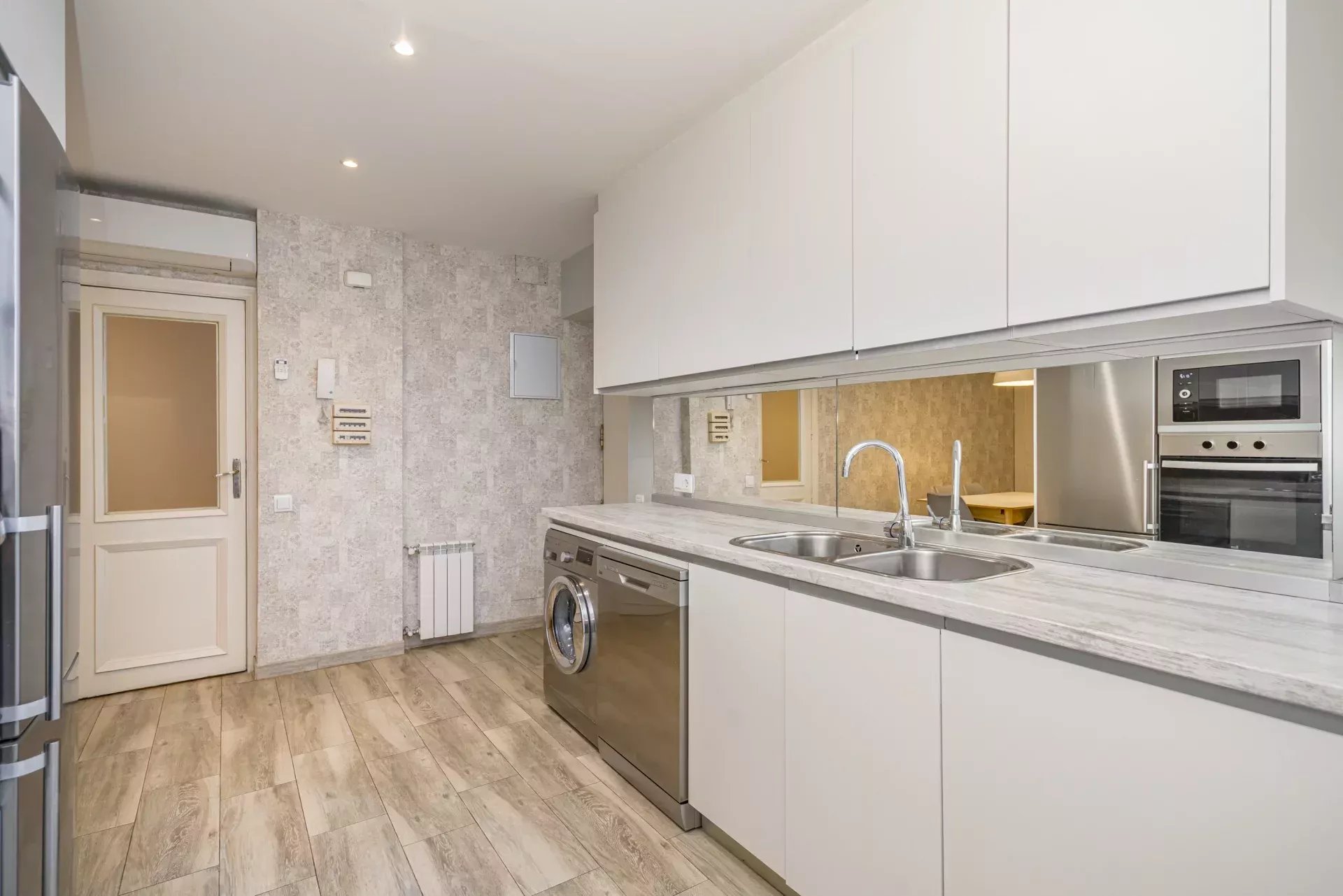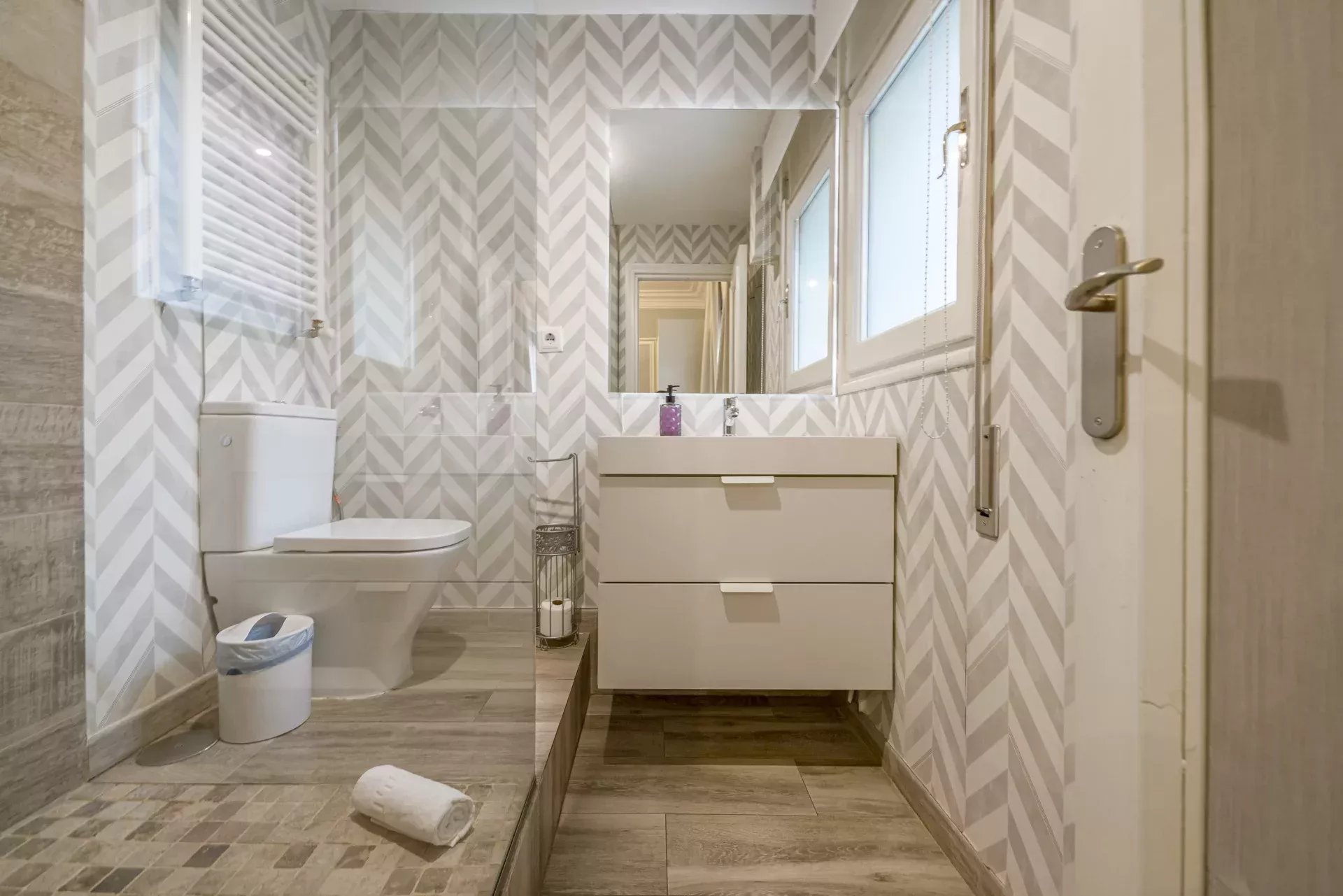 Les sols en pin mélis apportent chaleur et élégance à l’ensemble du logement, qui bénéficie également de la climatisation, du chauffage central et de l’eau chaude collective pour un confort optimal tout au long de l’année.