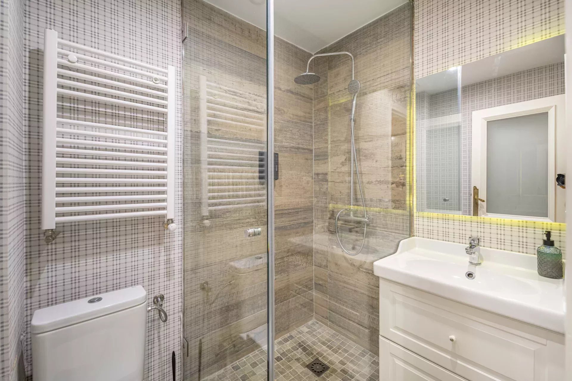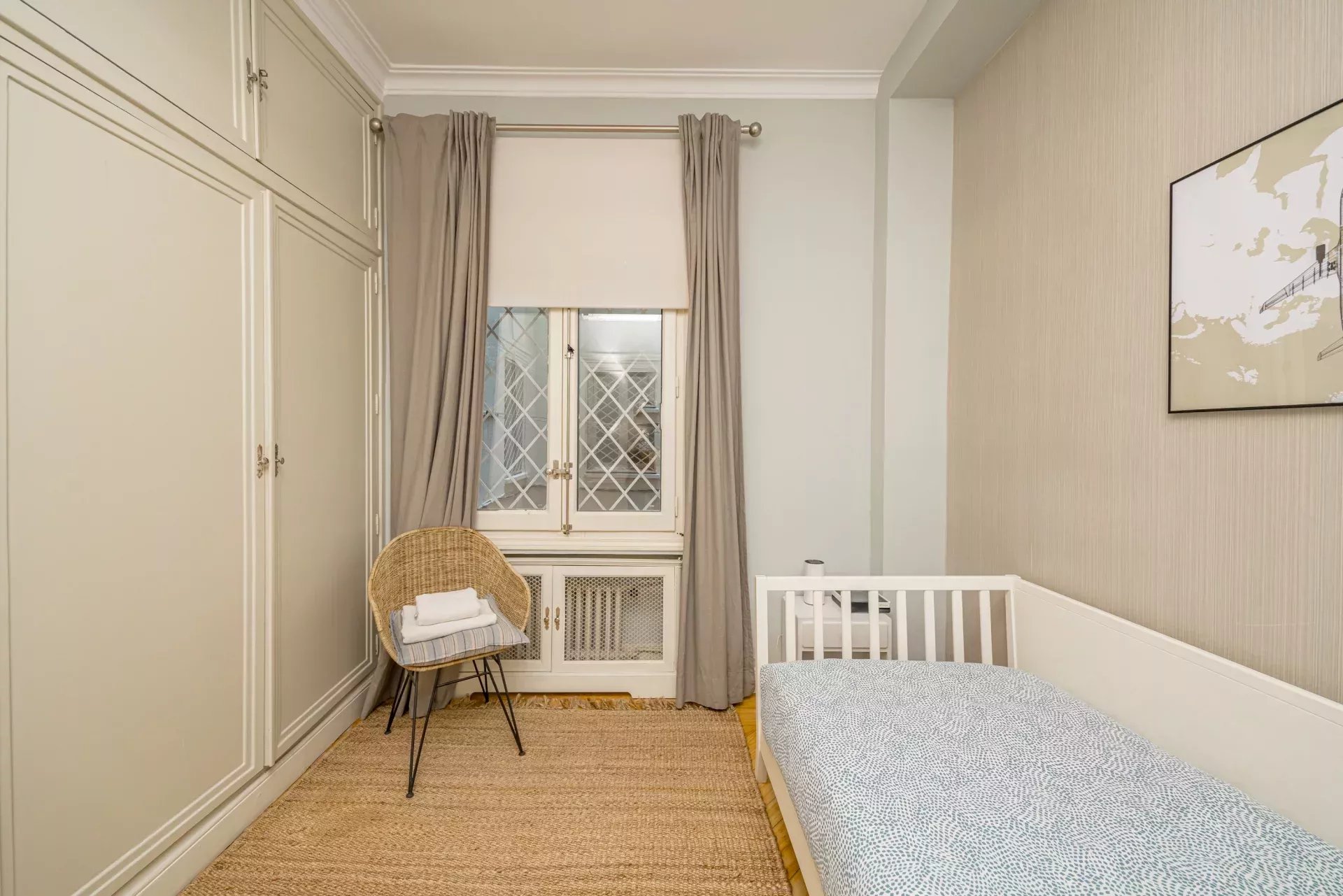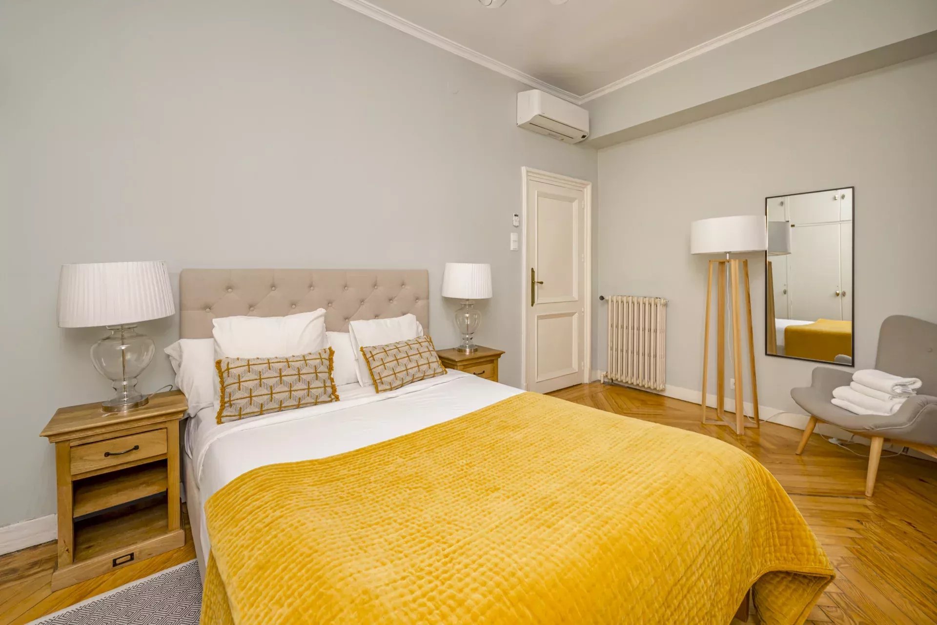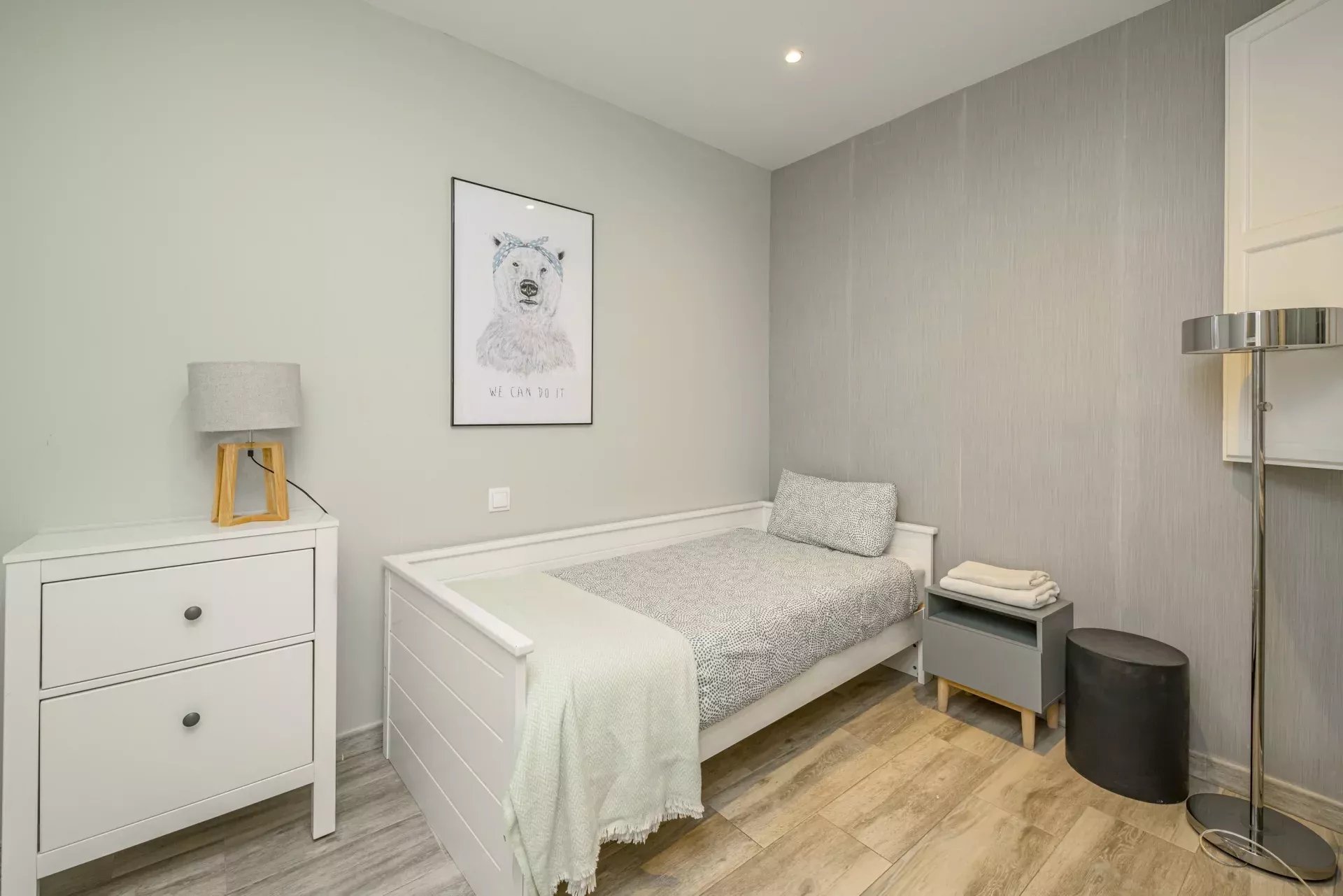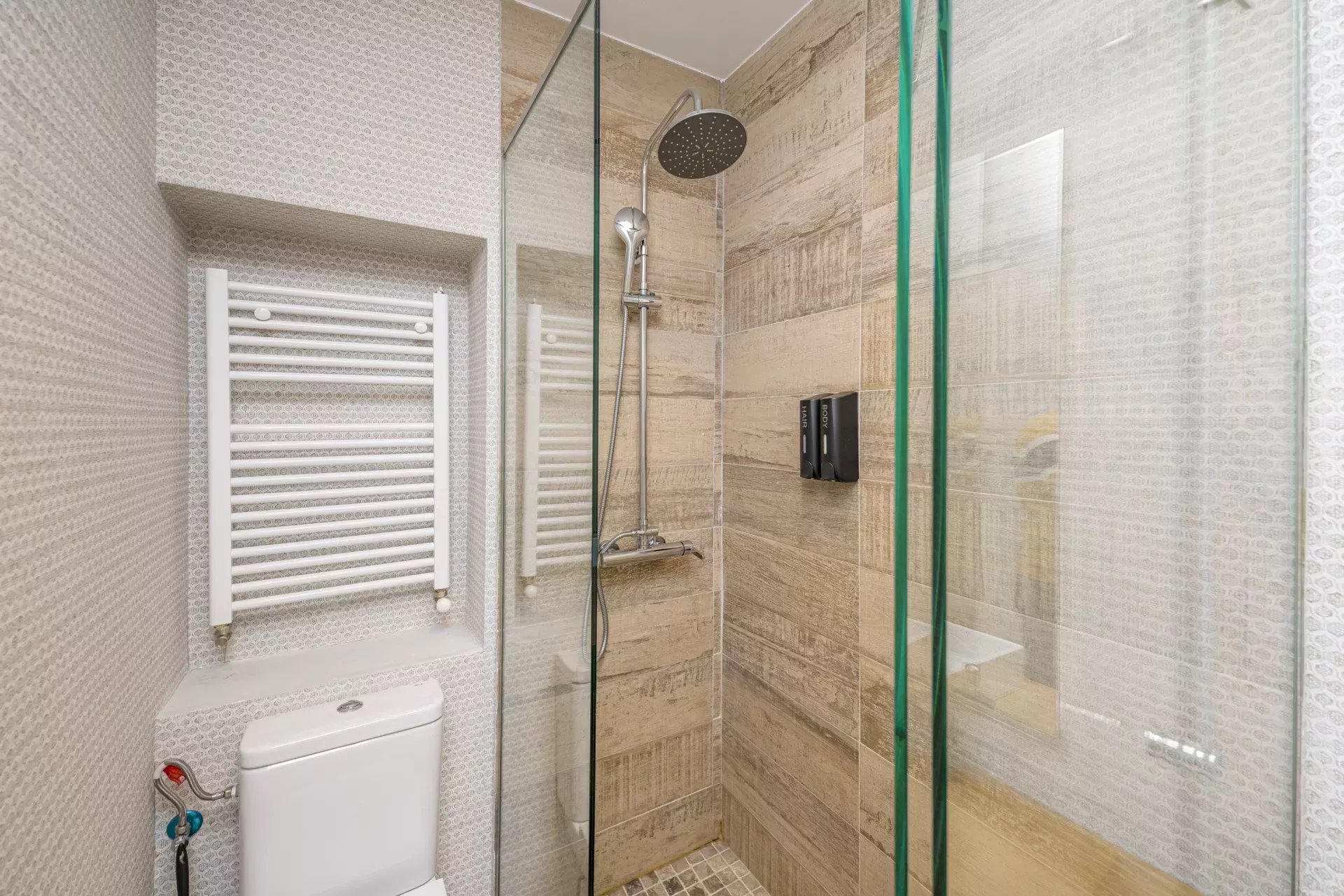 Les sols en pin mélis apportent chaleur et élégance à l’ensemble du logement, qui bénéficie également de la climatisation, du chauffage central et de l’eau chaude collective pour un confort optimal tout au long de l’année.