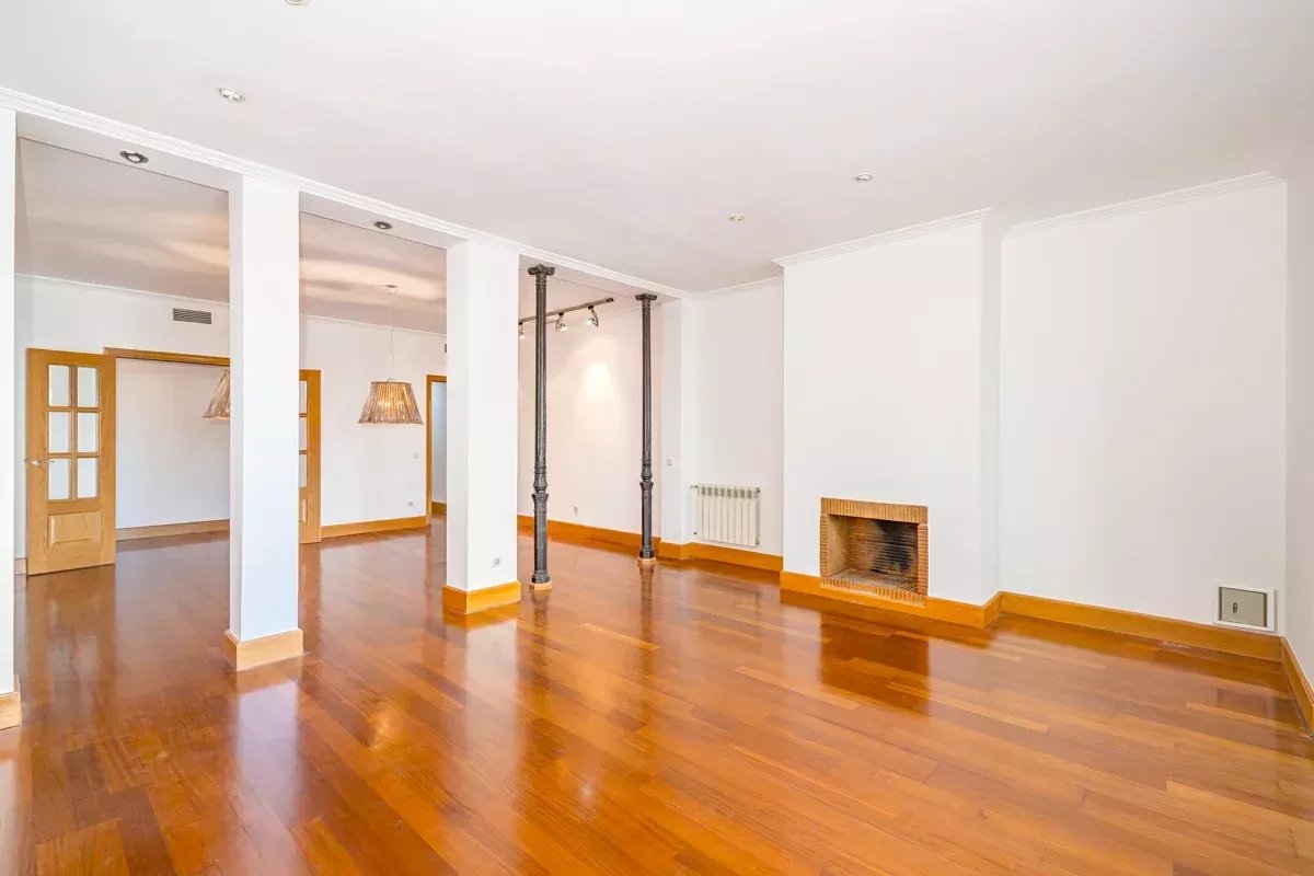 Le vaste salon, avec espace salle à manger et cheminée, est baigné de lumière grâce aux balcons donnant sur le Paseo de la Castellana et la Plaza de Colón.