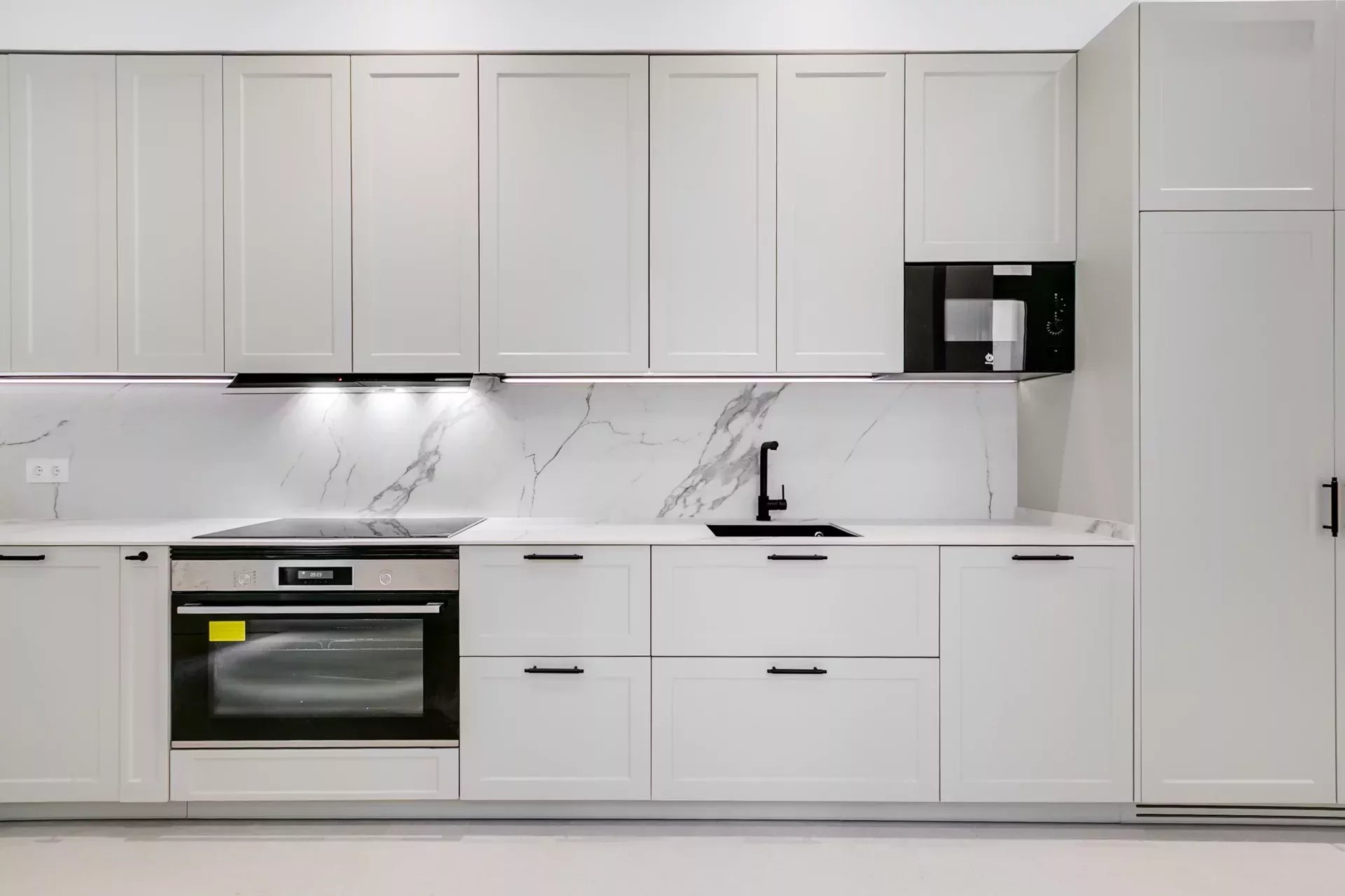 La distribution commence par un hall d’entrée en marbre menant à la zone de réception : un vaste salon avec larges fenêtres, permettant de créer jusqu’à trois ambiances distinctes (salon de réception, salle familiale et salle à manger). Cette zone est complétée par des toilettes invités et une cuisine spacieuse équipée d’électroménagers haut de gamme, avec îlot central, buanderie indépendante (lave-linge, sèche-linge, évier et rangements), ainsi qu’une entrée et un monte-charge de service.