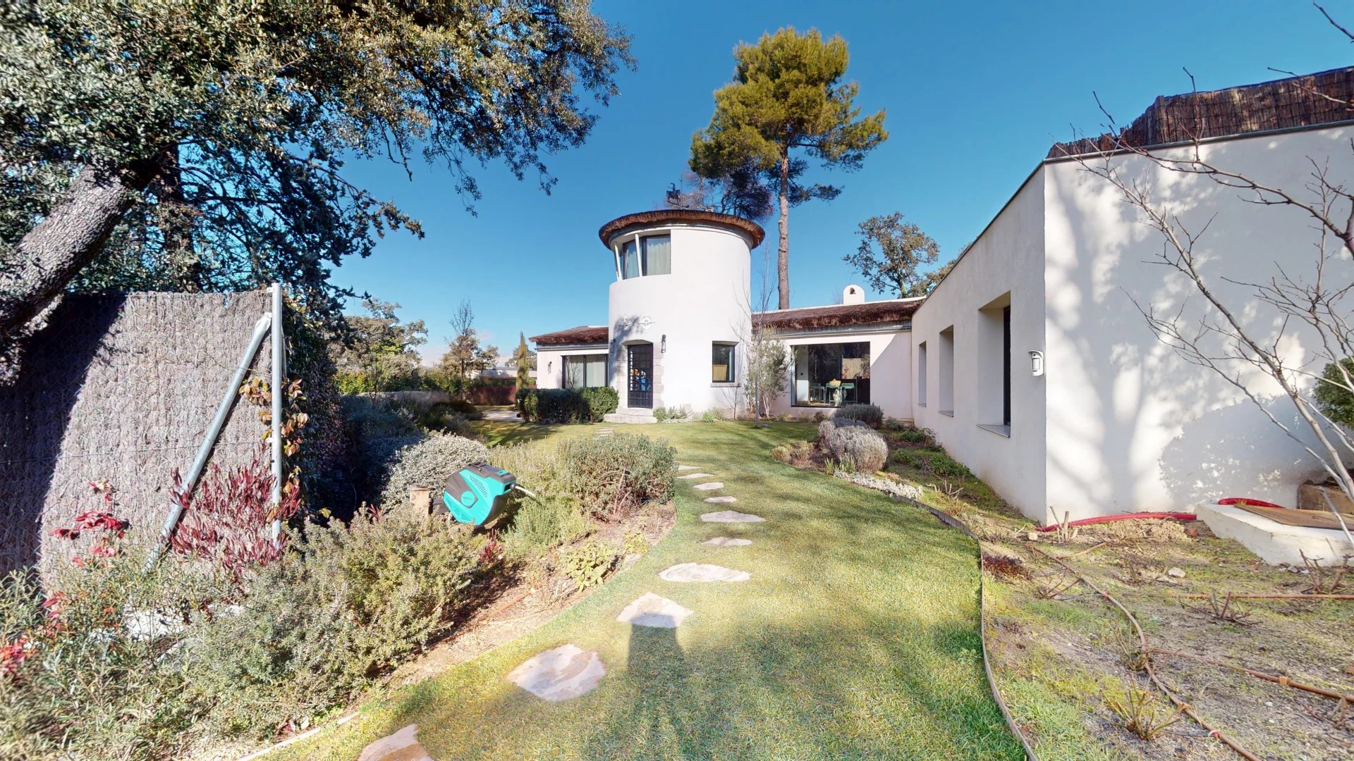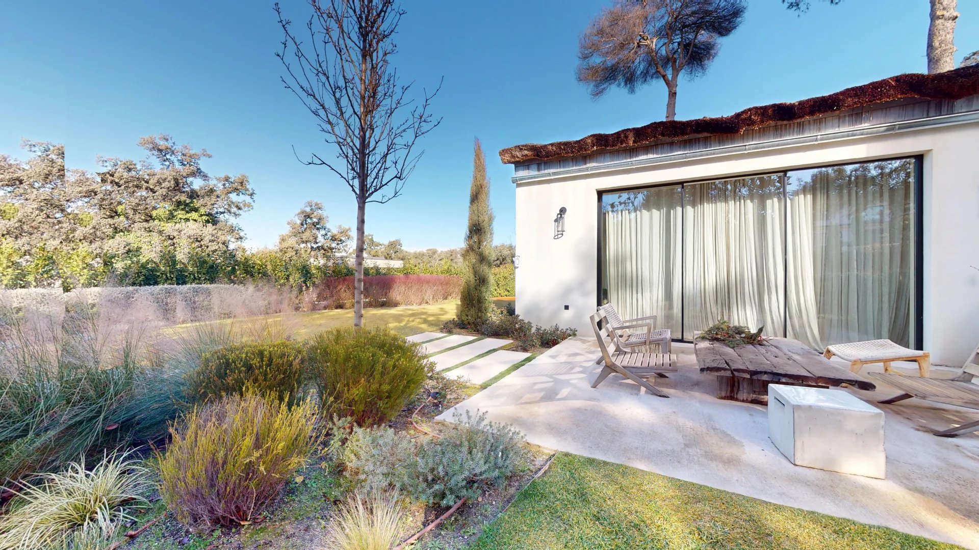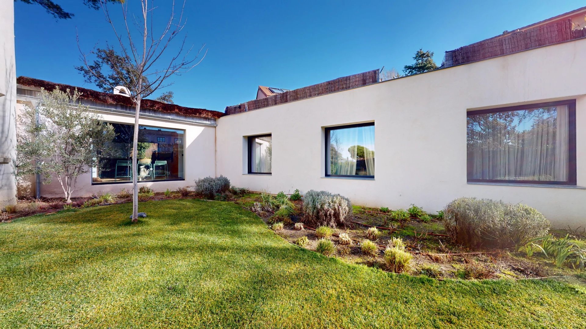 À l'extérieur, la villa s'ouvre sur un jardin soigneusement aménagé qui abrite une magnifique piscine privée, véritable havre de sérénité. La propriété dispose également d'un espace de stationnement, alliant praticité et discrétion.