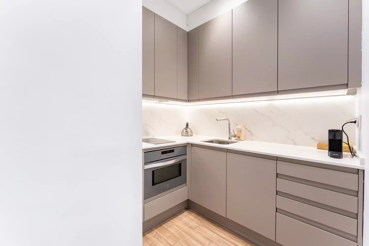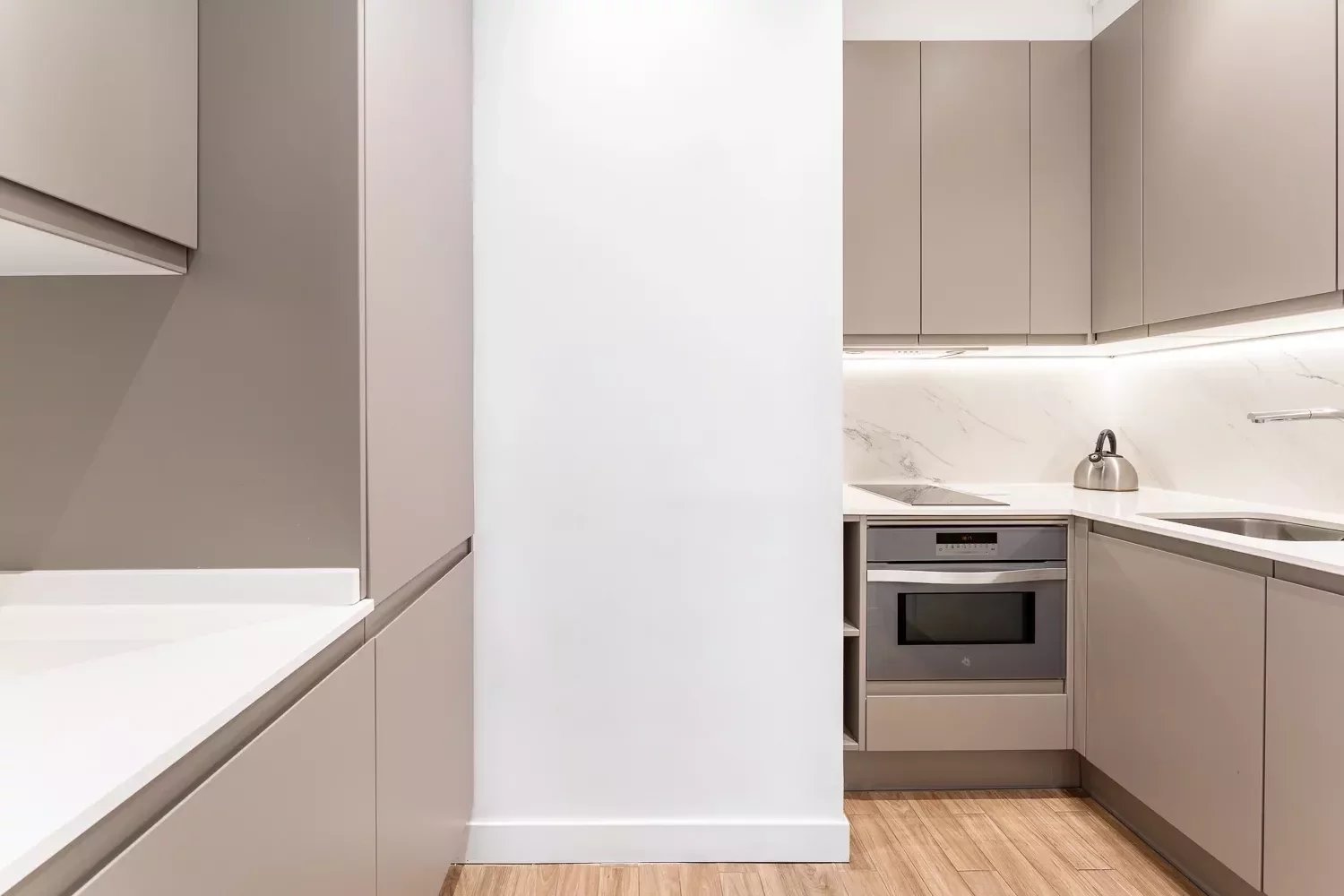La cuisine américaine de style contemporain intègre des appareils électroménagers haut de gamme et un ensemble complet d’ustensiles, offrant un espace pratique et fonctionnel.