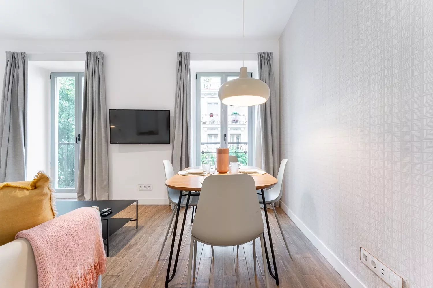 Le salon-salle à manger, lumineux et confortable, s’ouvre sur la rue par deux balcons, créant une atmosphère chaleureuse et agréable. Équipé d’un canapé-lit et d’une table pour quatre convives, parfait pour se détendre ou recevoir.