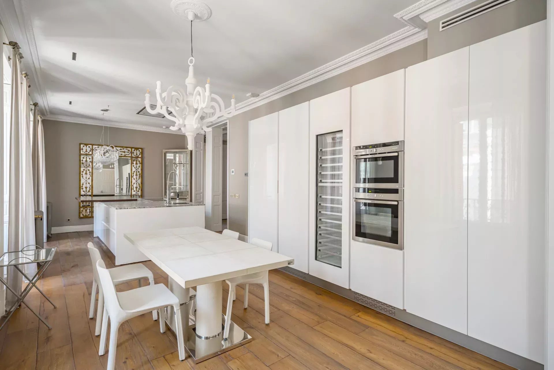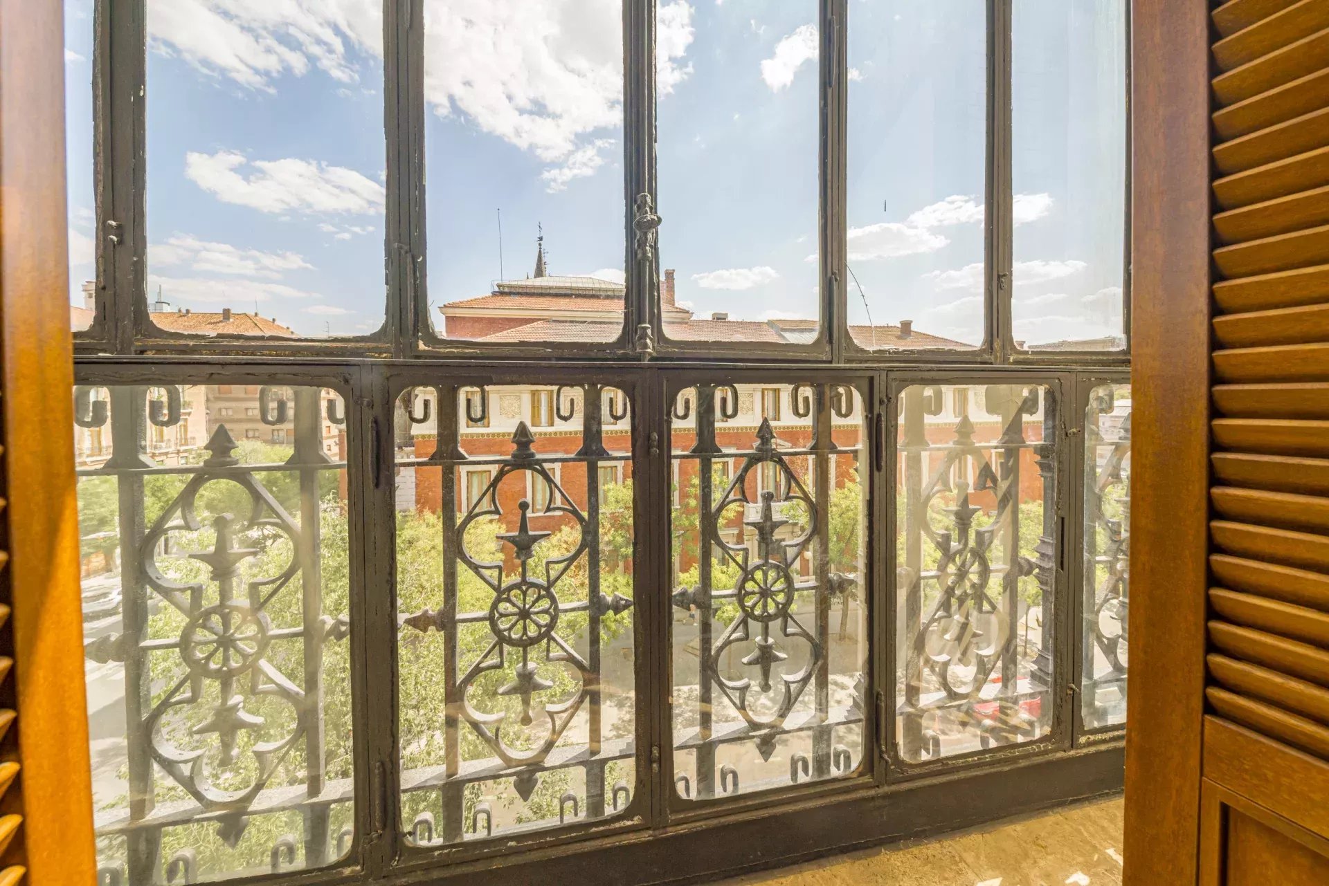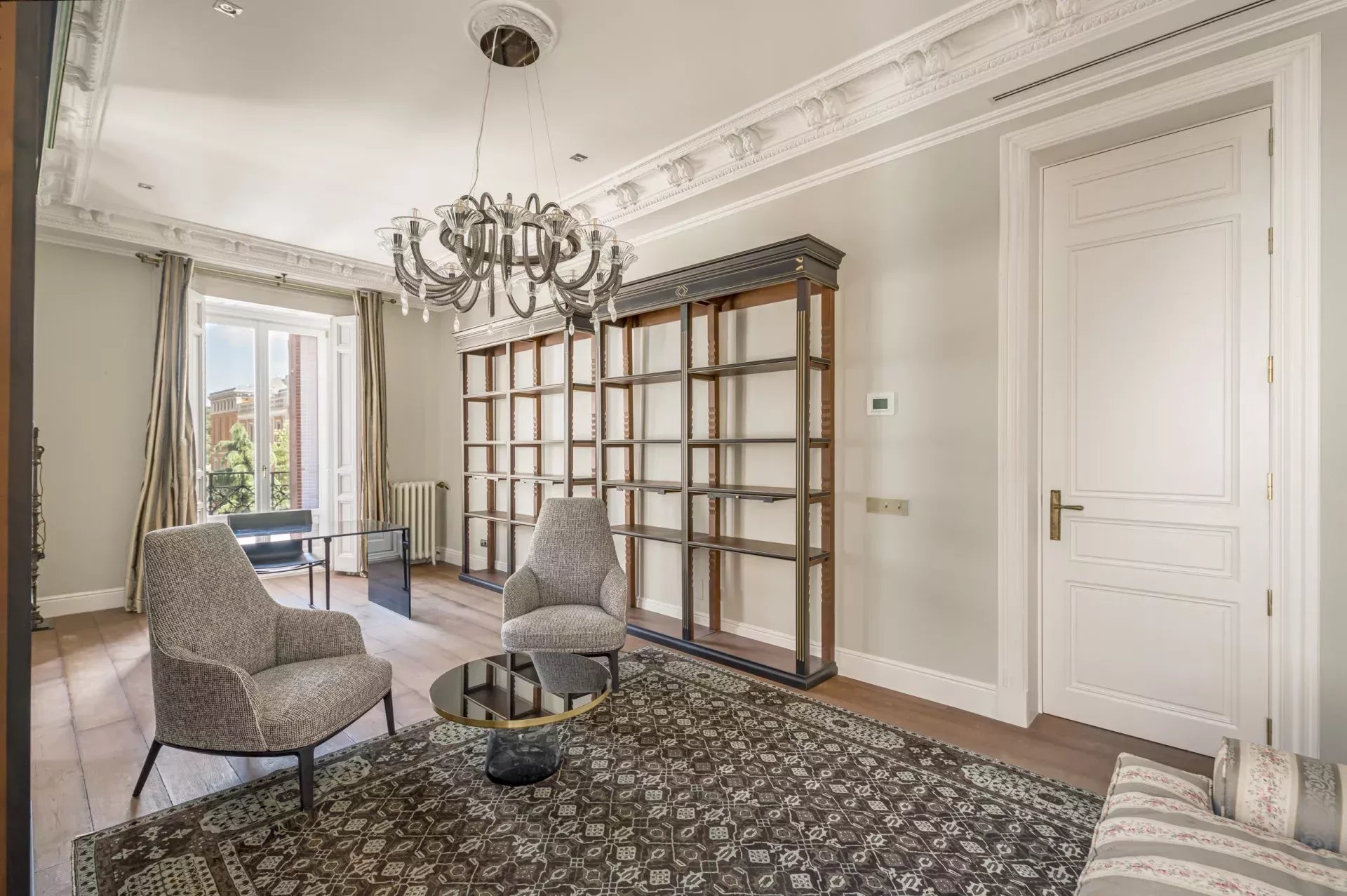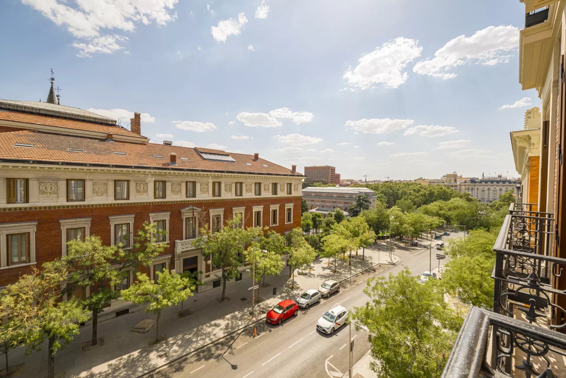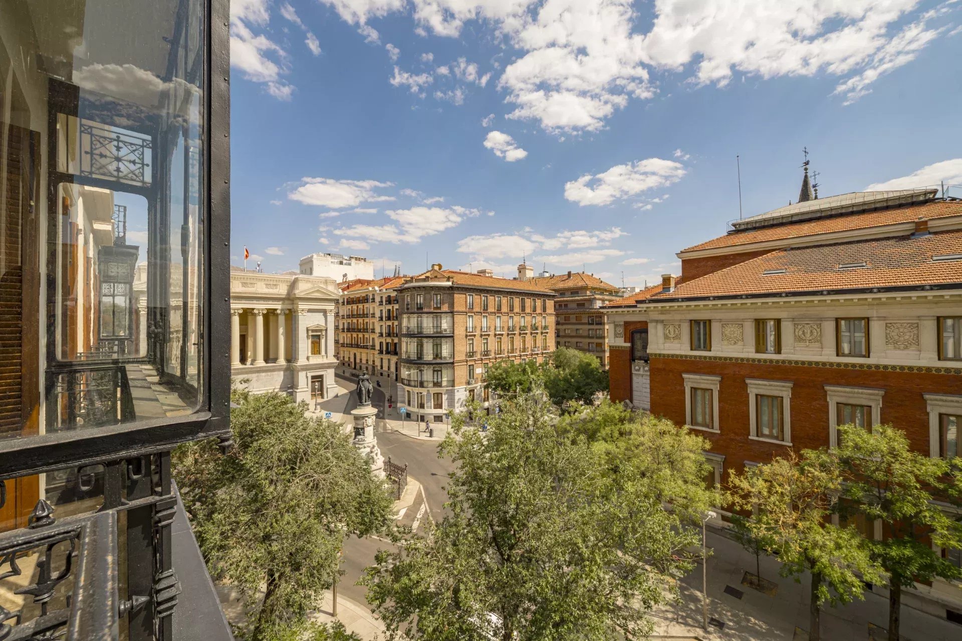 Dans la zone de jour, le hall d'entrée mène à un vaste salon d'angle, mis en valeur par son bow-window et trois balcons offrant des vues incomparables sur le Musée du Prado, l'église des Jerónimos et le parc du Retiro. À la suite, se trouvent une salle à manger pouvant accueillir 20 convives et une élégante bibliothèque-bureau. La cuisine, également orientée vers l'extérieur, est impressionnante, avec une île centrale et équipée des meilleurs appareils électroménagers. La zone de service, avec un accès indépendant, comprend une chambre en suite, une buanderie et une salle de télévision.