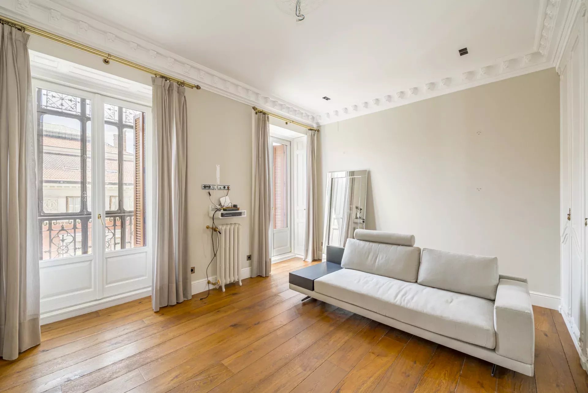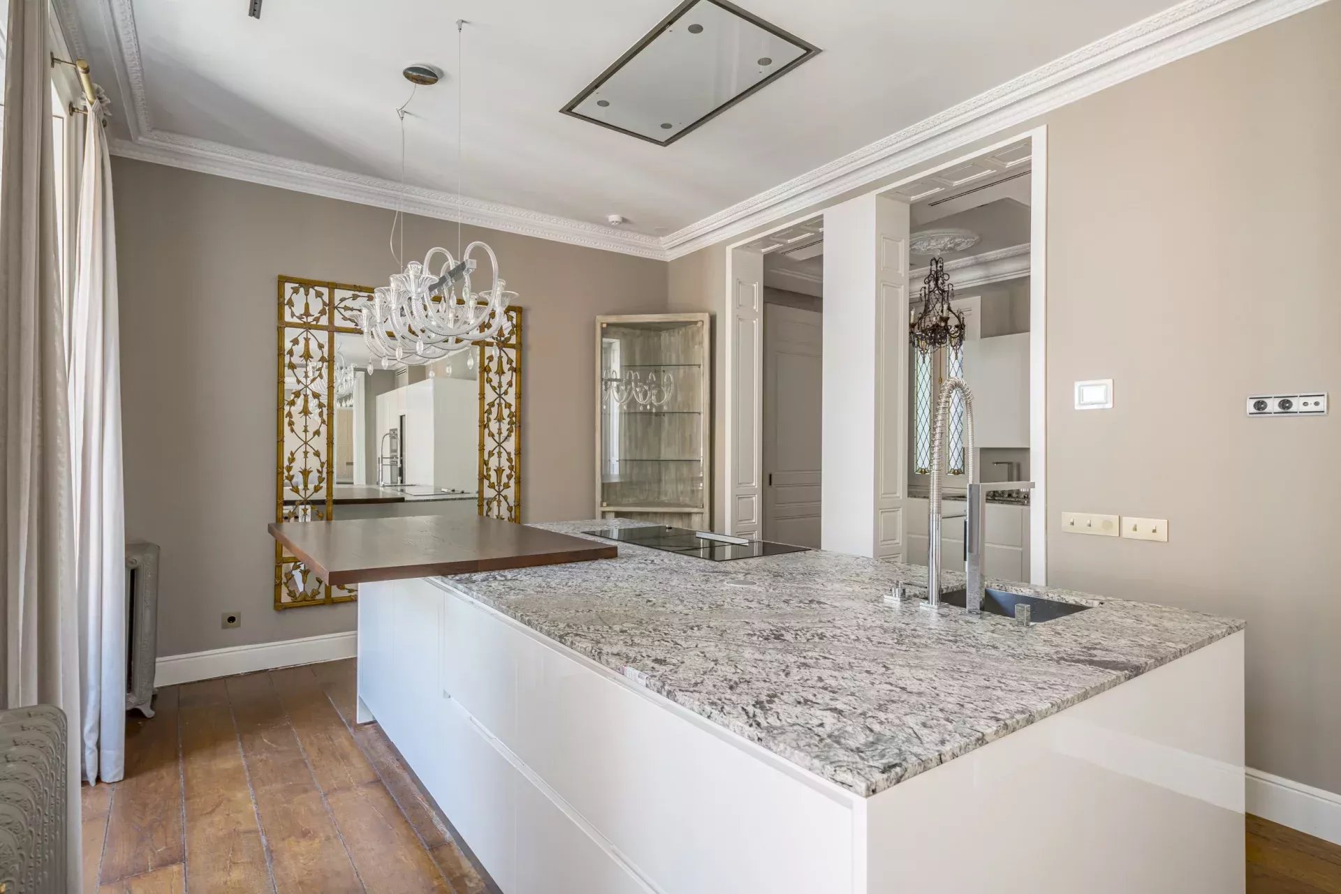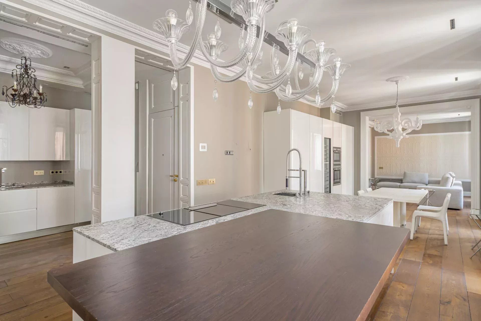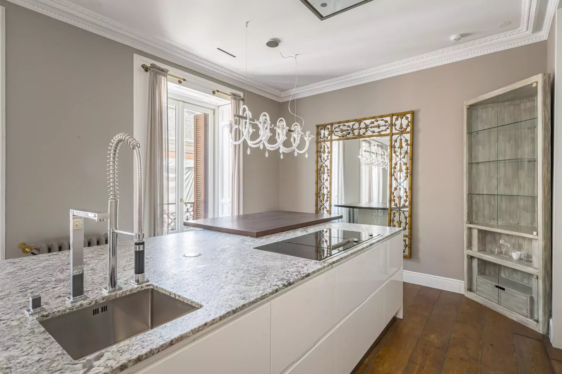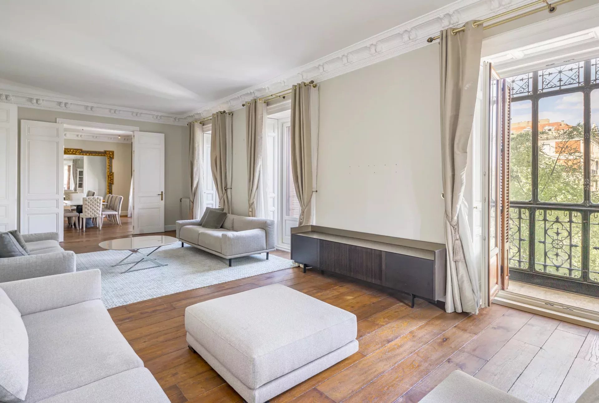 Dans la zone de jour, le hall d'entrée mène à un vaste salon d'angle, mis en valeur par son bow-window et trois balcons offrant des vues incomparables sur le Musée du Prado, l'église des Jerónimos et le parc du Retiro. À la suite, se trouvent une salle à manger pouvant accueillir 20 convives et une élégante bibliothèque-bureau. La cuisine, également orientée vers l'extérieur, est impressionnante, avec une île centrale et équipée des meilleurs appareils électroménagers. La zone de service, avec un accès indépendant, comprend une chambre en suite, une buanderie et une salle de télévision.