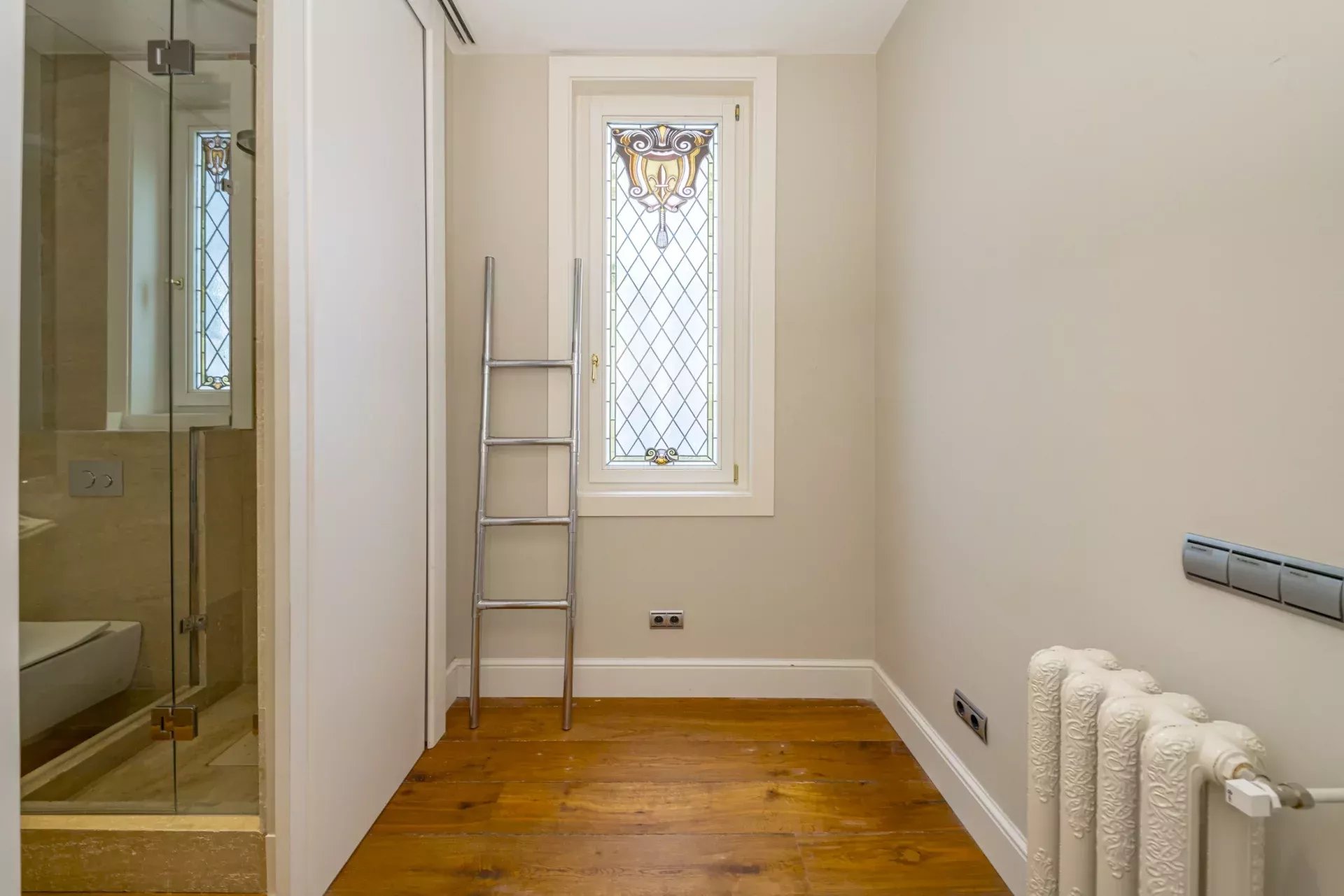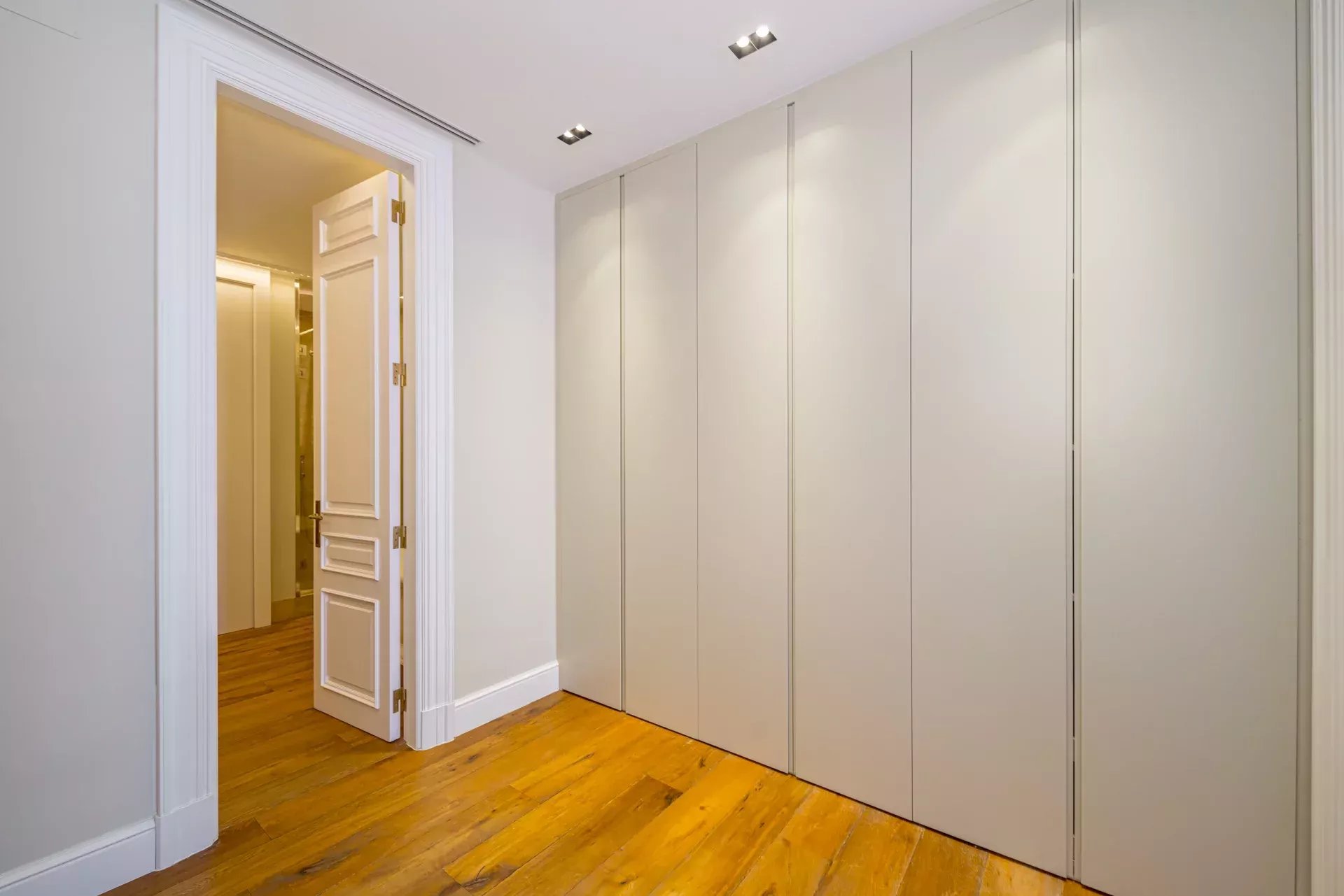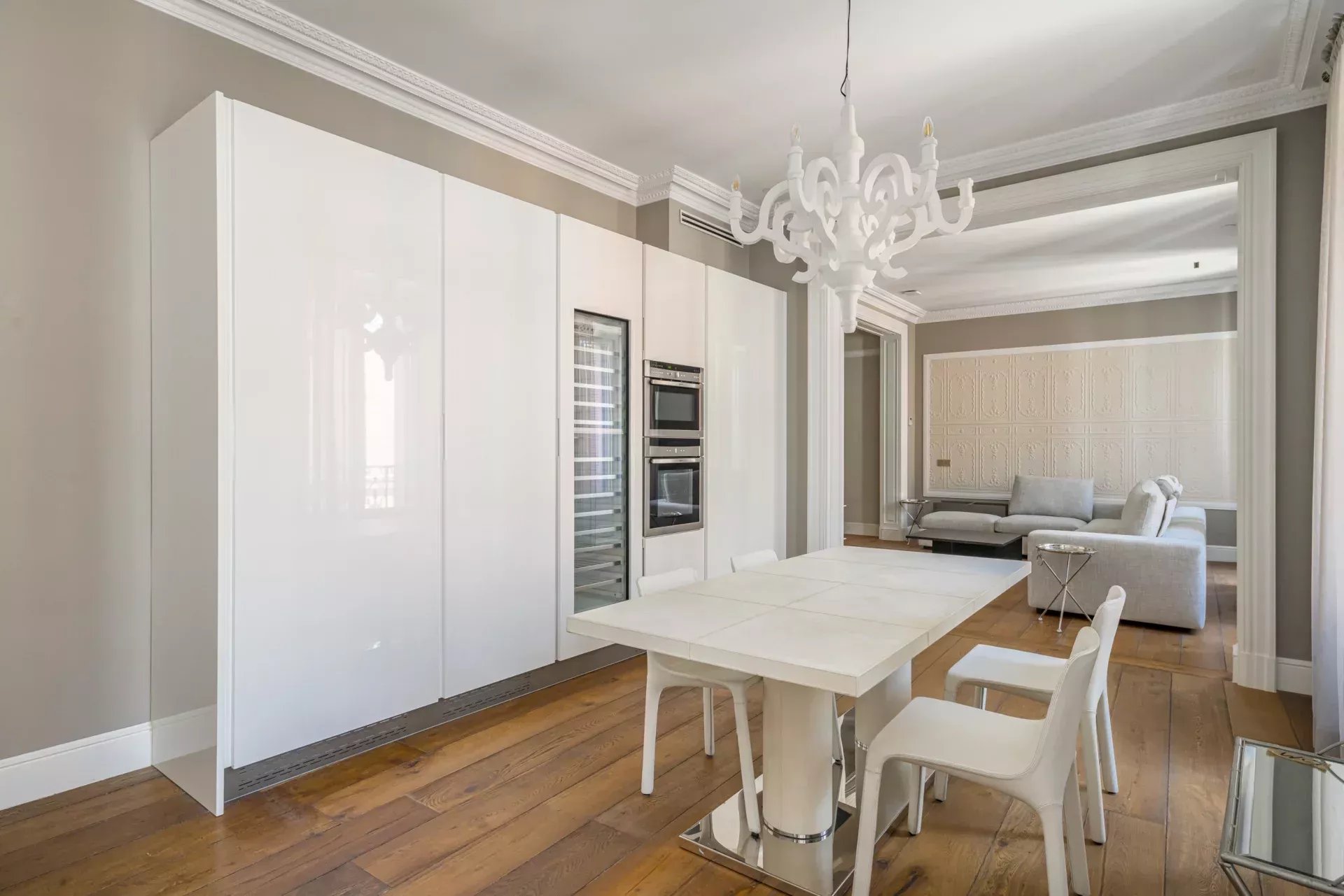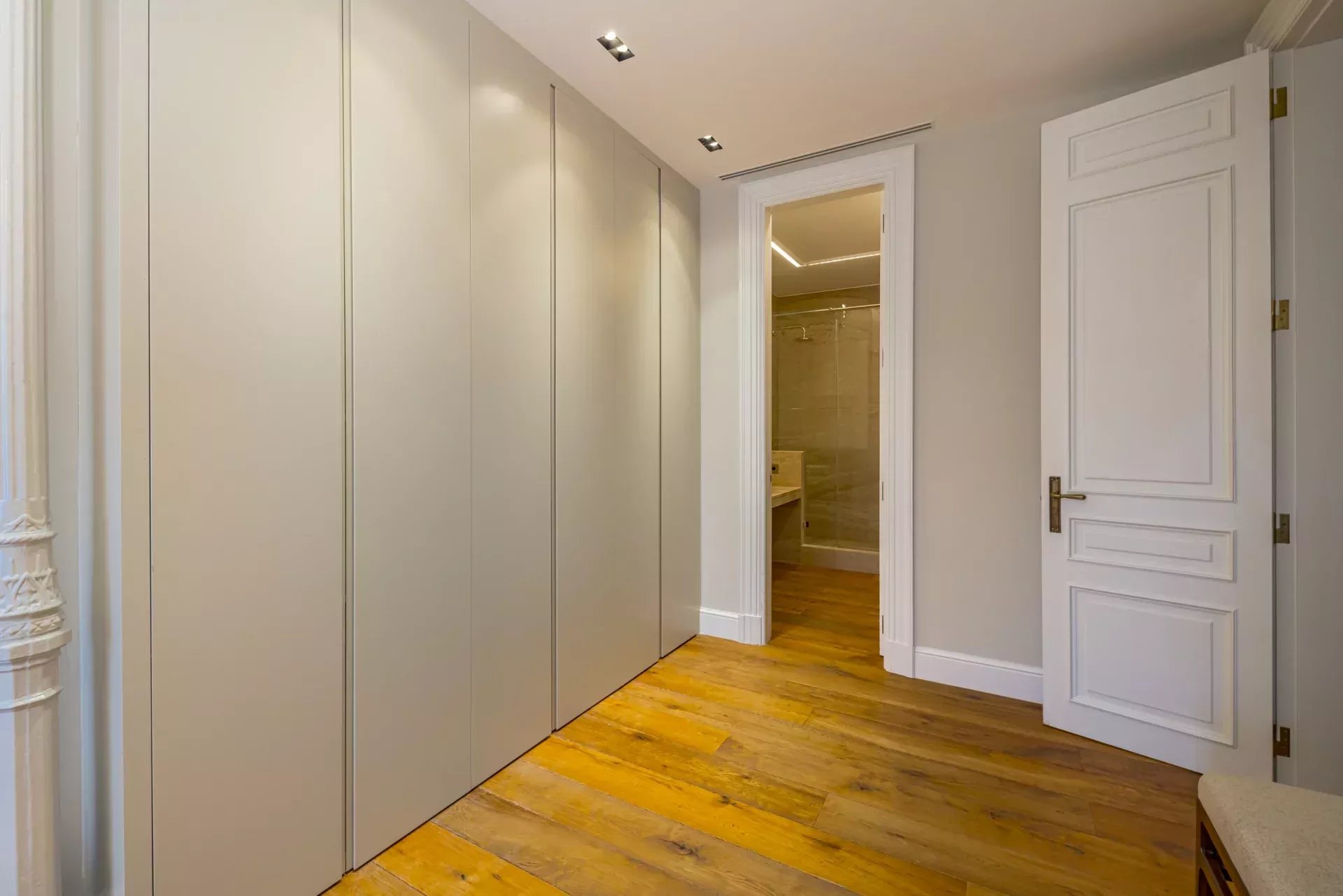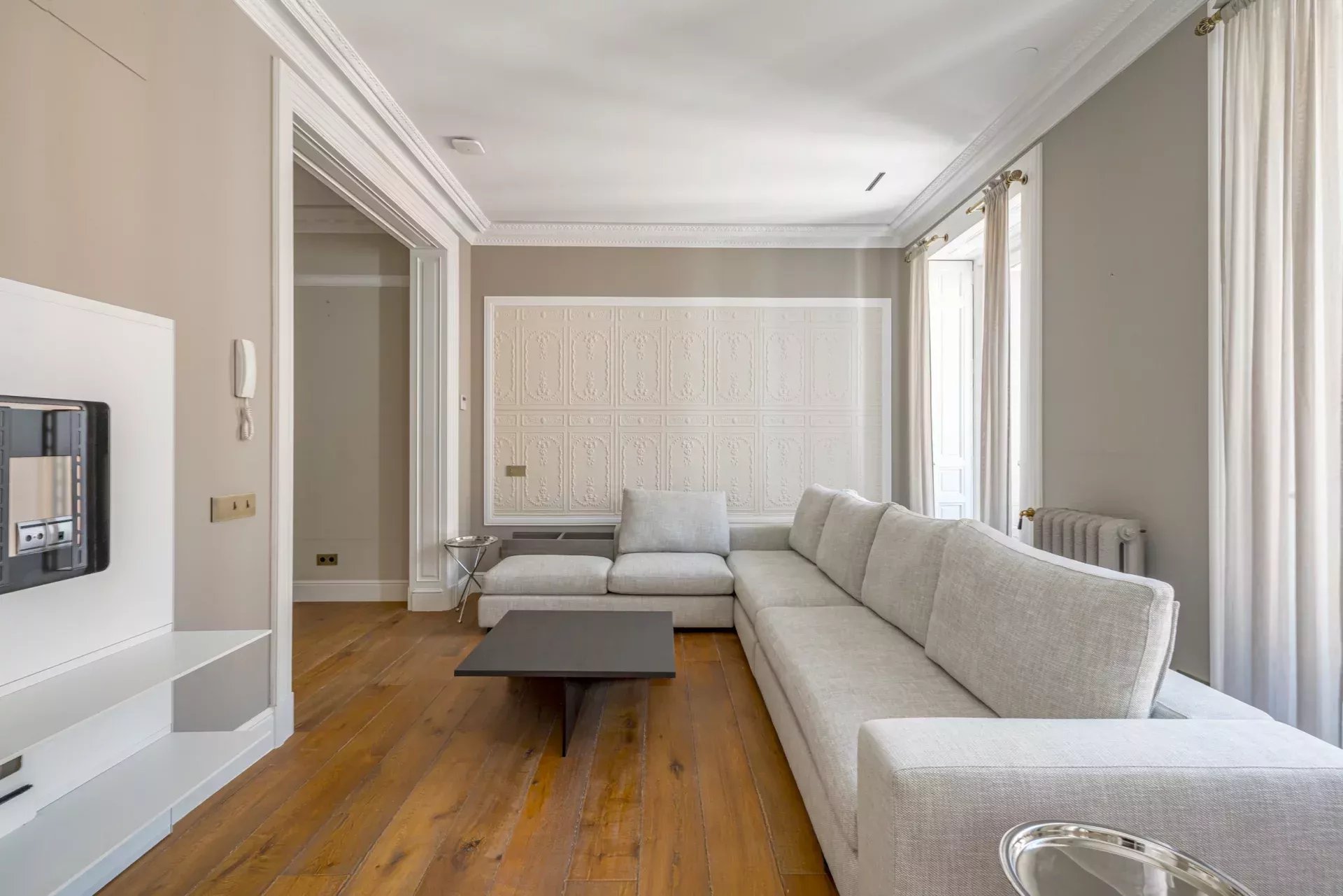 Dans la zone de jour, le hall d'entrée mène à un vaste salon d'angle, mis en valeur par son bow-window et trois balcons offrant des vues incomparables sur le Musée du Prado, l'église des Jerónimos et le parc du Retiro. À la suite, se trouvent une salle à manger pouvant accueillir 20 convives et une élégante bibliothèque-bureau. La cuisine, également orientée vers l'extérieur, est impressionnante, avec une île centrale et équipée des meilleurs appareils électroménagers. La zone de service, avec un accès indépendant, comprend une chambre en suite, une buanderie et une salle de télévision.