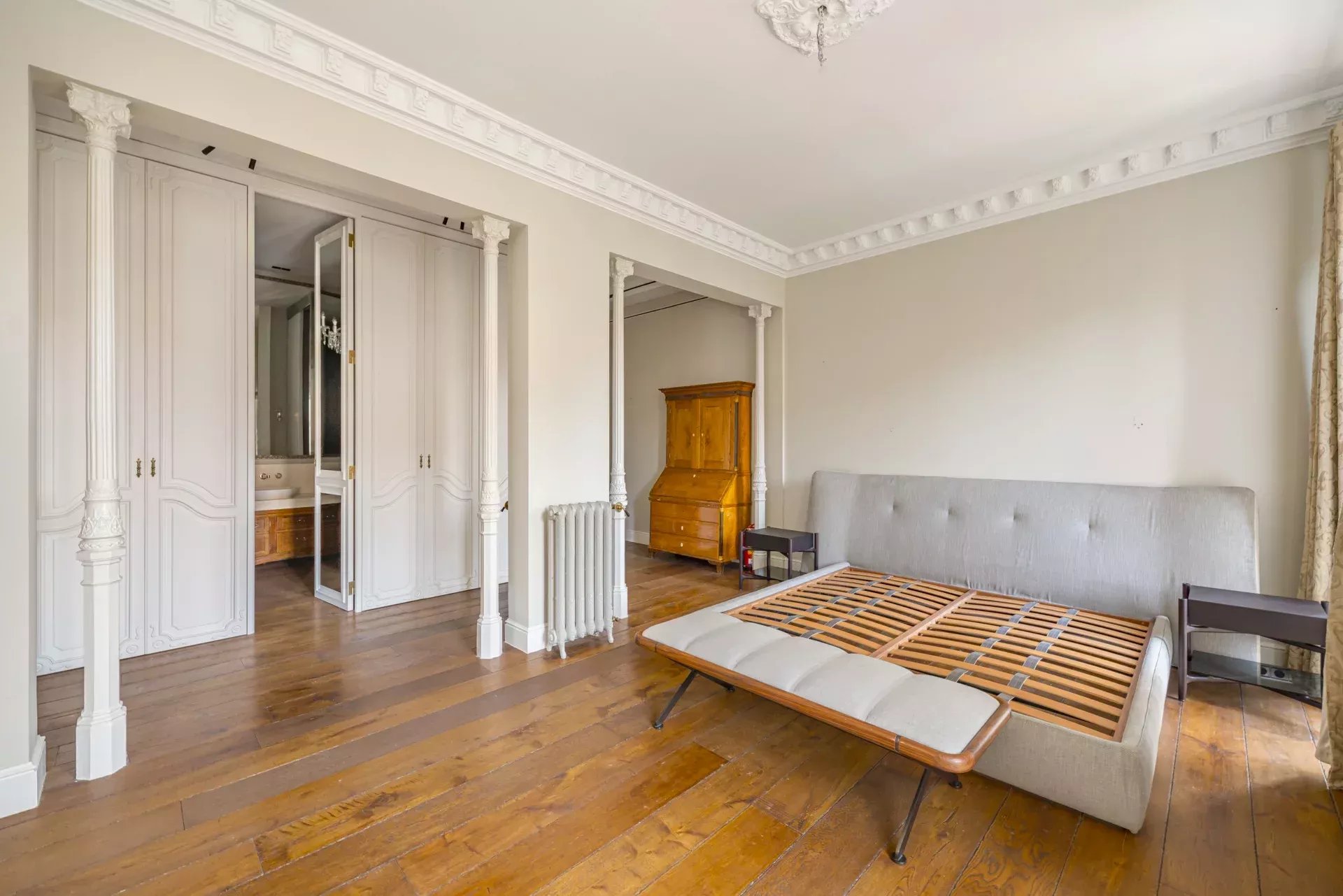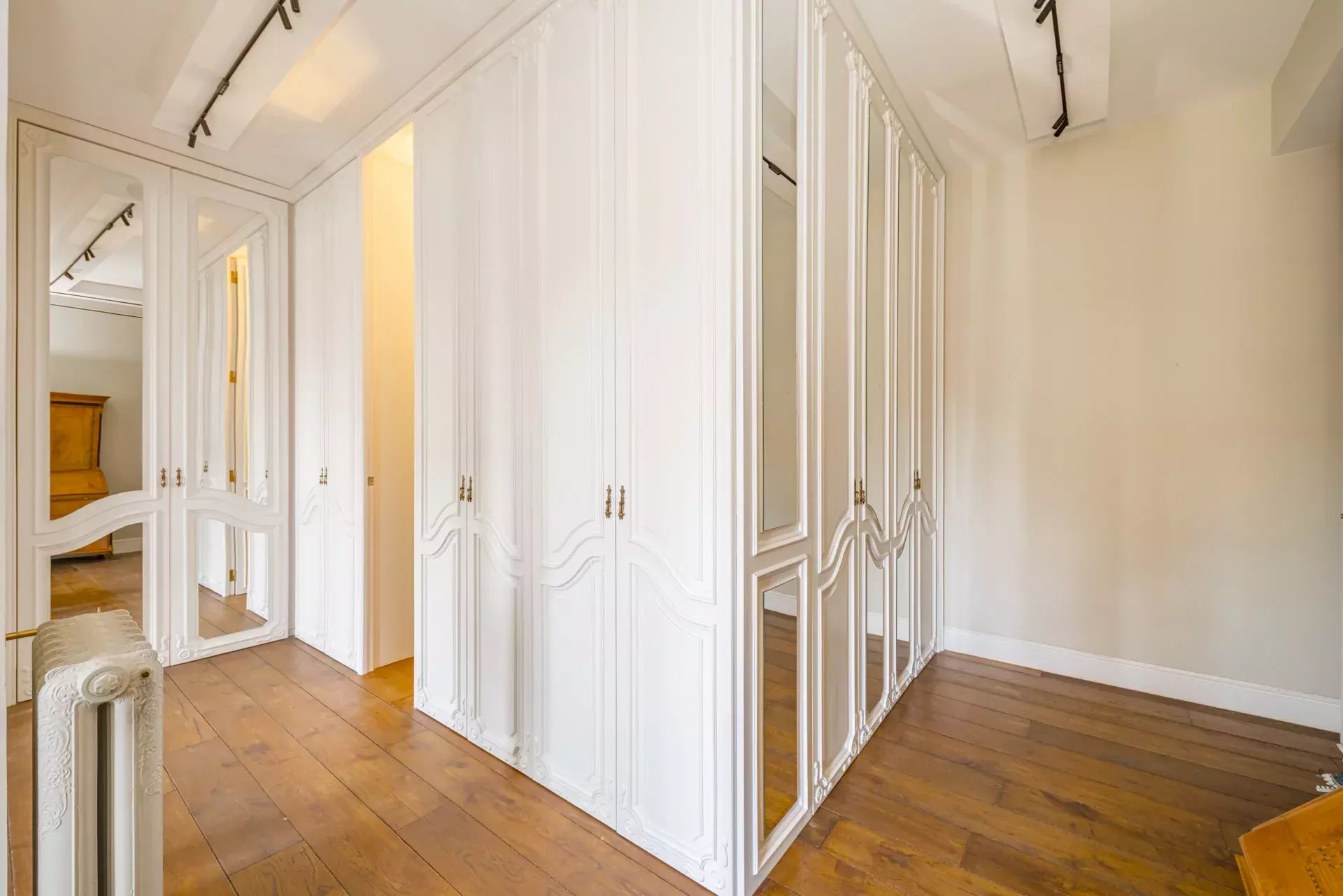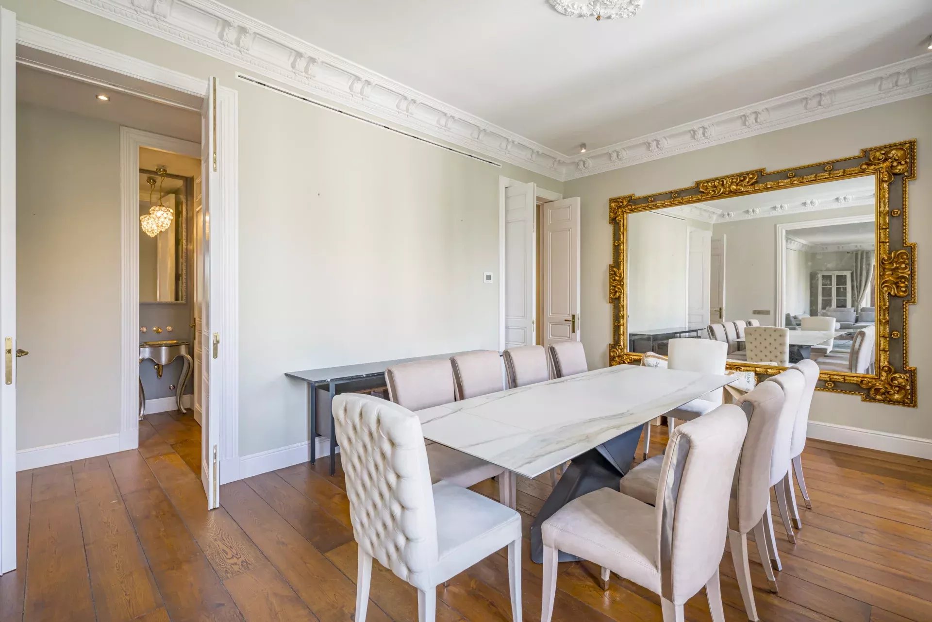 La propriété se compose de deux appartements réunis, offrant une disposition qui distingue clairement les espaces de jour et de nuit.