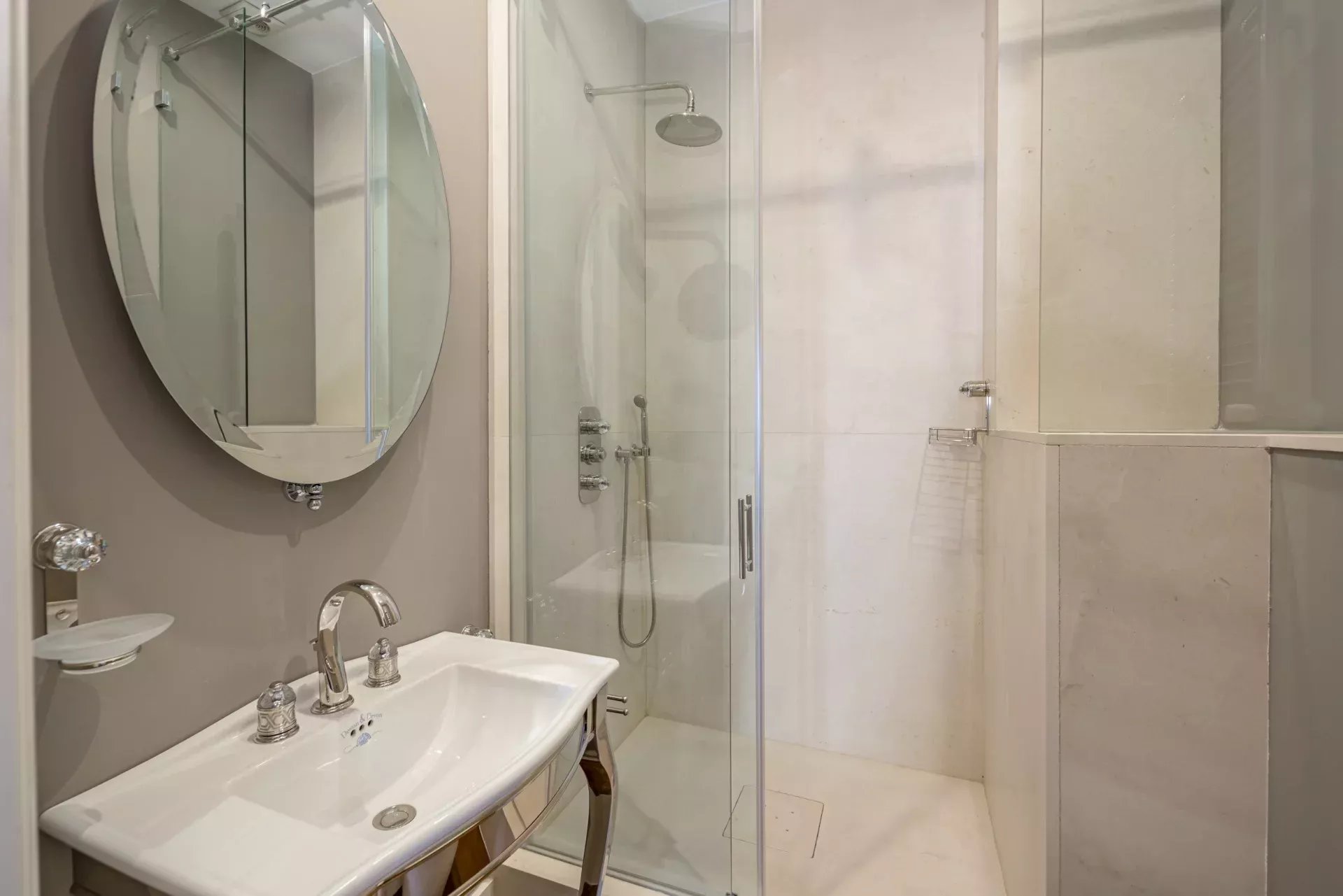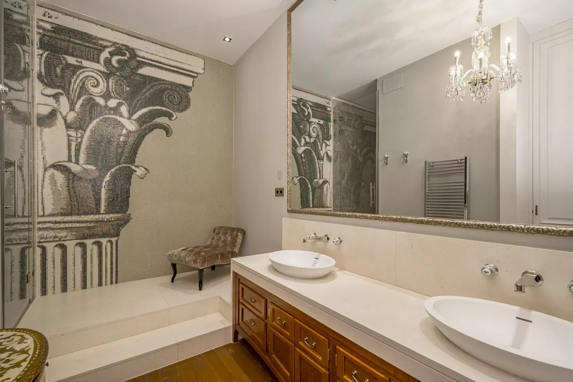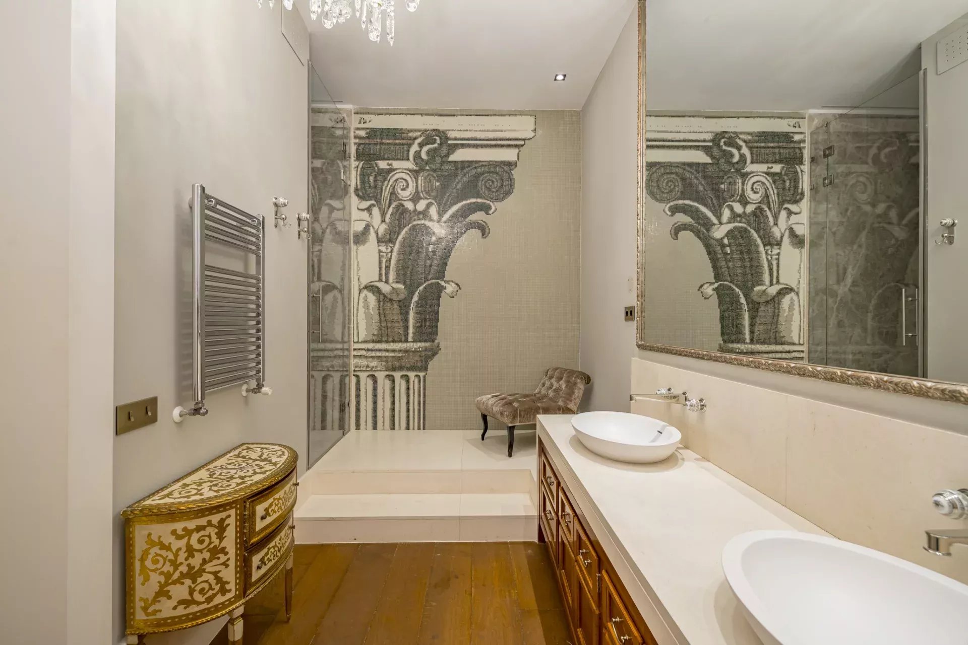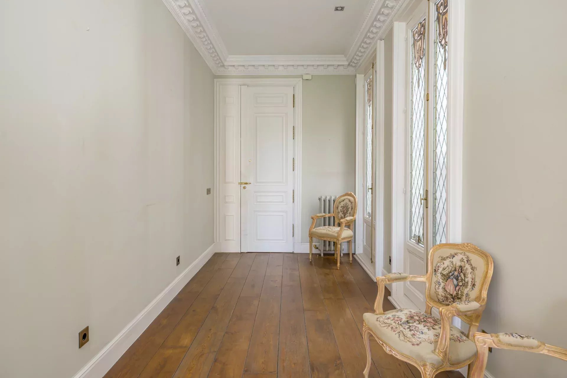 La propriété se compose de deux appartements réunis, offrant une disposition qui distingue clairement les espaces de jour et de nuit.